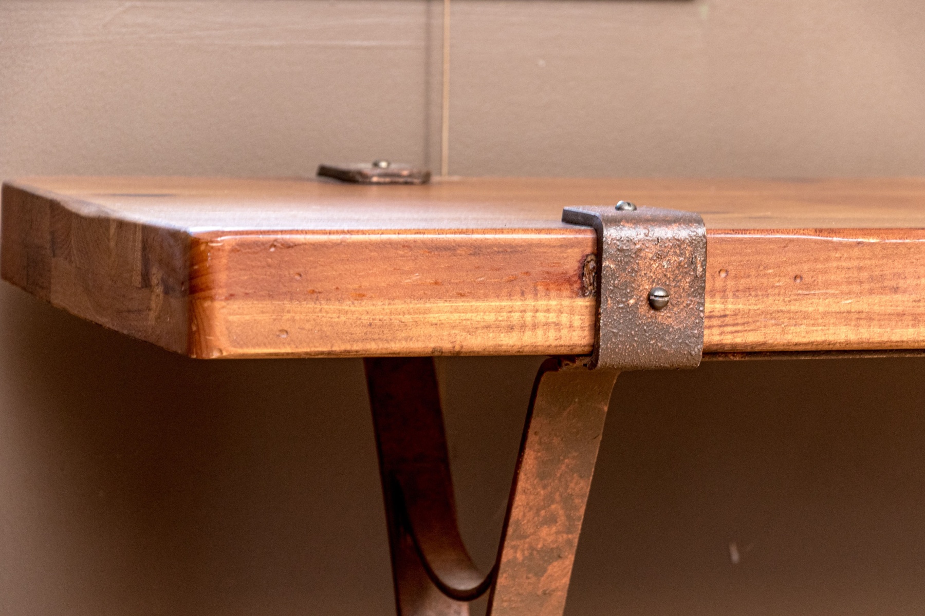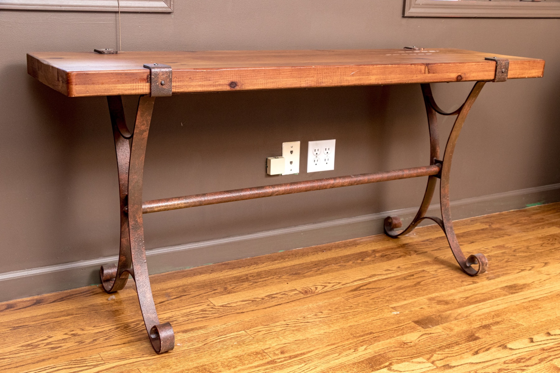A high quality Lane Furniture console table with a stylish touch of Spanish Colonial charm. The table features a 2 1/4" thick rectangular medium brown wood tabletop wrapped at the edges with rustic antiqued riveted brackets leading to dramatic X-form trestle supports with a cylindrical H-stretcher and scrolled feet.