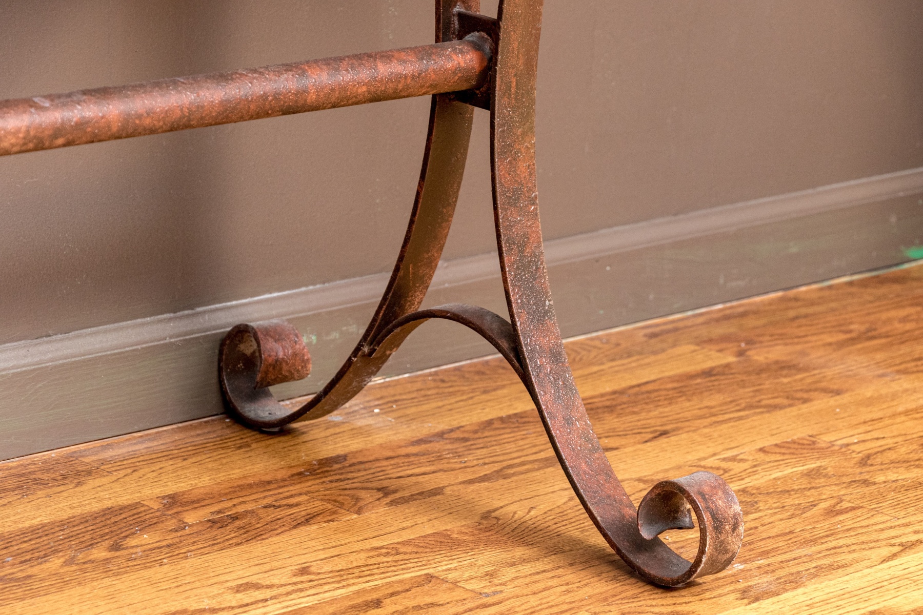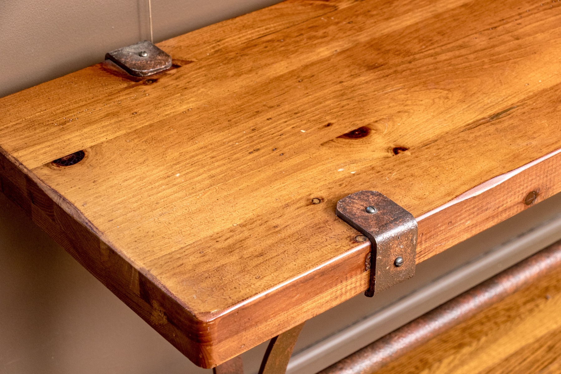 Good overall. Slight sunning and scuffs to table top and finish but overall a great table. Oxidation to the iron base and legs adding to the rustic appeal.
