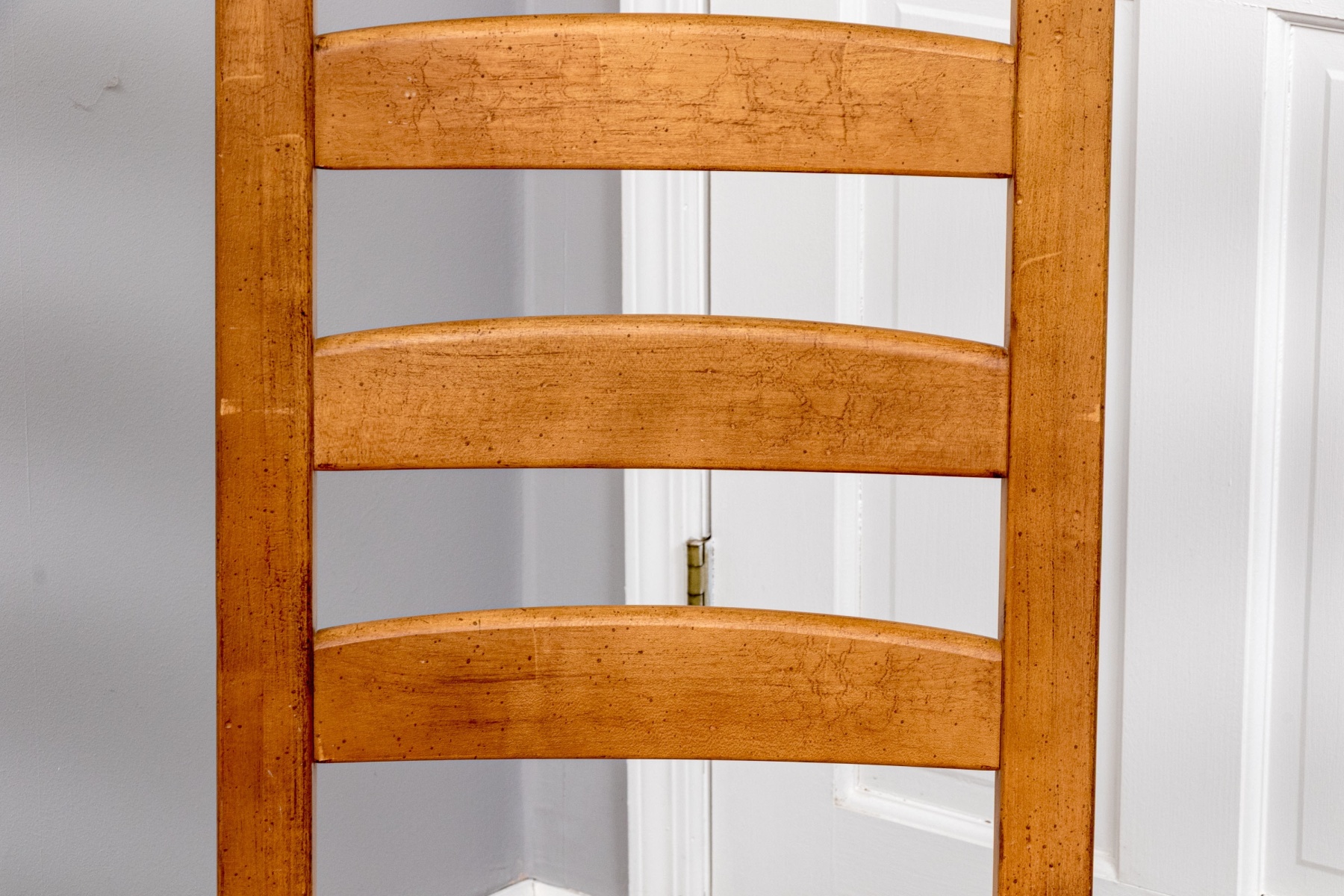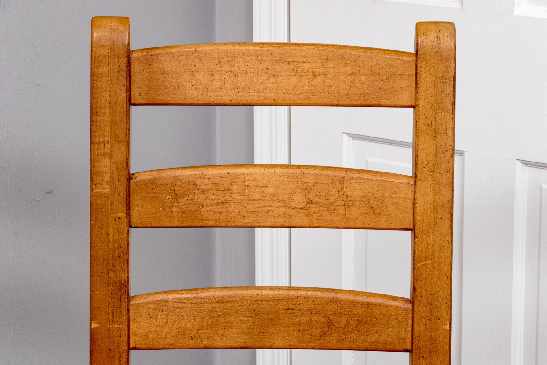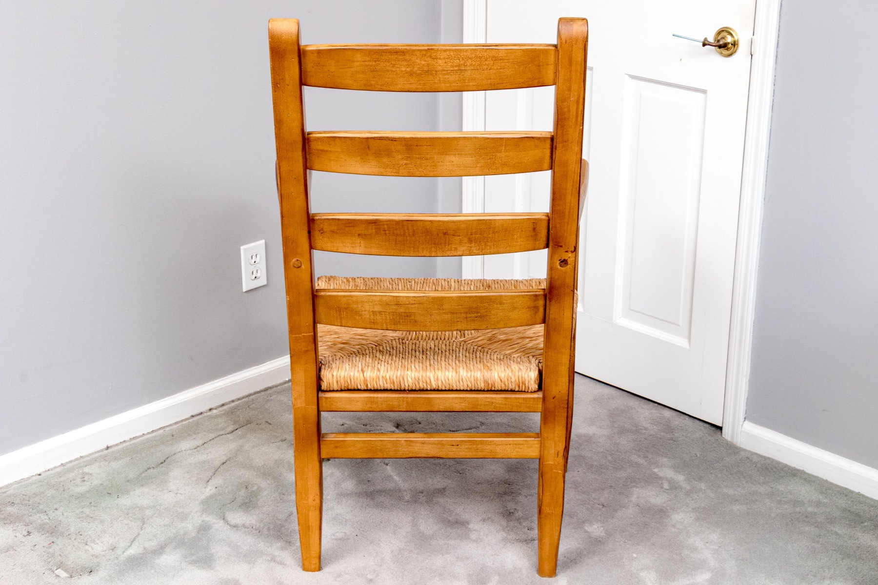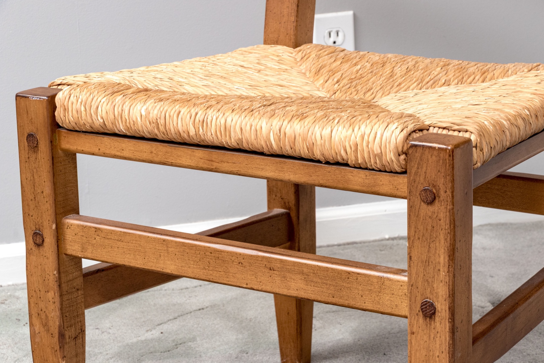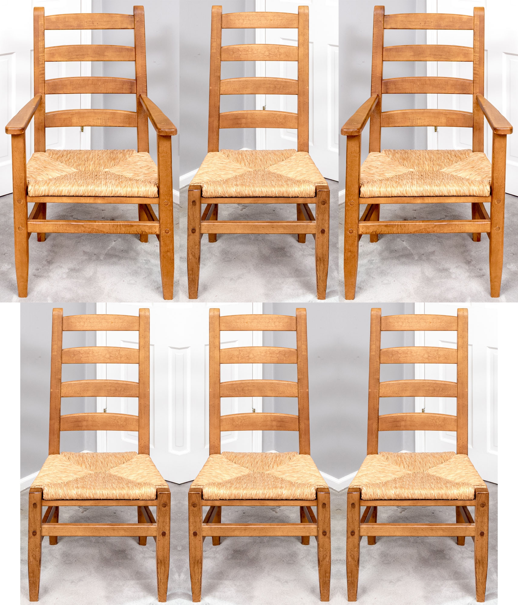 A high quality set of six Lane Furniture French country style dining chairs including two armchairs and four side chairs. Each chair features classic honeyed brown ladder backs and woven rush seats, raised on straight and tapered legs with wonderful mortise and tenon joinery and box stretchers.