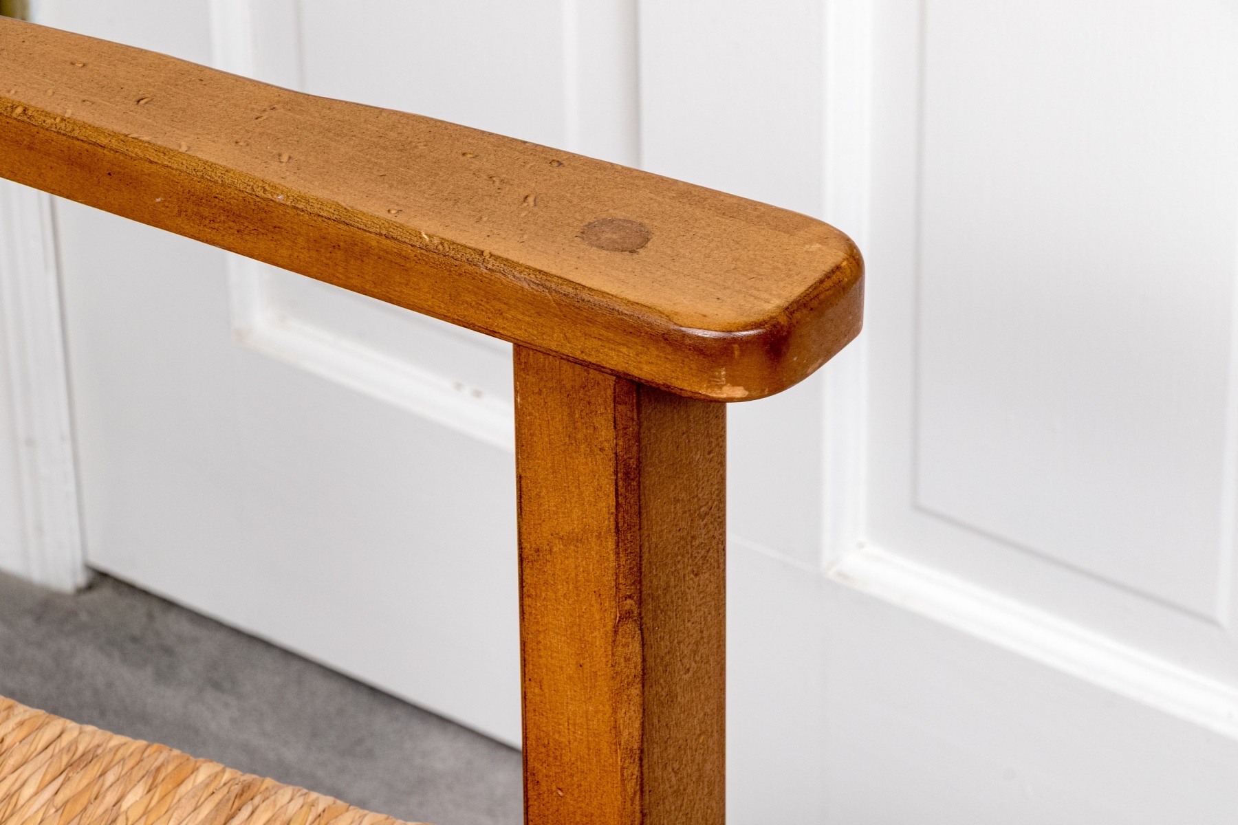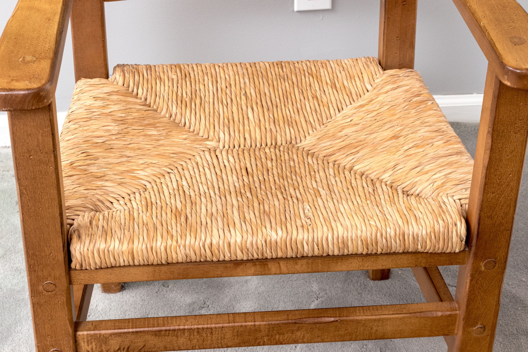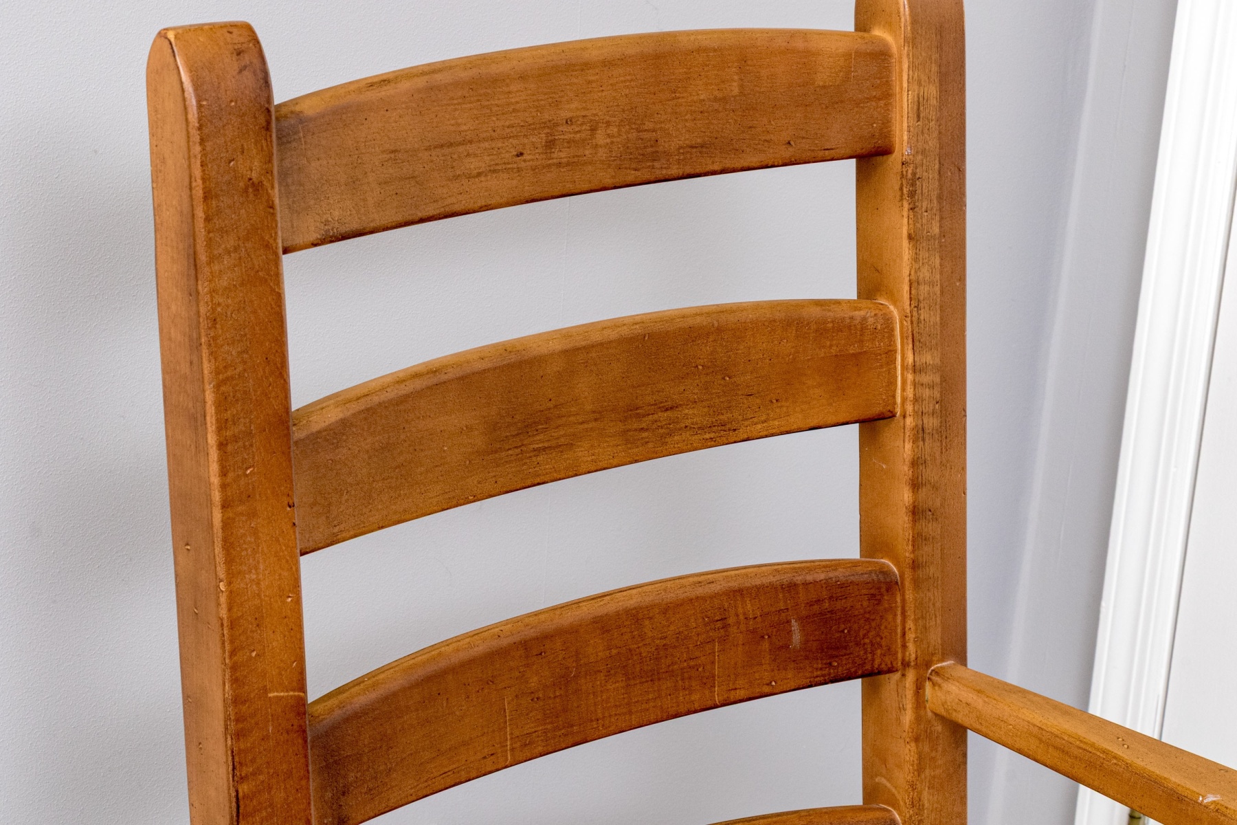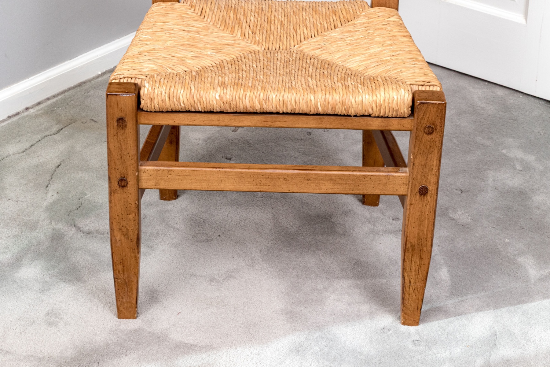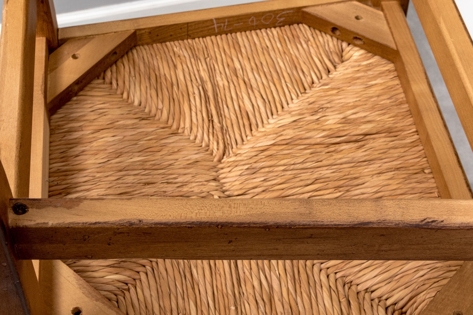 A high quality set of six Lane Furniture French country style dining chairs including two armchairs and four side chairs. Each chair features classic honeyed brown ladder backs and woven rush seats, raised on straight and tapered legs with wonderful mortise and tenon joinery and box stretchers.