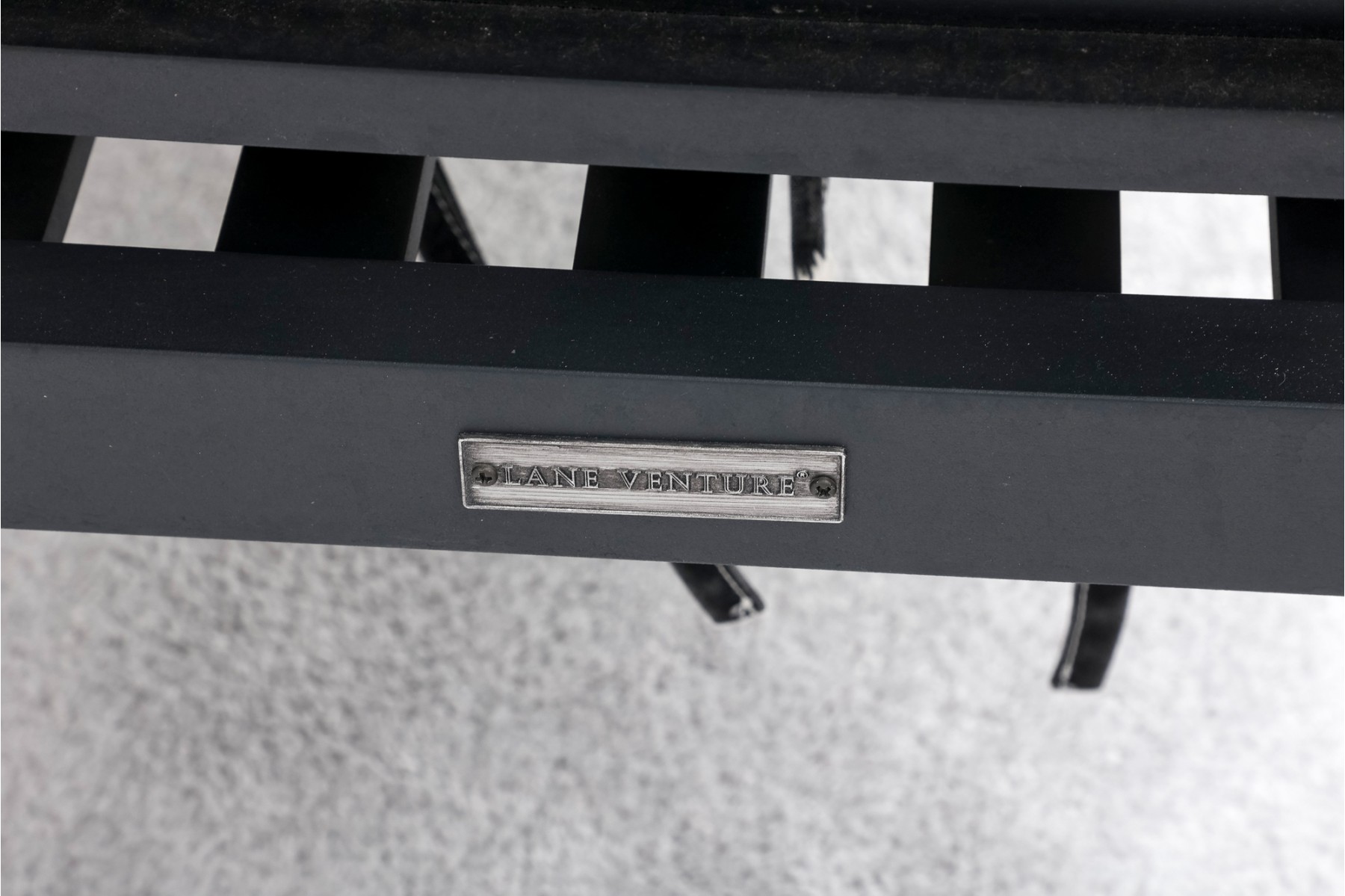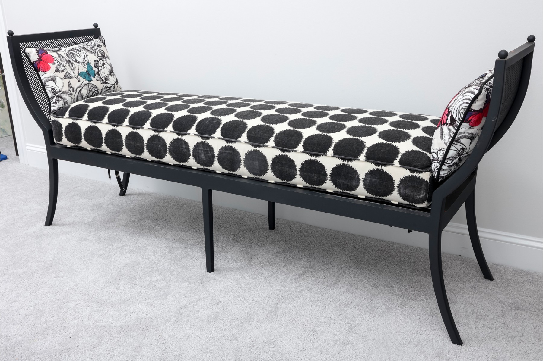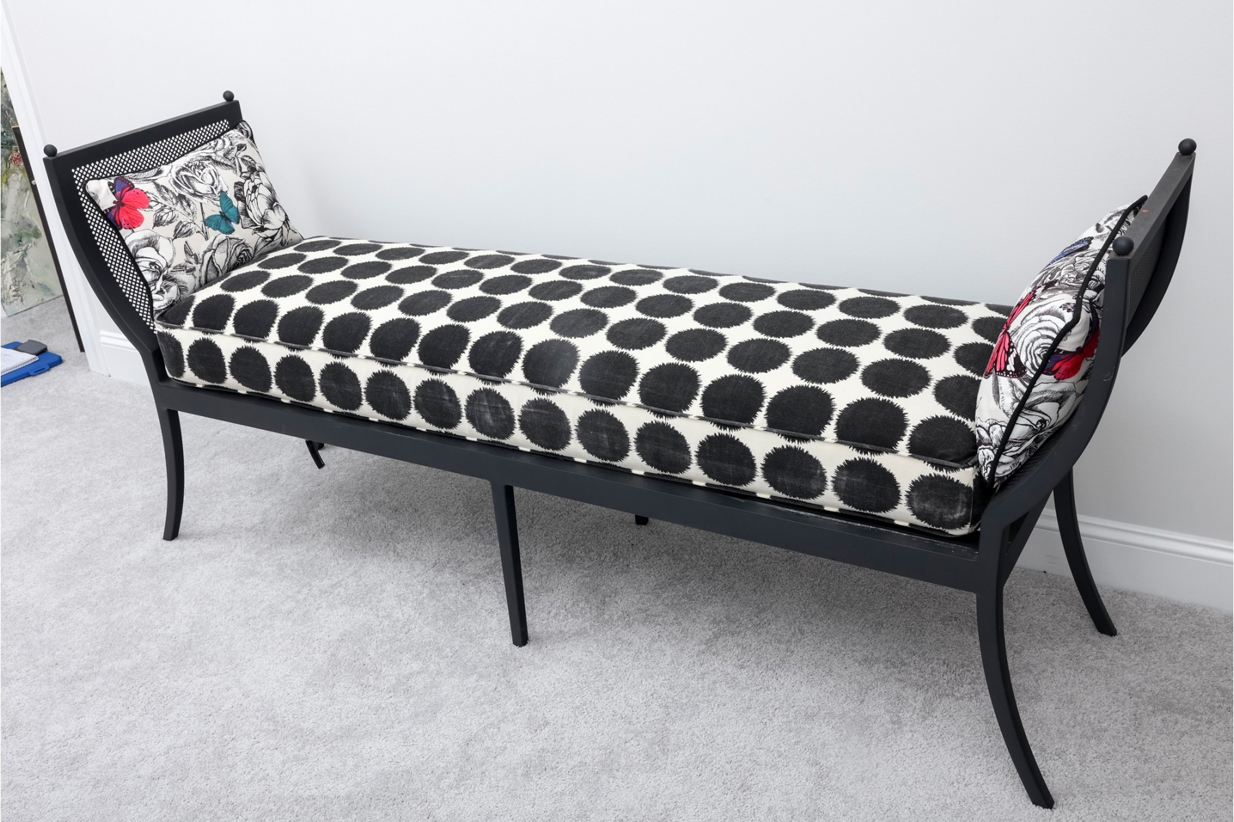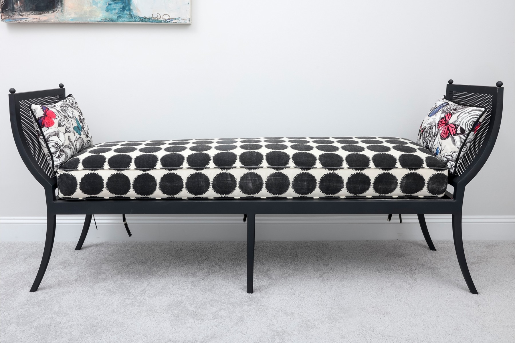 Lane Venture bench in black, displaying an elegant form with bowed pierced arms and a slat seat topped with a white and black polka dot cushion with butterfly motif accent pillows.