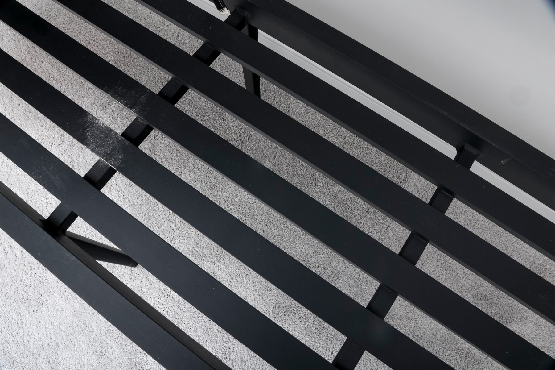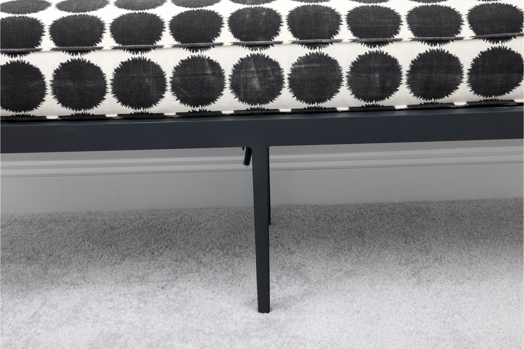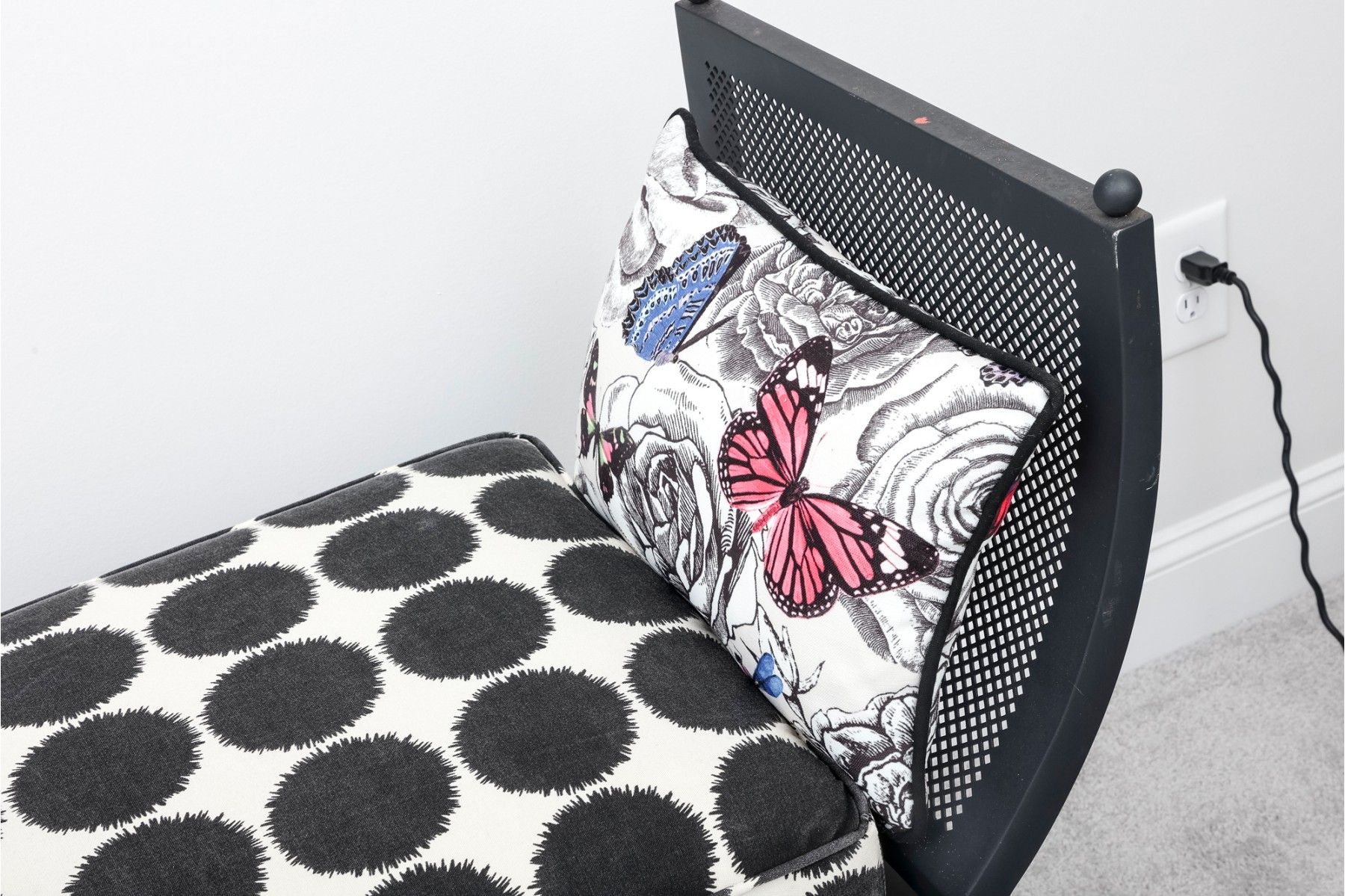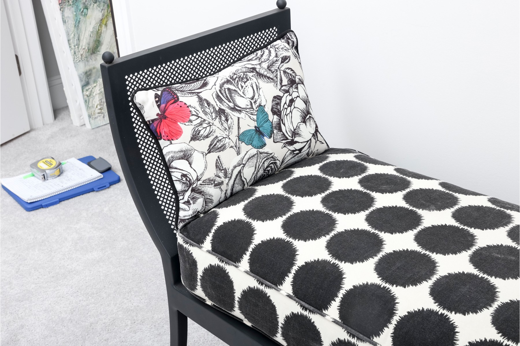 Lane Venture bench in black, displaying an elegant form with bowed pierced arms and a slat seat topped with a white and black polka dot cushion with butterfly motif accent pillows.