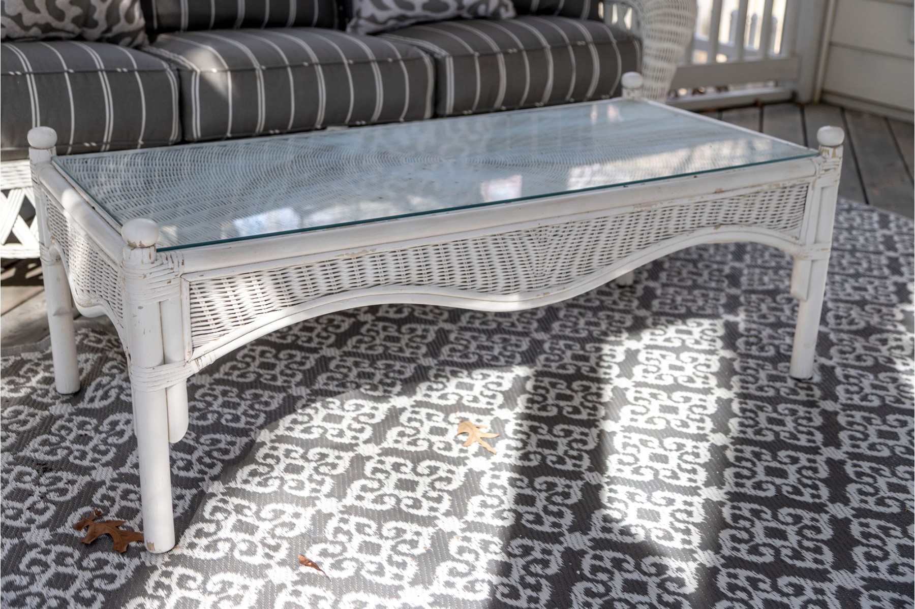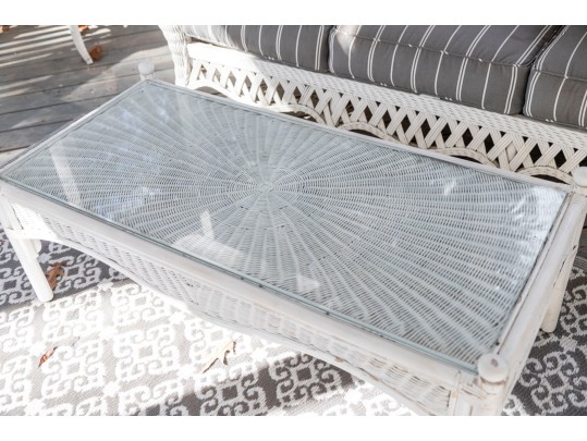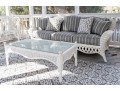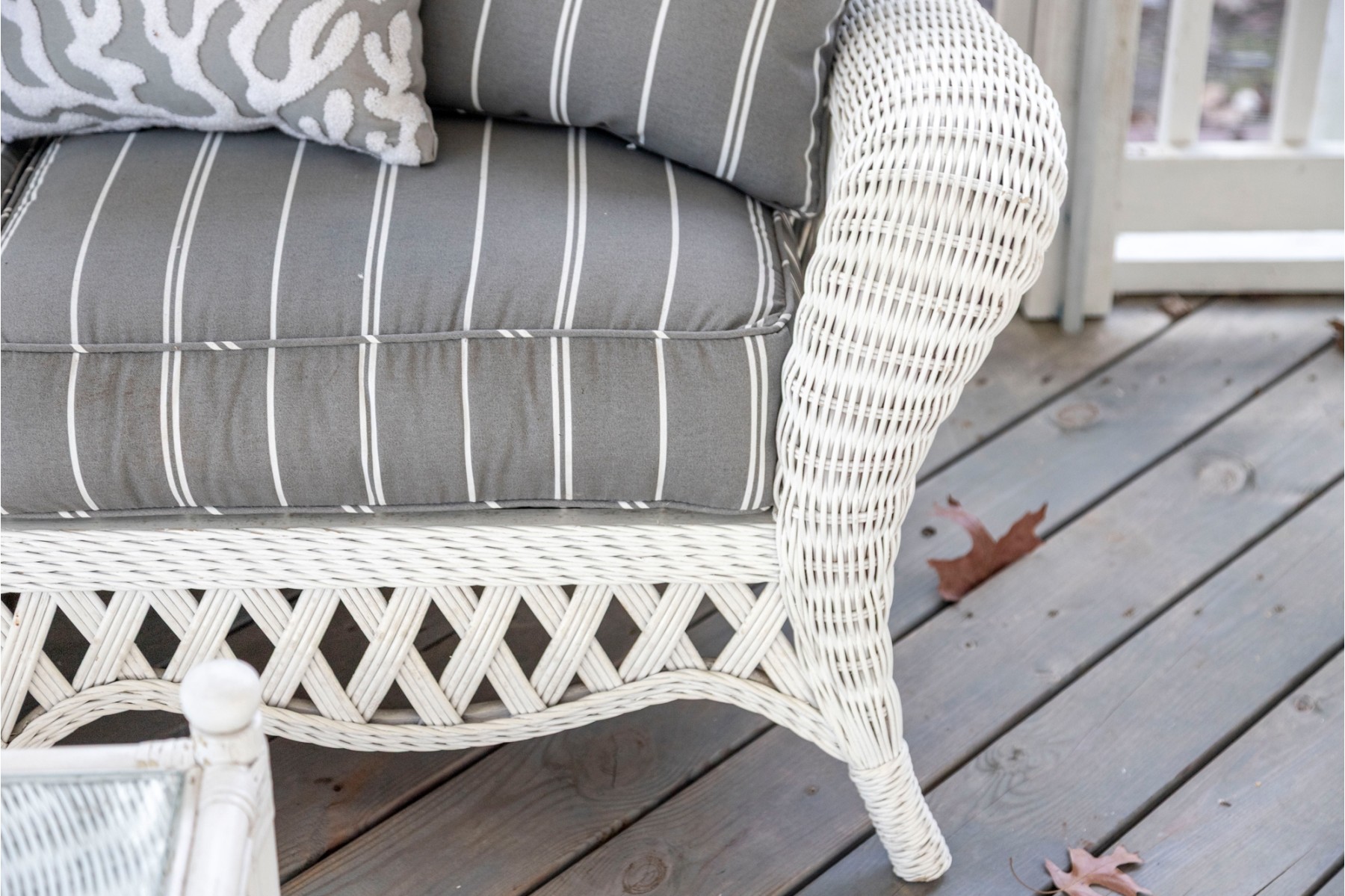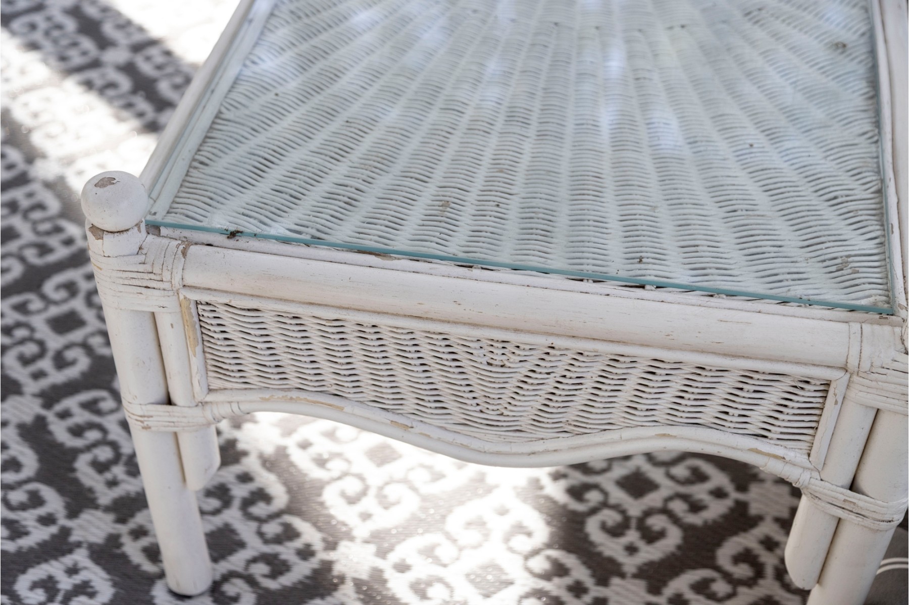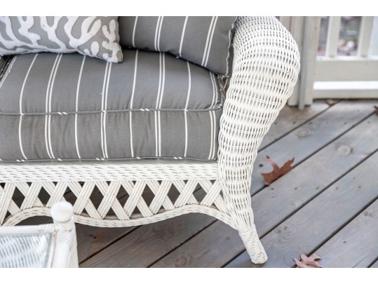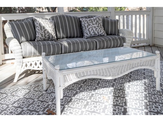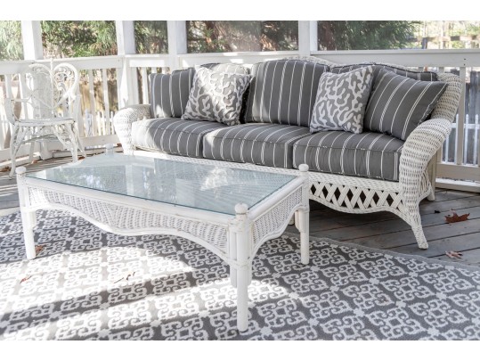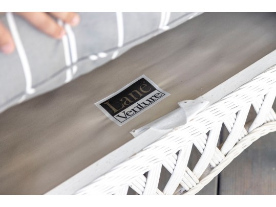 This Lane Venture white wicker patio sofa and matching glass-top table offers the perfect outdoor set. The sofa features a sturdy yet lightweight wicker frame, finished in a crisp white for a timeless, coastal-inspired look.