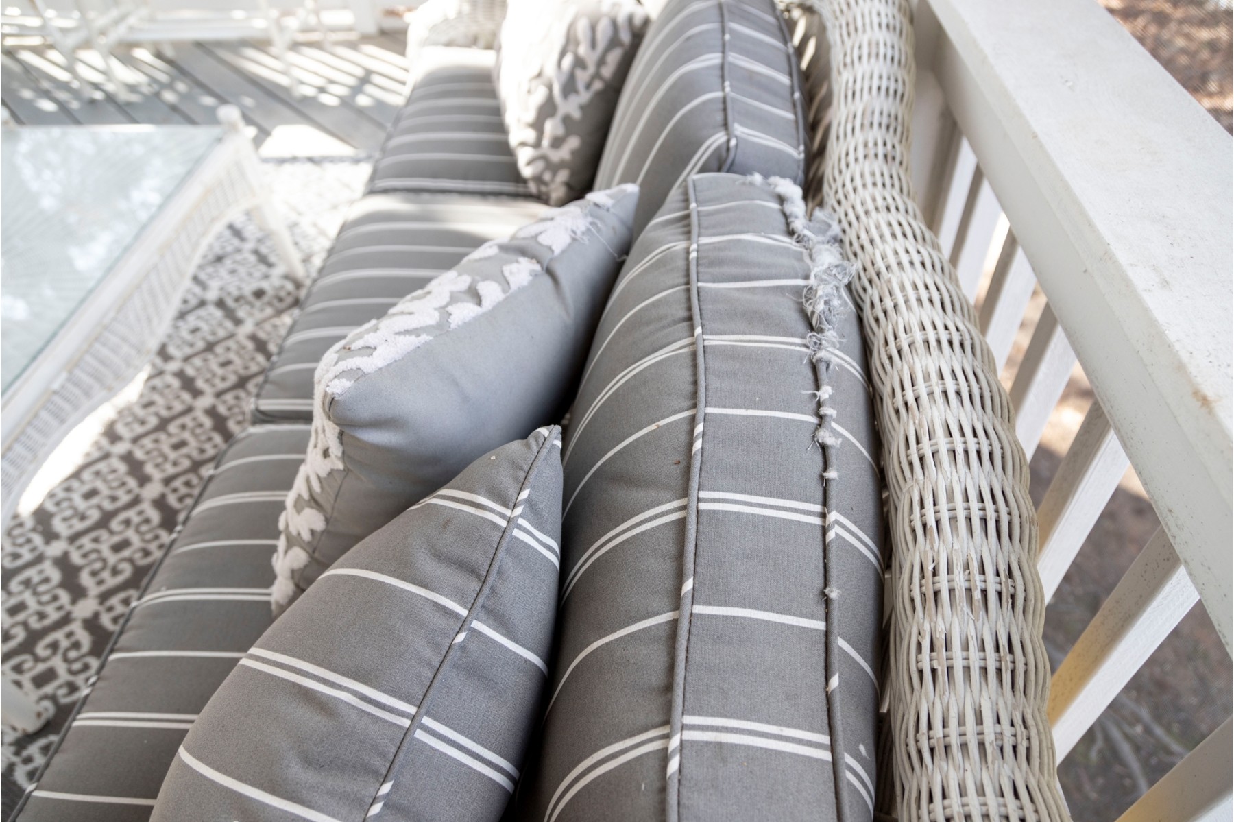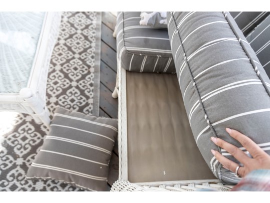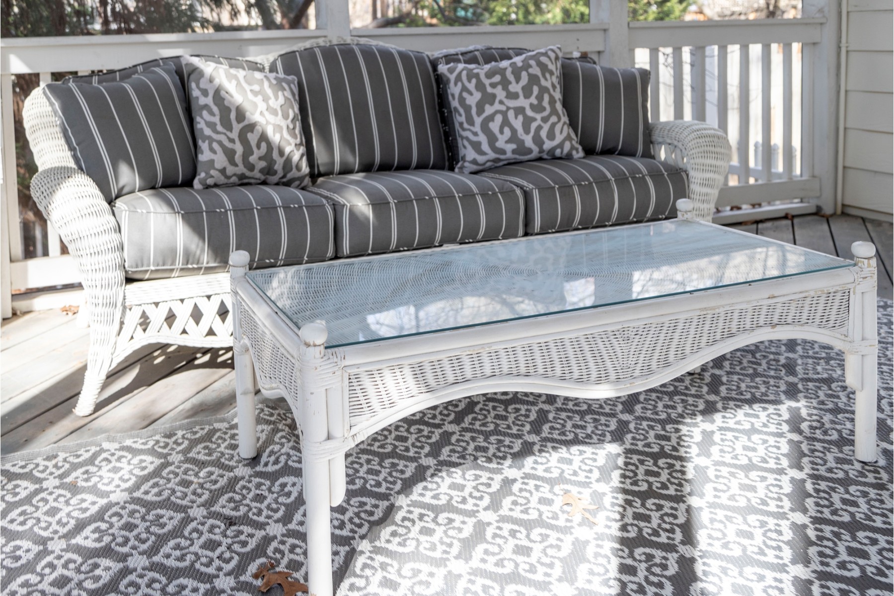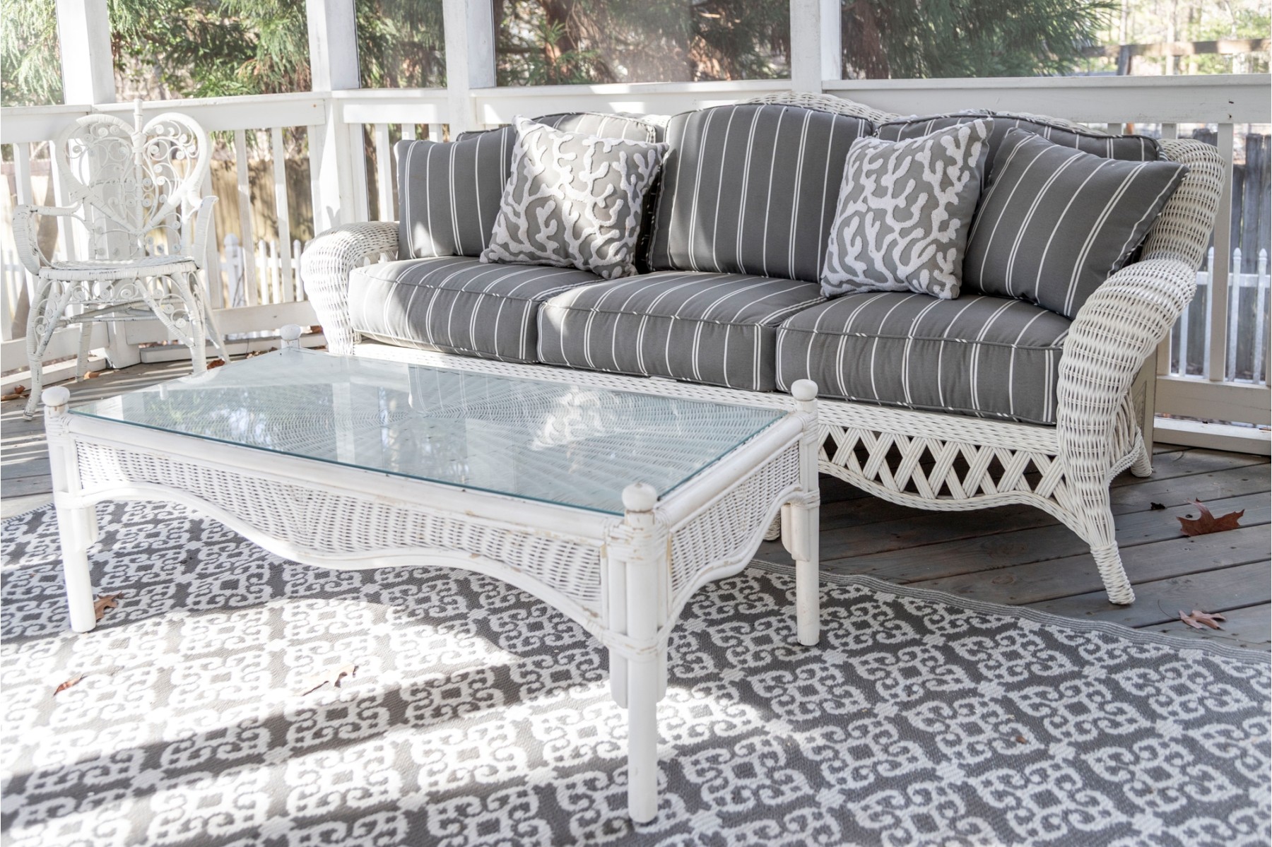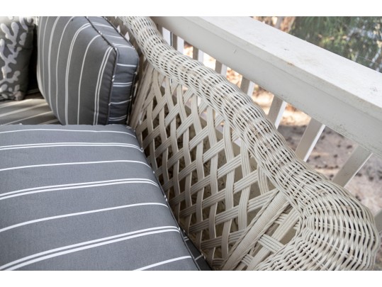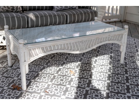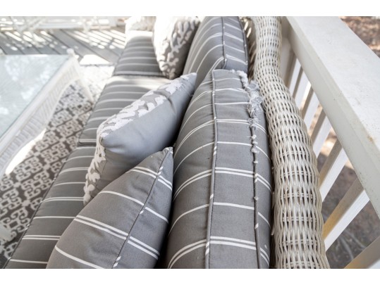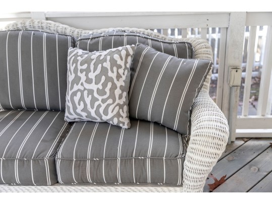 This Lane Venture white wicker patio sofa and matching glass-top table offers the perfect outdoor set. The sofa features a sturdy yet lightweight wicker frame, finished in a crisp white for a timeless, coastal-inspired look.