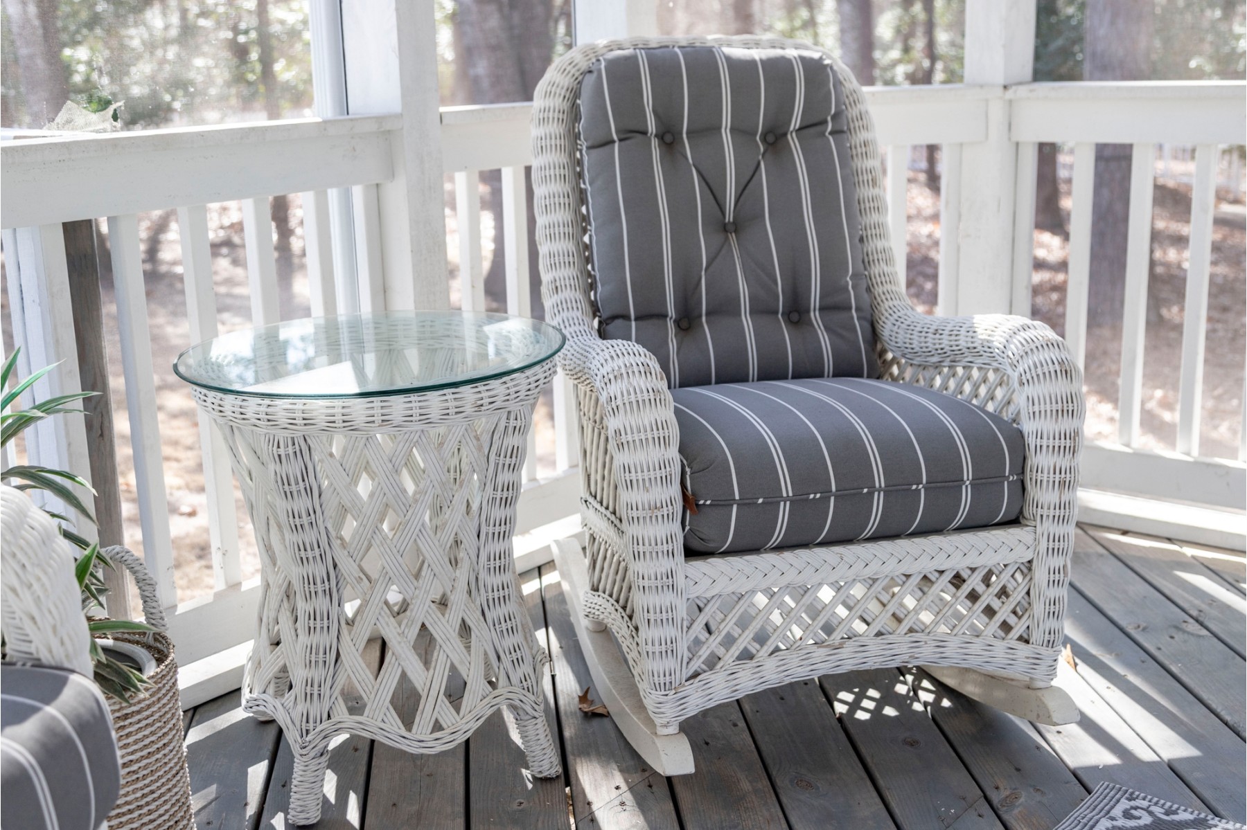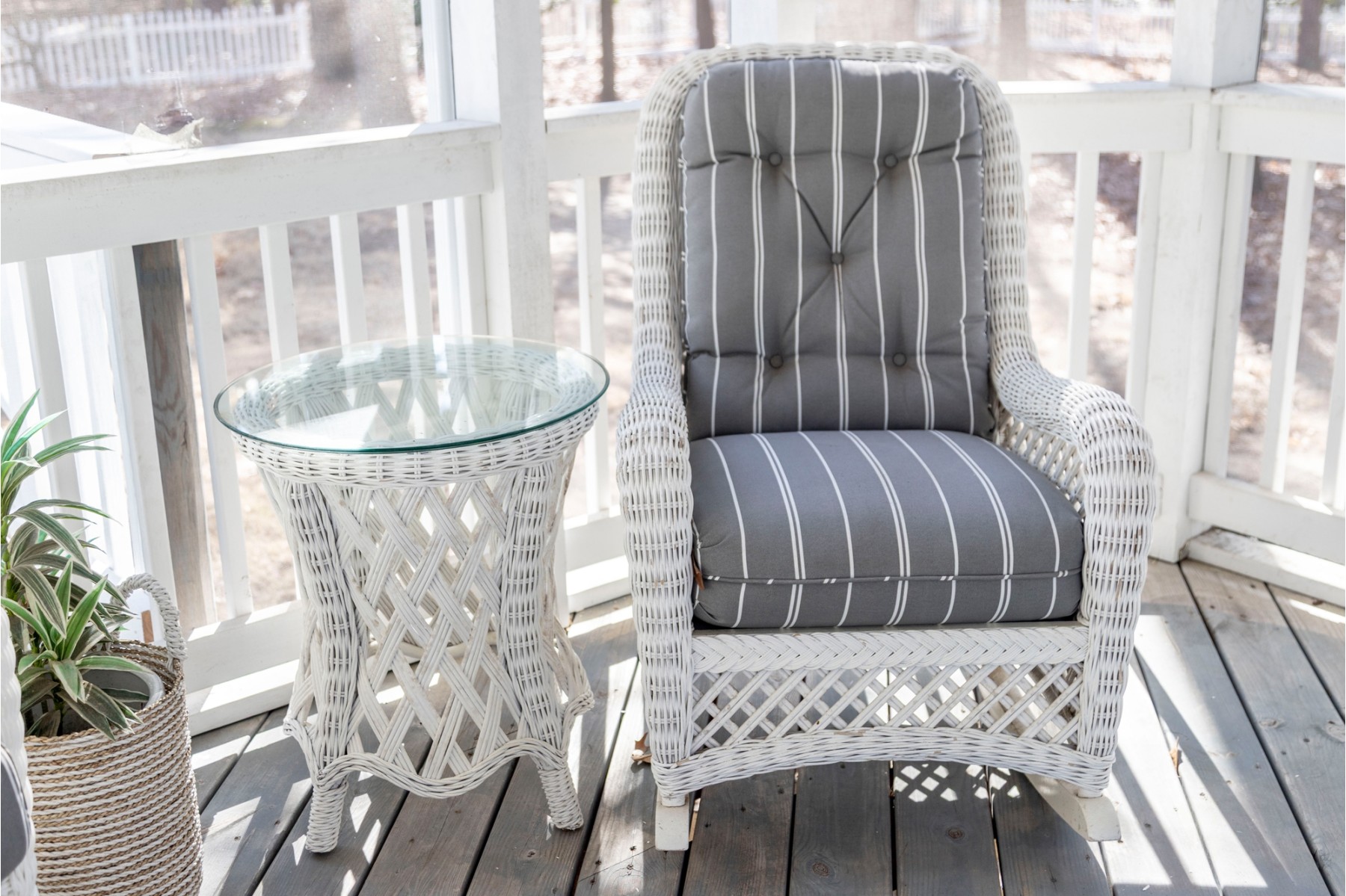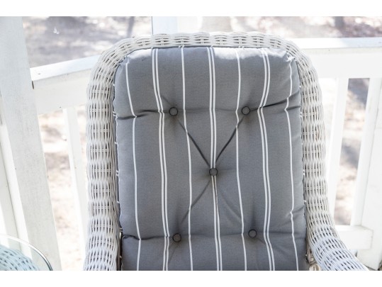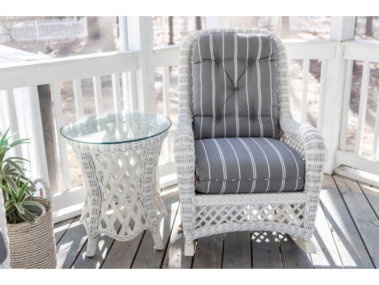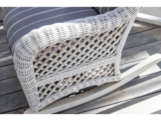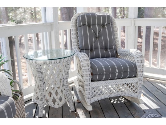 A Lane Furniture rocking chair and side table from the "Venture" collection, sporting white weather-resistant wicker frames in white, complete with gray/white striped cushions.
