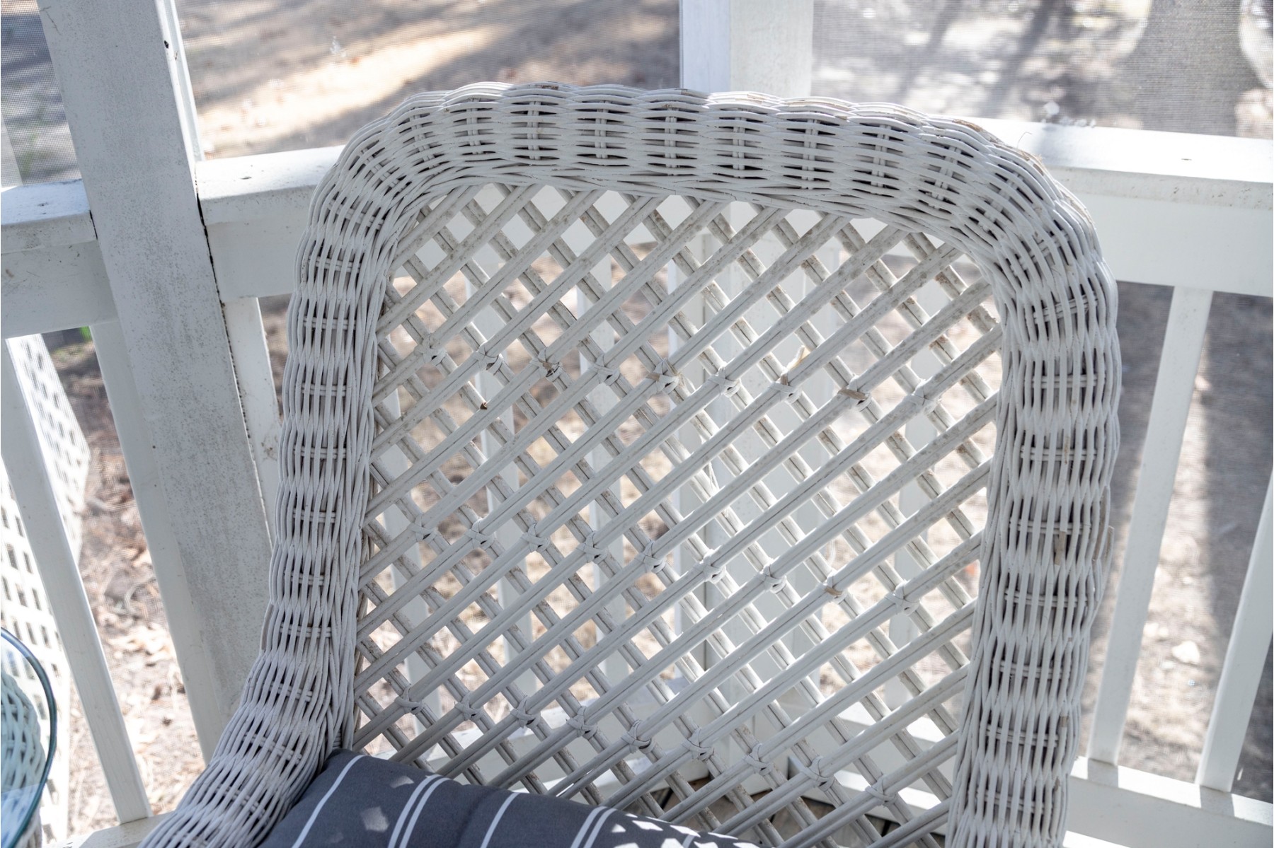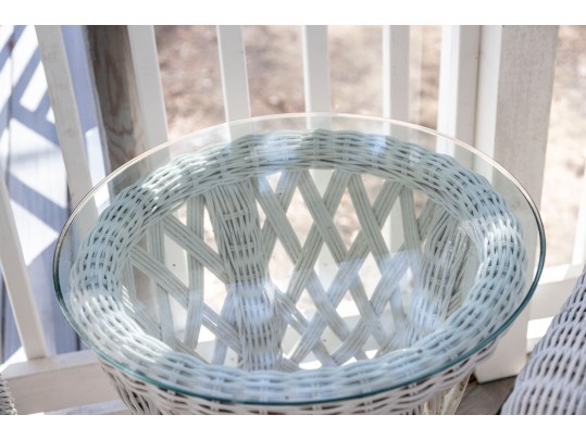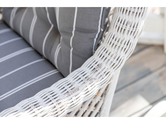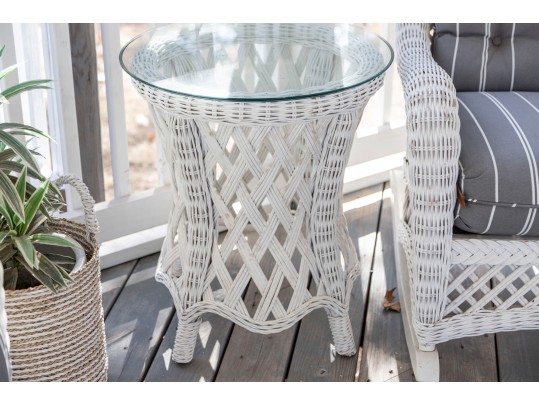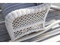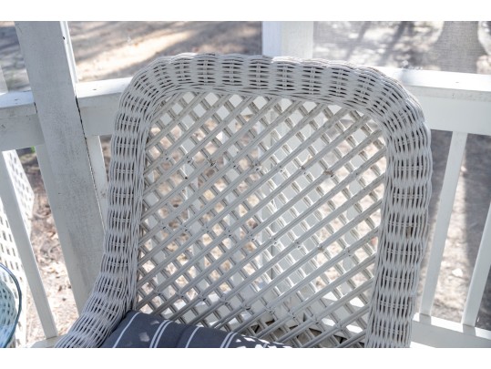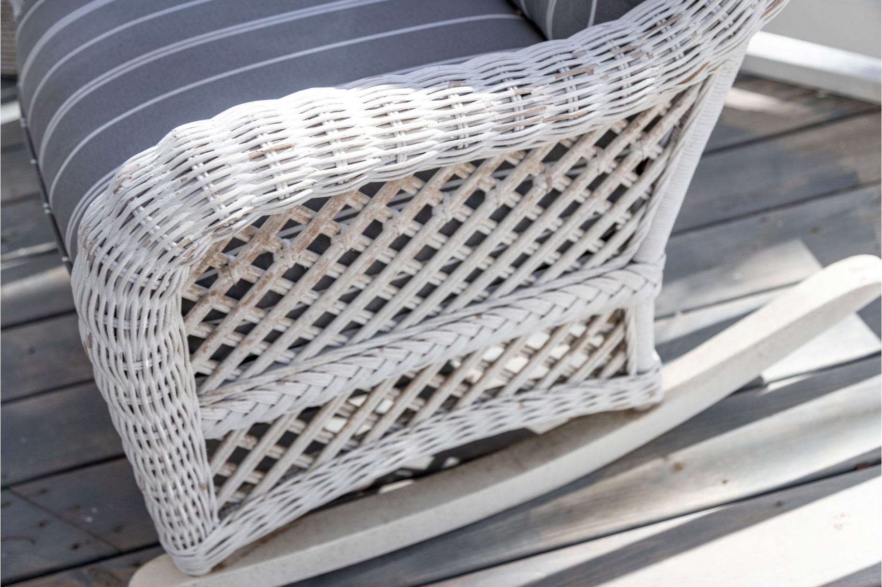 A Lane Furniture rocking chair and side table from the "Venture" collection, sporting white weather-resistant wicker frames in white, complete with gray/white striped cushions.