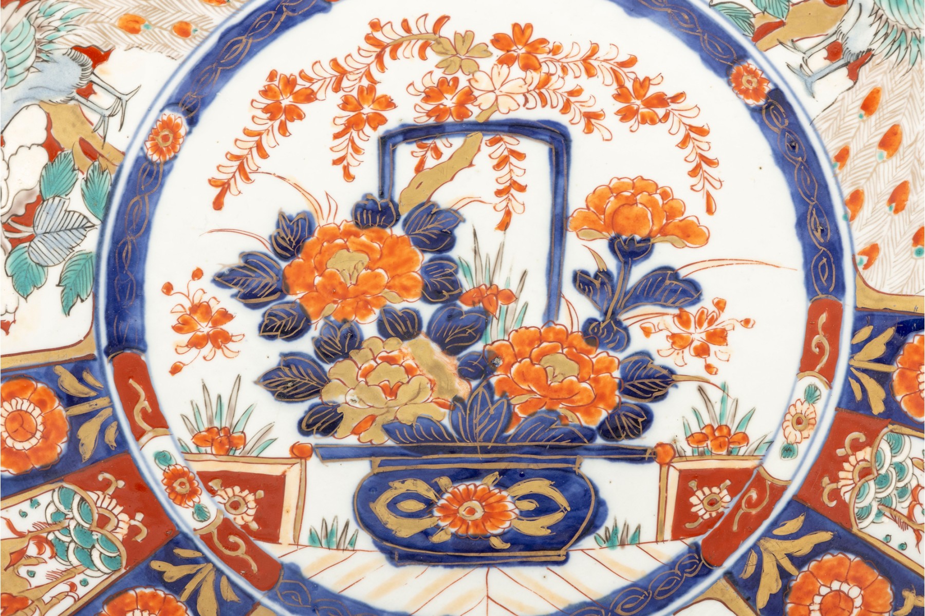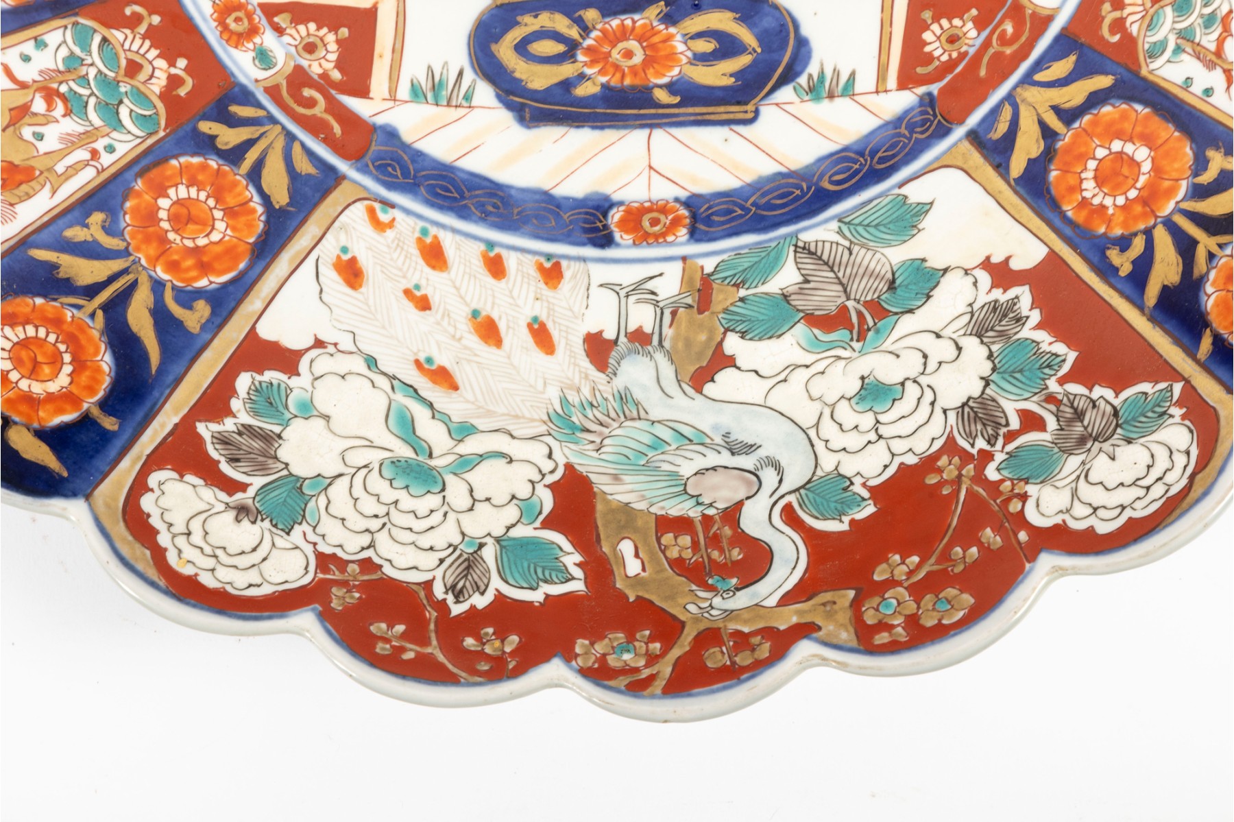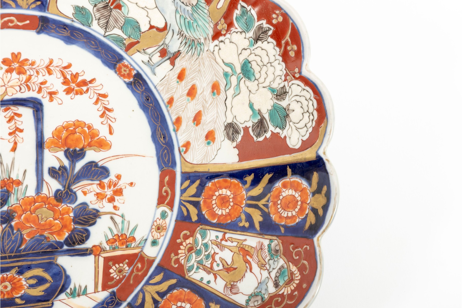 Beautiful Imari porcelain — colorful with gold painted accents, a central floral motif and ornately decorated peacock panels. Circa 19th century. No markings present.