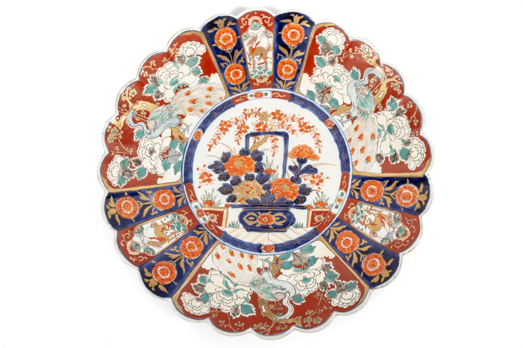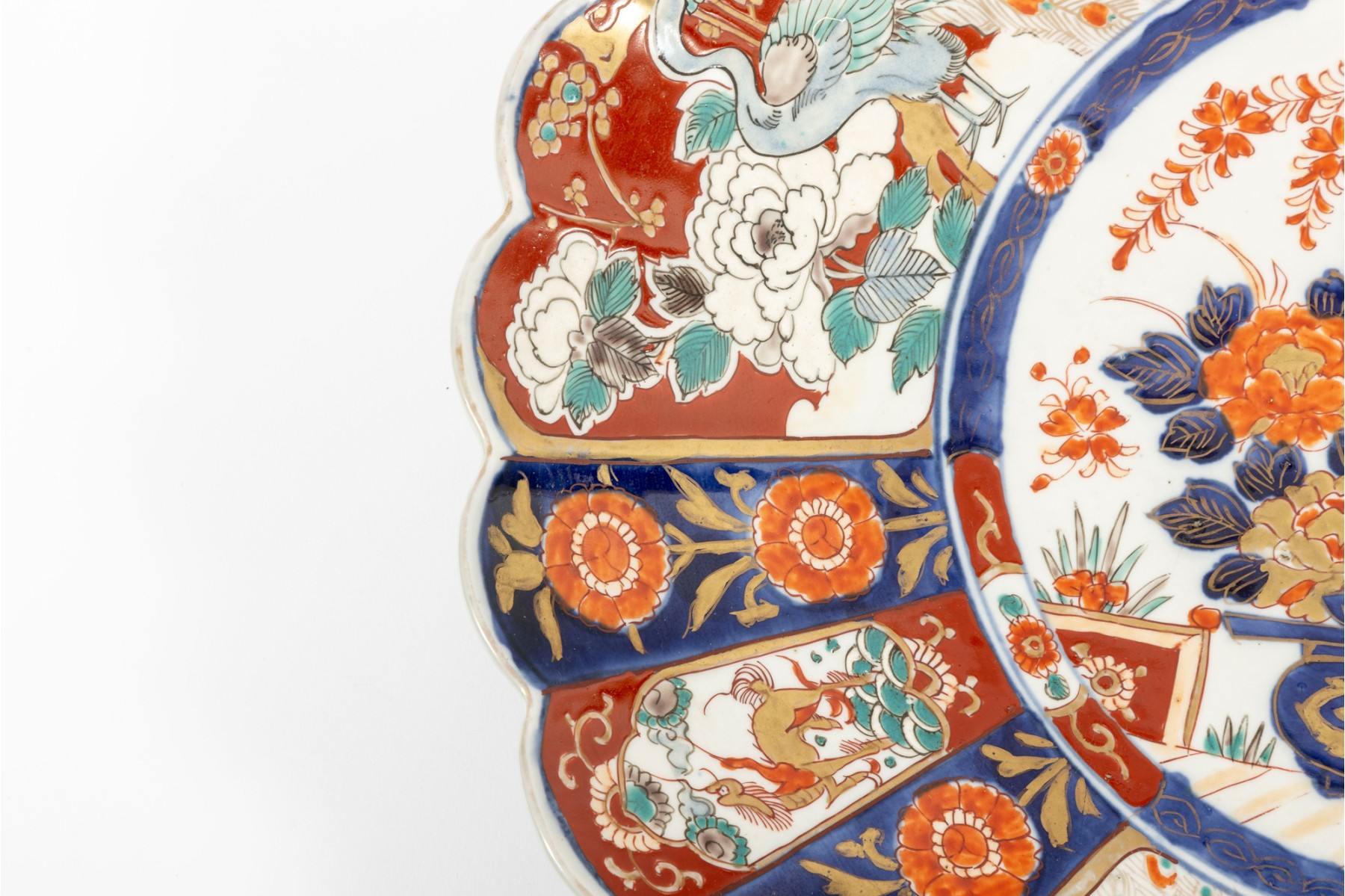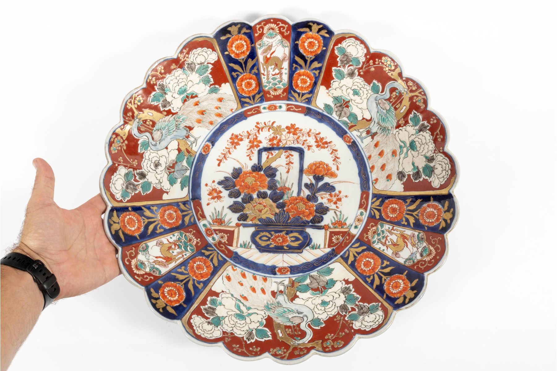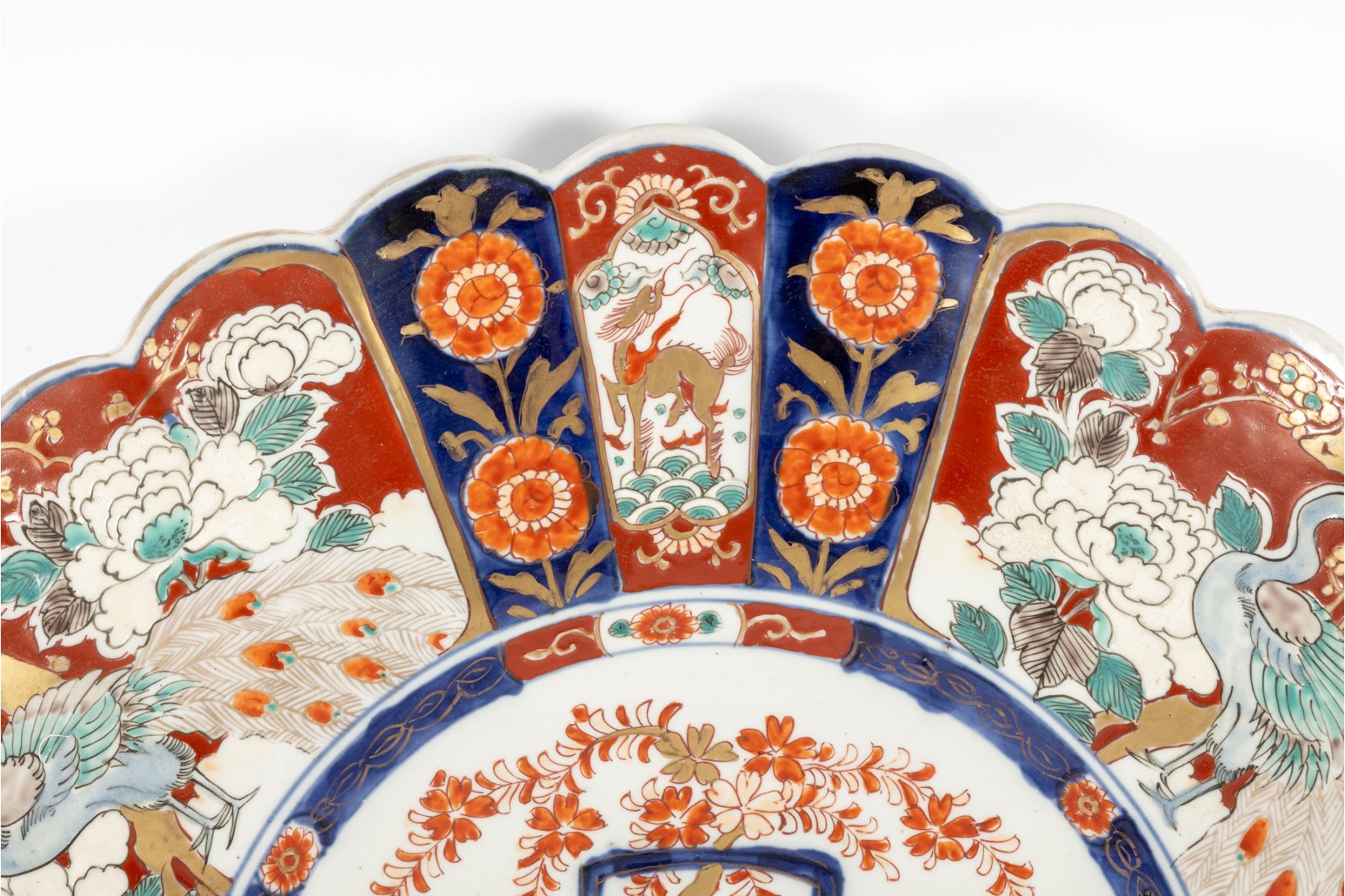 Beautiful Imari porcelain — colorful with gold painted accents, a central floral motif and ornately decorated peacock panels. Circa 19th century. No markings present.