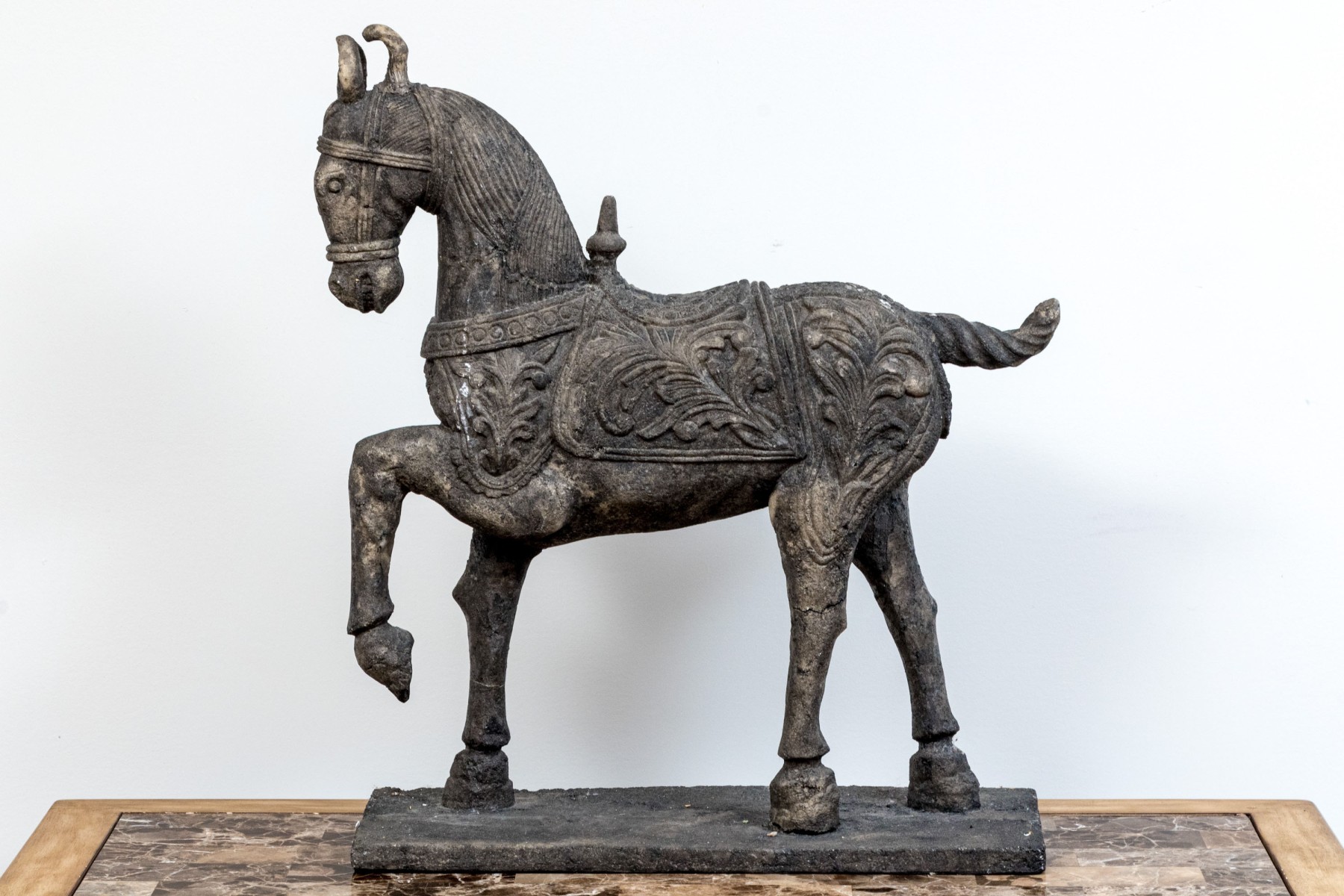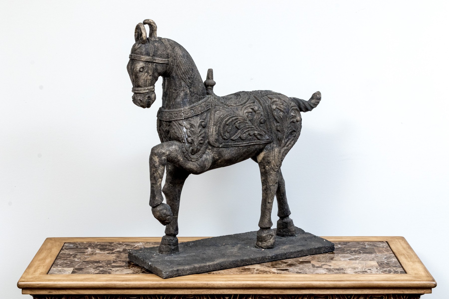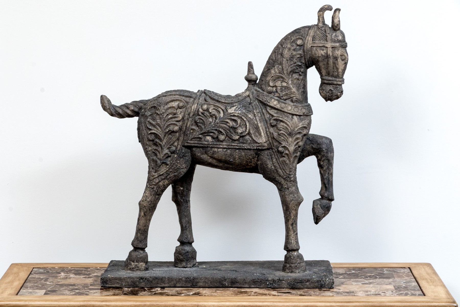 Presented on a rectangular base, the horse with heavily decorated saddle has a classical, short cropped spiral decorated tail. Its depicted with its front right leg raised.