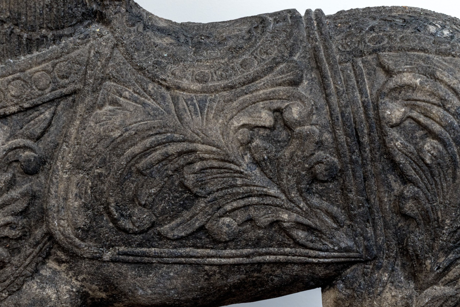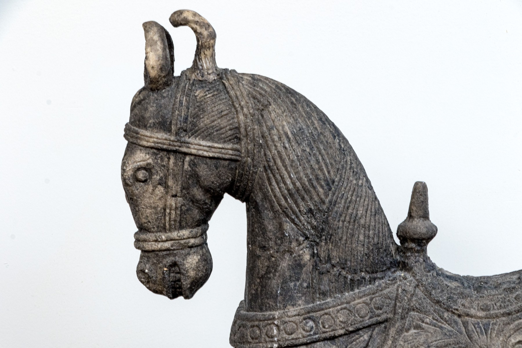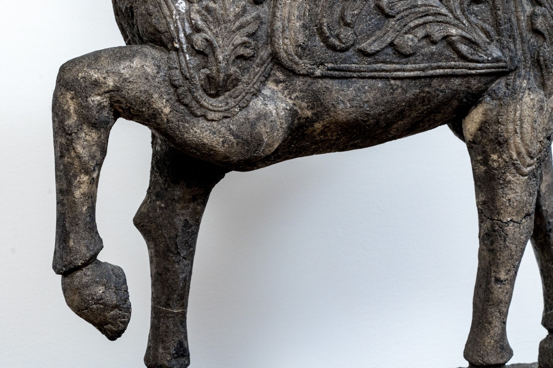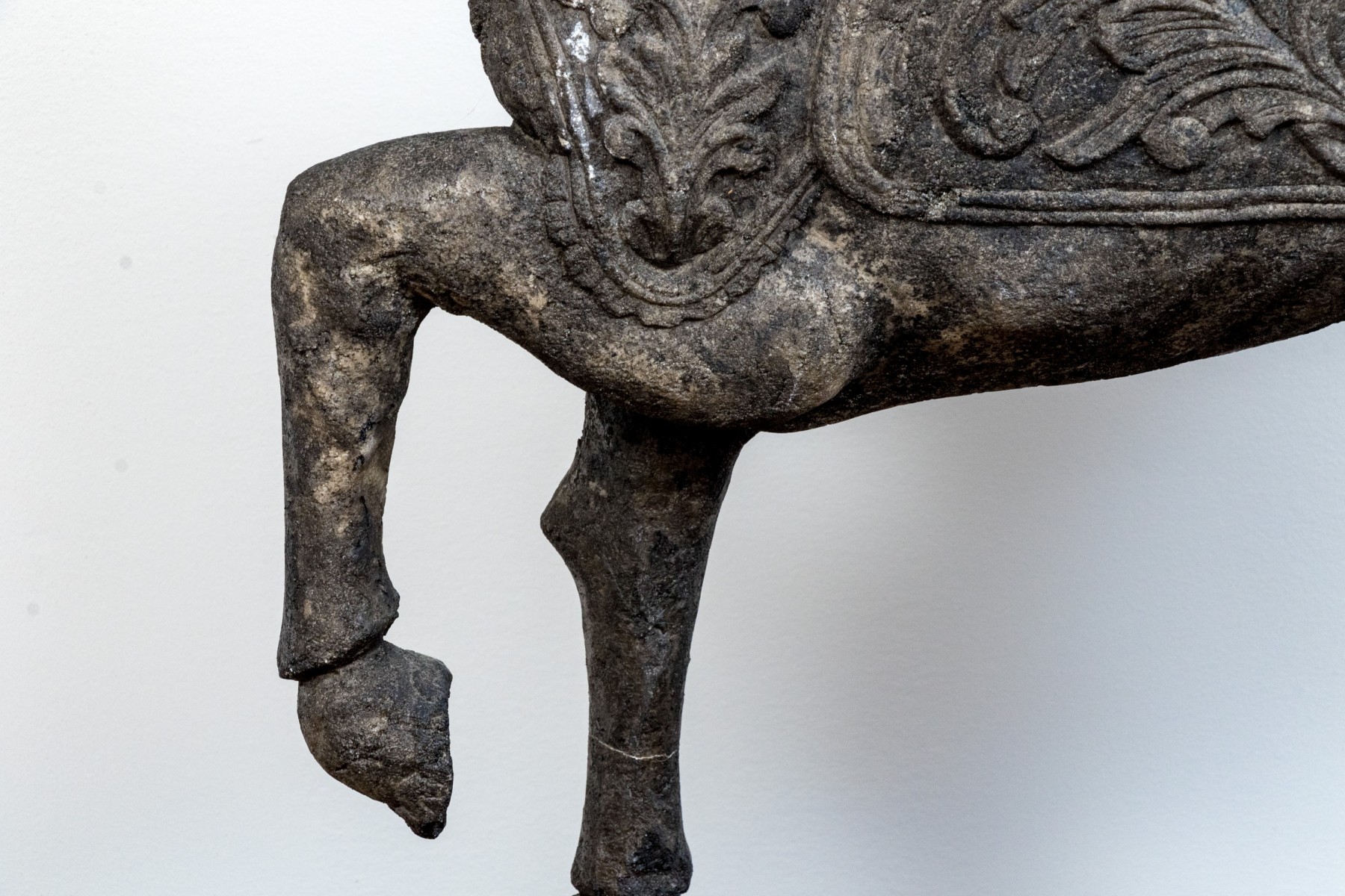 Presented on a rectangular base, the horse with heavily decorated saddle has a classical, short cropped spiral decorated tail. Its depicted with its front right leg raised.