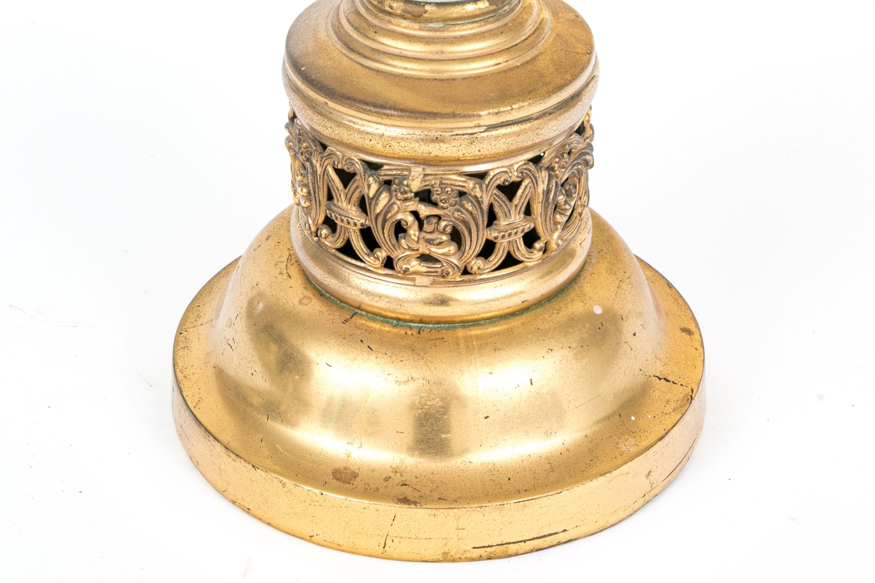 A large and well detailed altar crucifix depicting a silver plated figure of Jesus and I.N.R.I plaque on a brass cross leading down to a short white column over an openwork knop an gilt circular base.