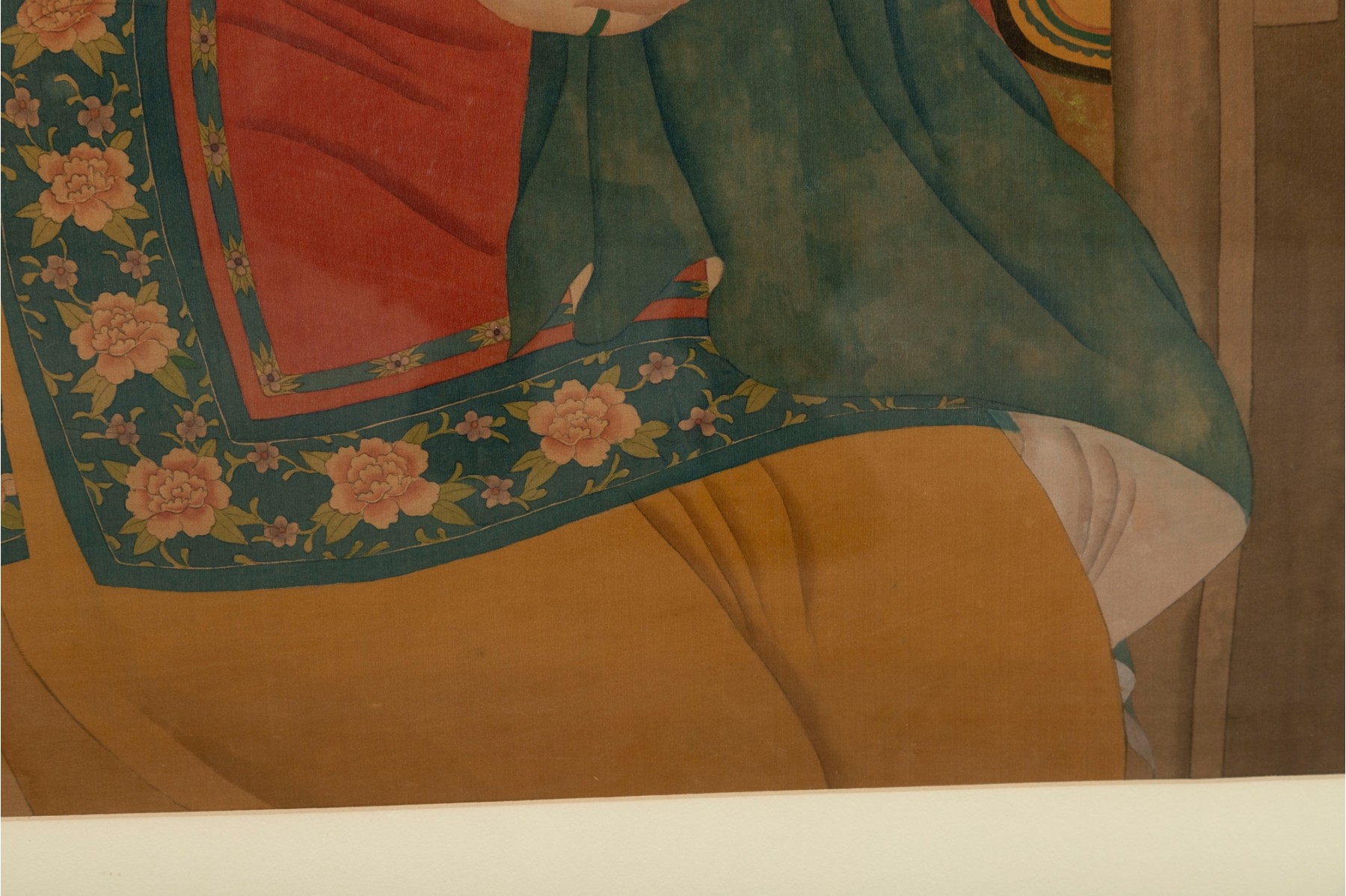 A striking and detailed large antique Chinese ancestral portrait, depicting a distinguished figure seated in traditional attire. The figure is adorned with elaborate robes and intricate patterns, often indicating status and lineage. The artwork is presented within a plain black frame, contained behind glass.