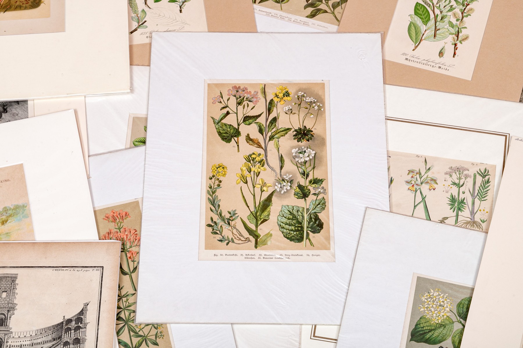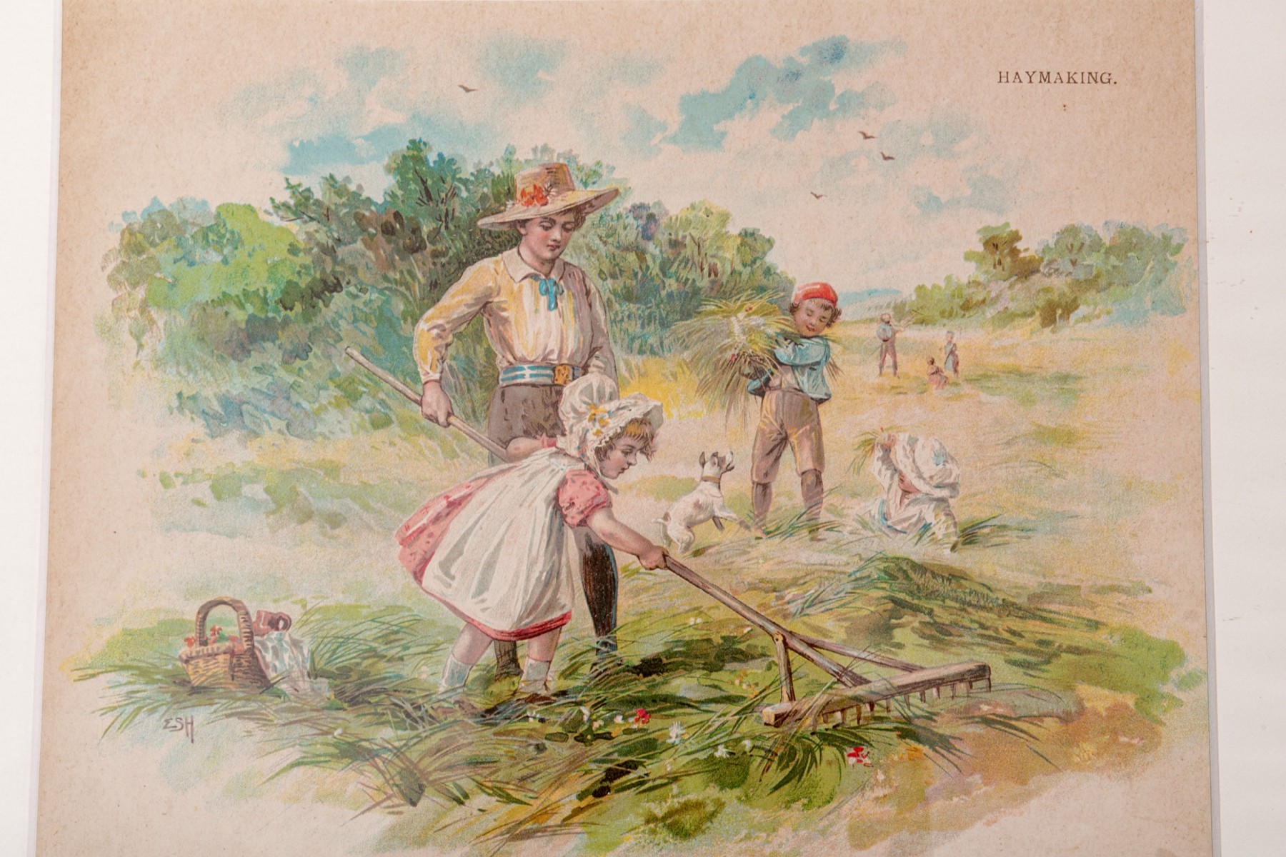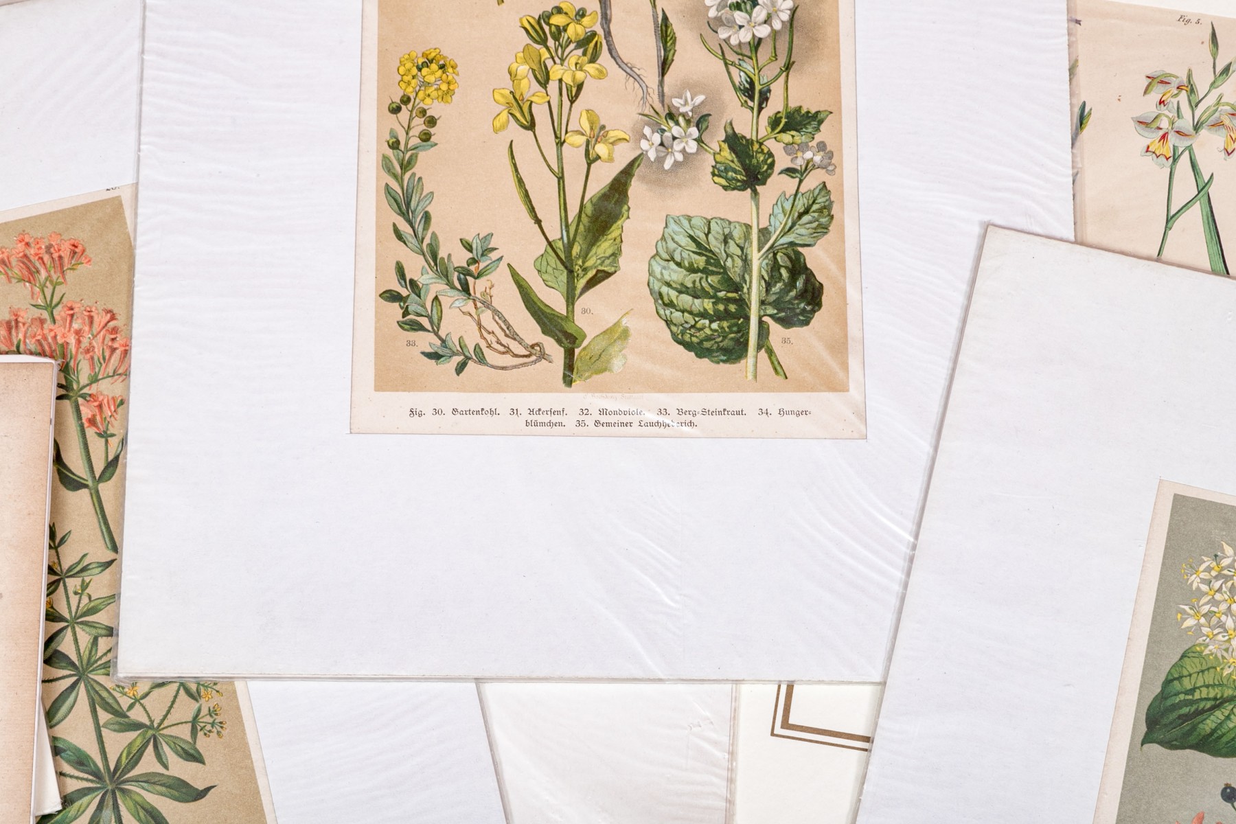 Comprised of classic and vibrant botanicals, Victorian style figural interior scenes.
