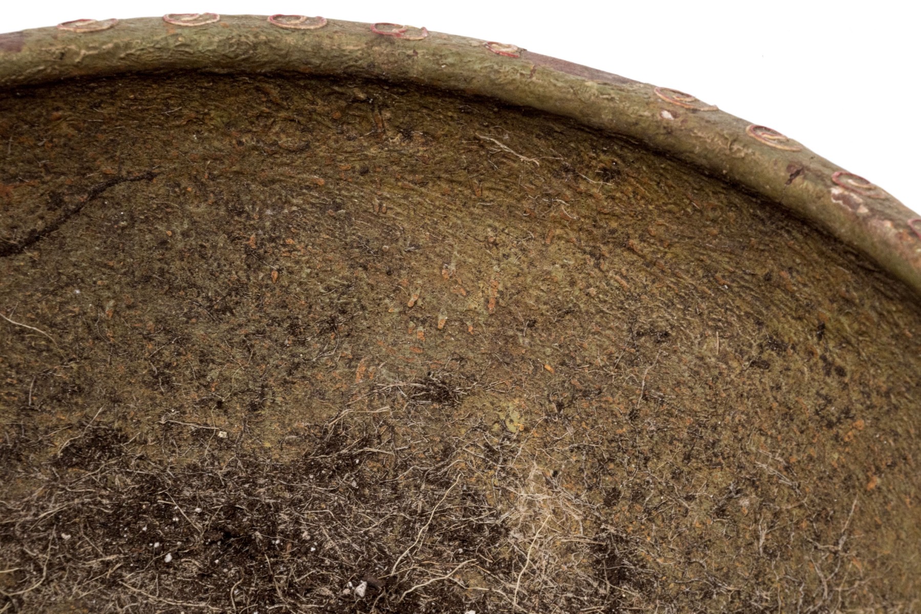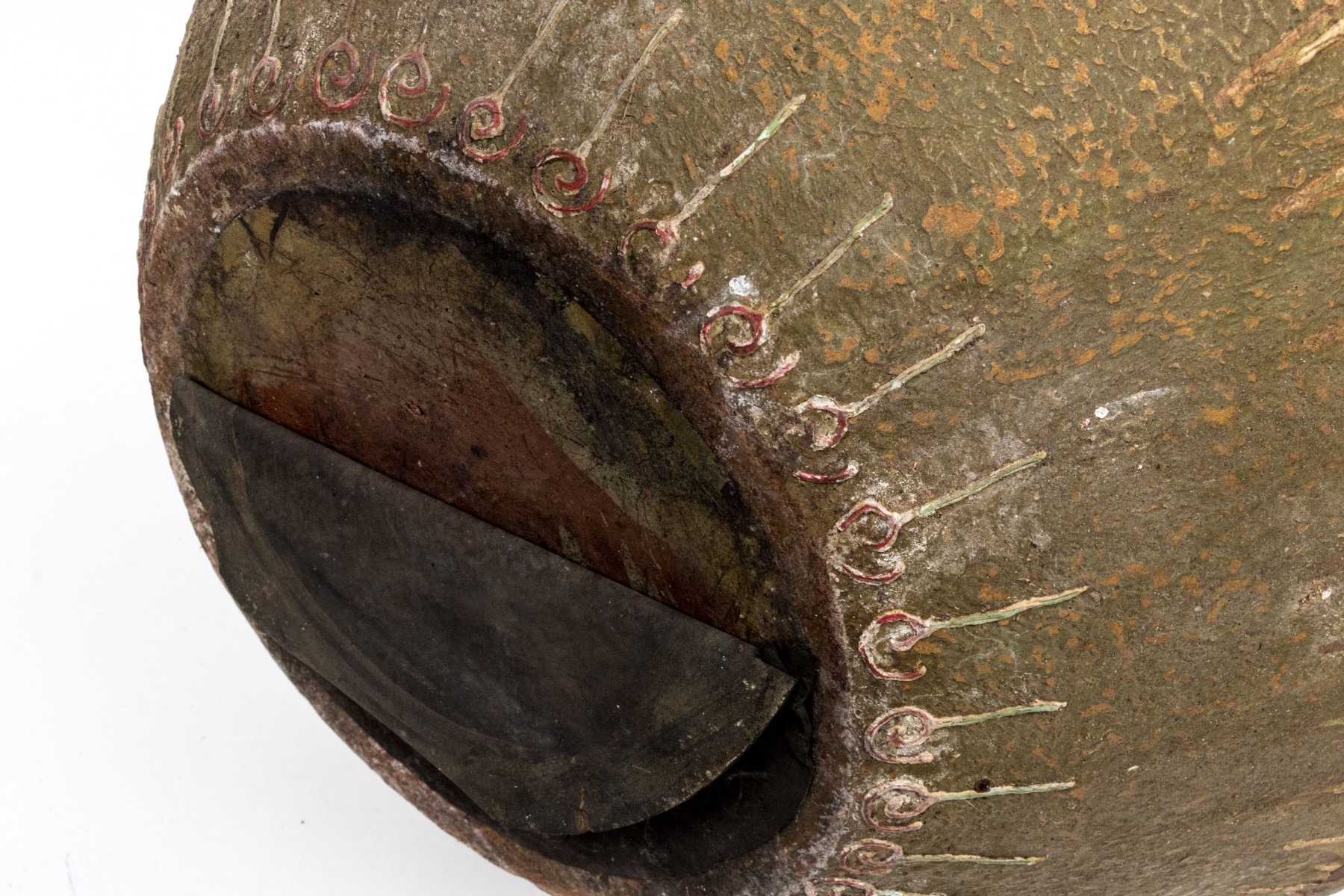 A delightful and large ceramic planter with a wide bowl form and inward rolled rim nicely detailed with diamond and dot motif and adorned with sculptural frog around the top. The rich, red hue of the frogs beautifully contrasts with the earthy olive green finish of the planter.