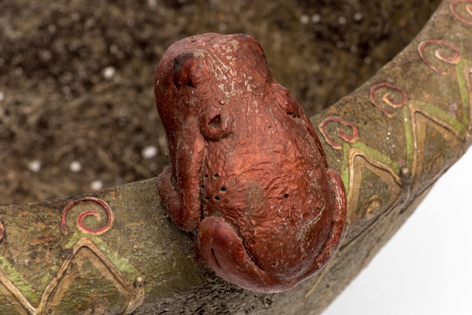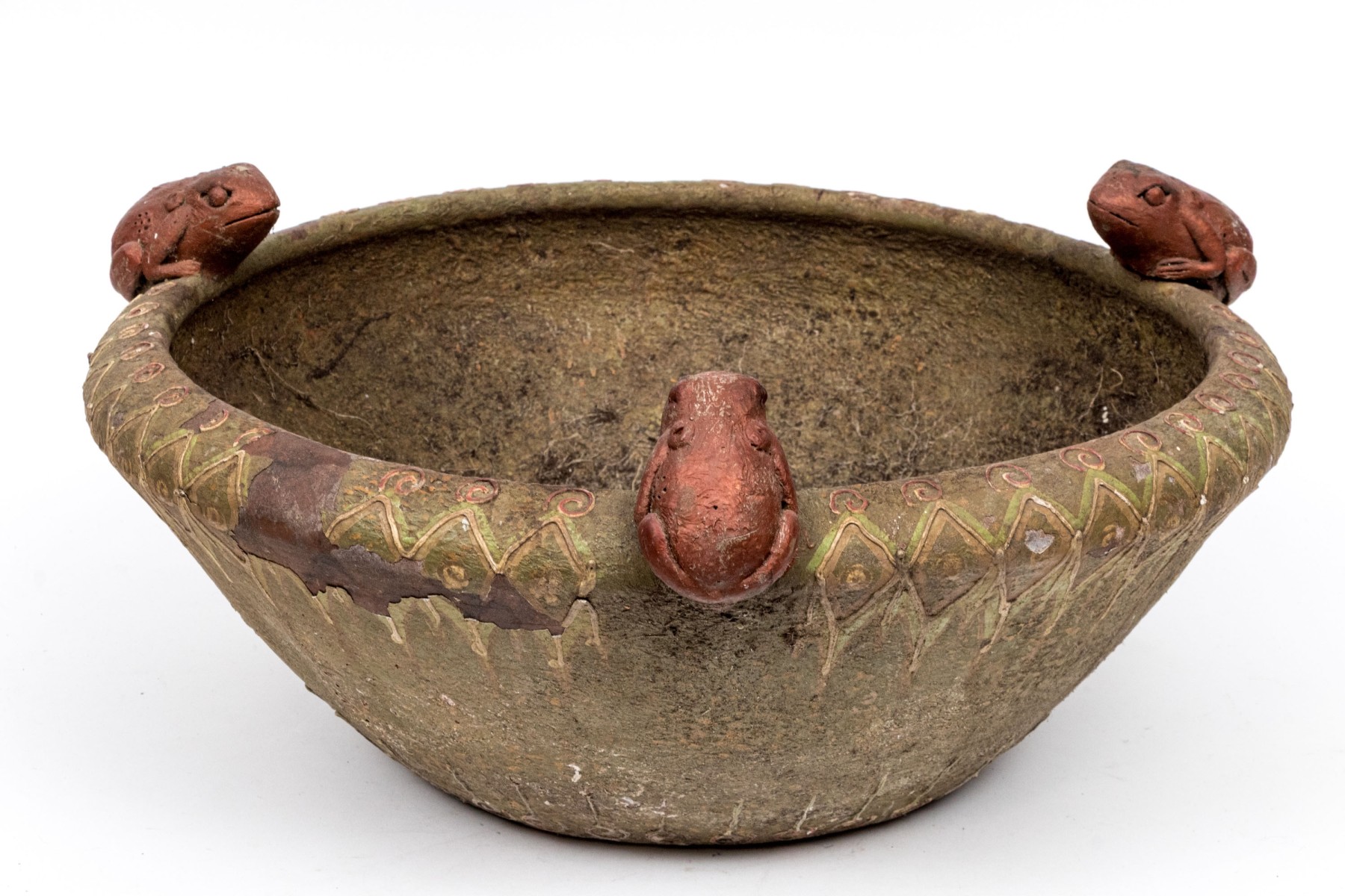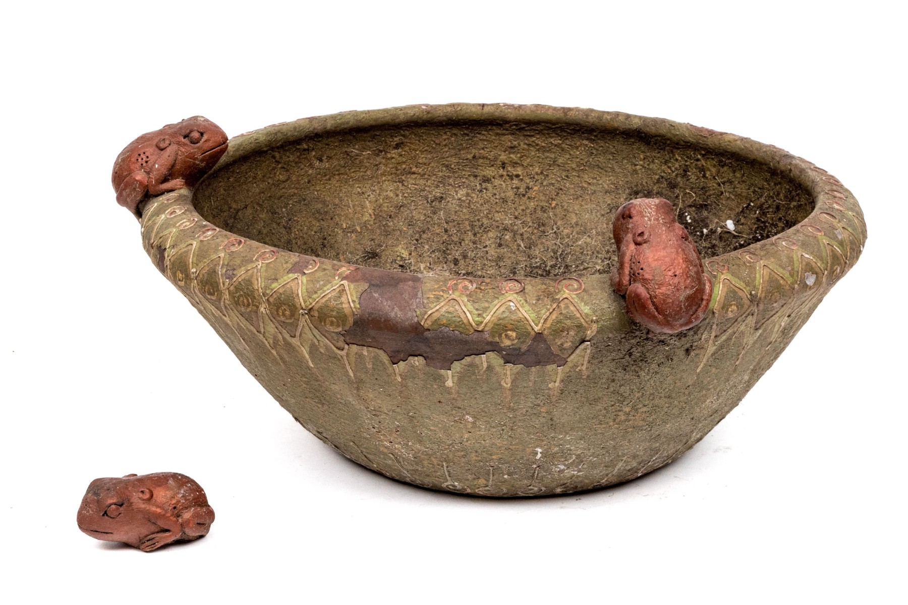 One frog has broken off but is with the bowl. Losses to the finish and decoration commensurate with age and use.
