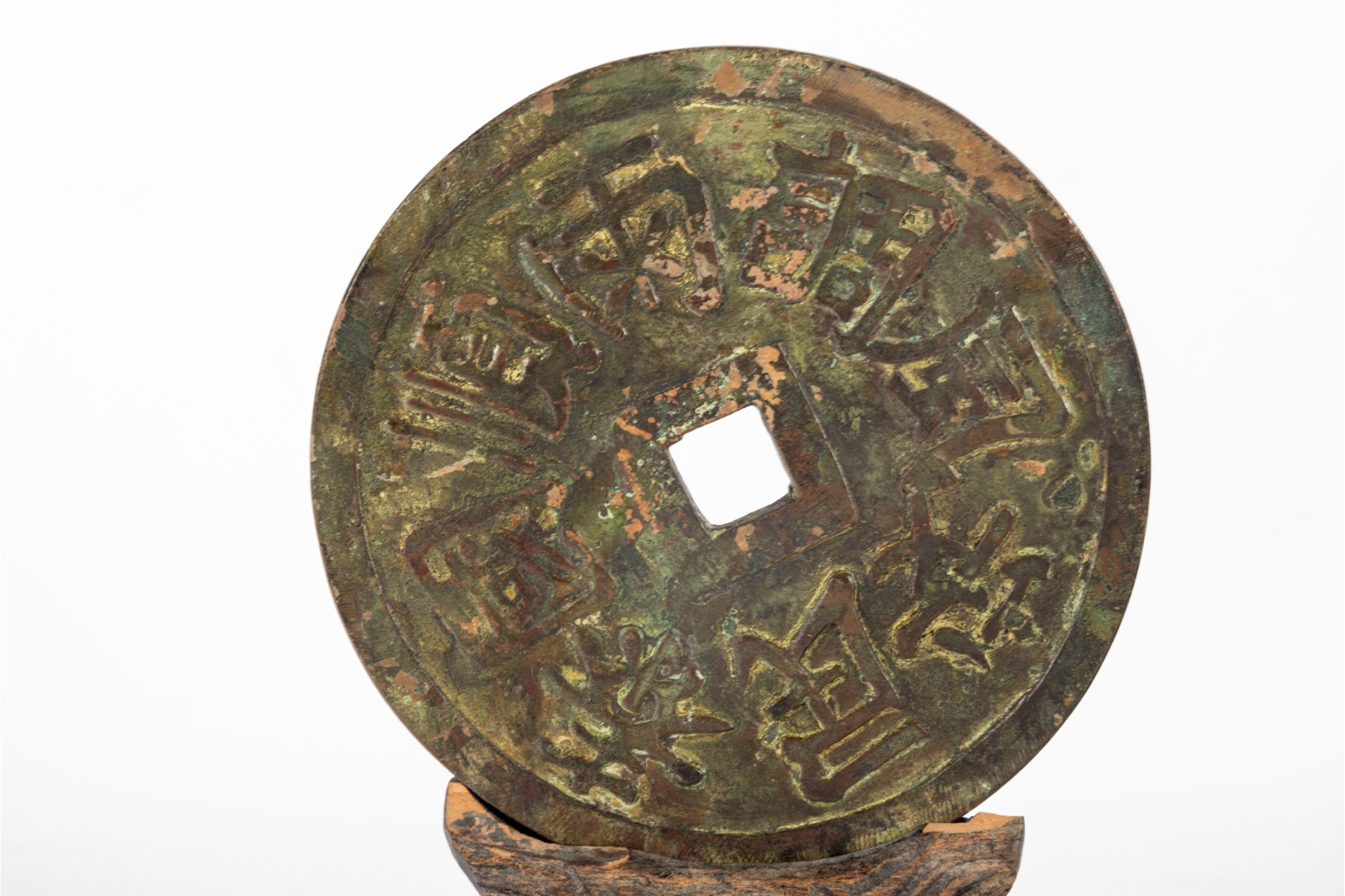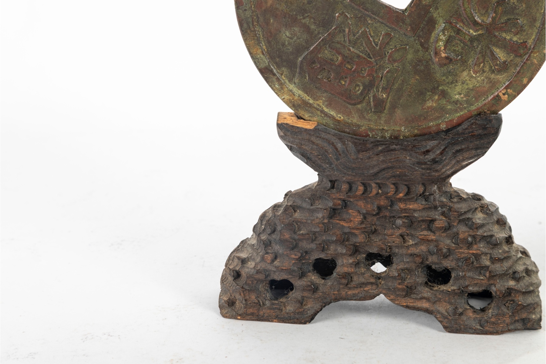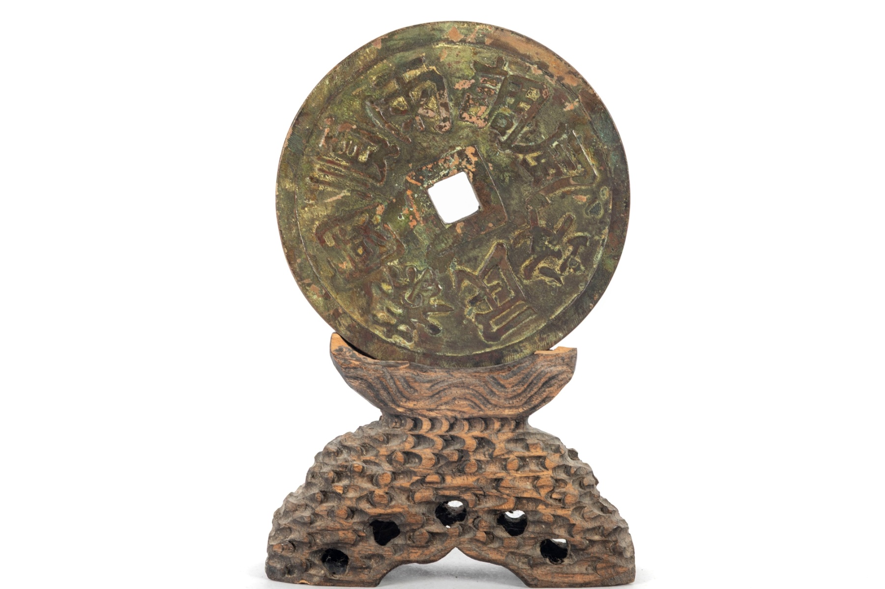 A decorative oversized Chinese-style bronze coin, modeled after traditional “cash” coins featuring a central square aperture and raised Chinese characters on both sides. The piece exhibits a rich, aged patina of green and brown tones, giving it an antique appearance. It is displayed on a carved wooden stand with a pierced and textured surface, likely designed to resemble stylized clouds or waves.