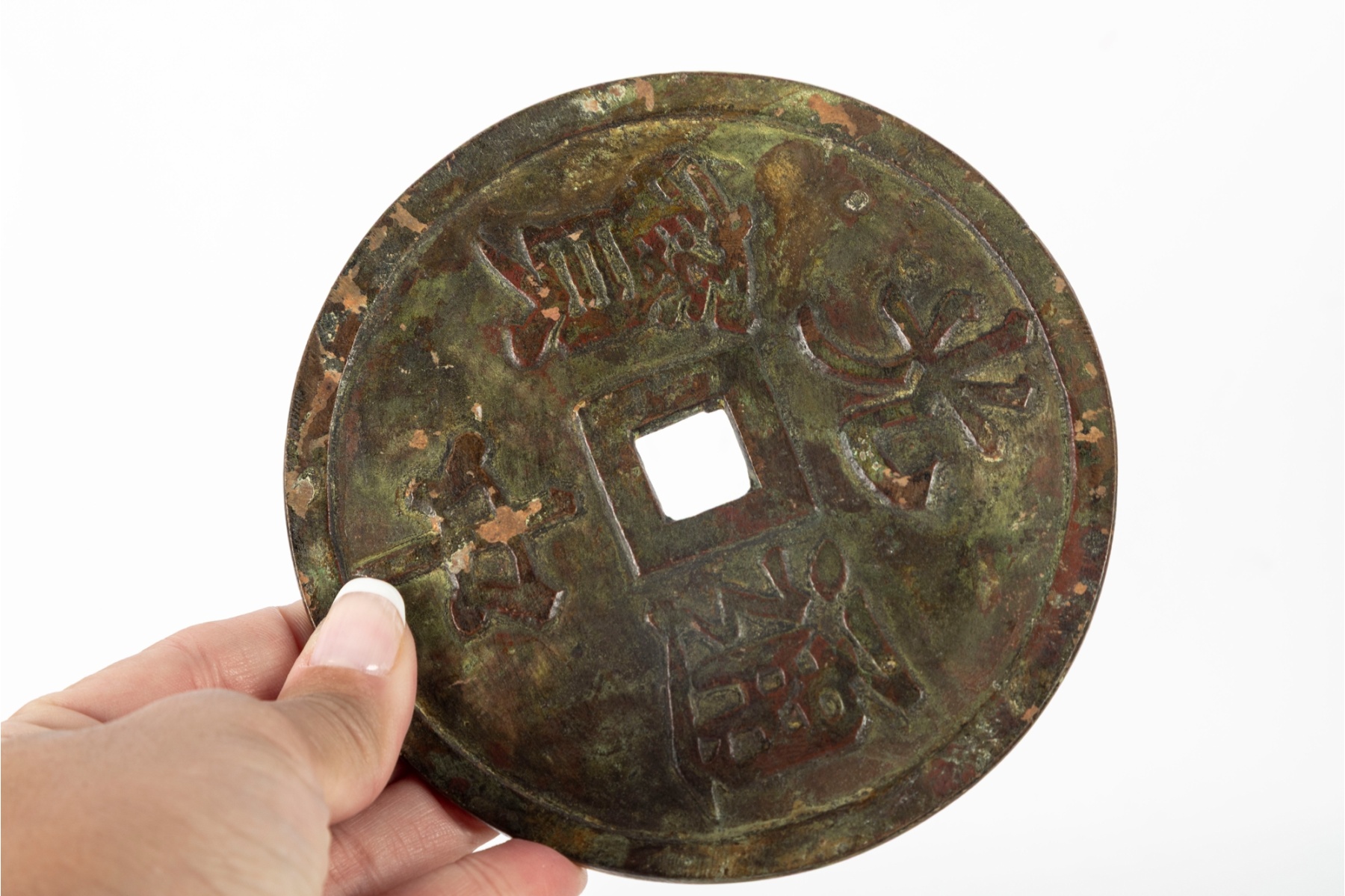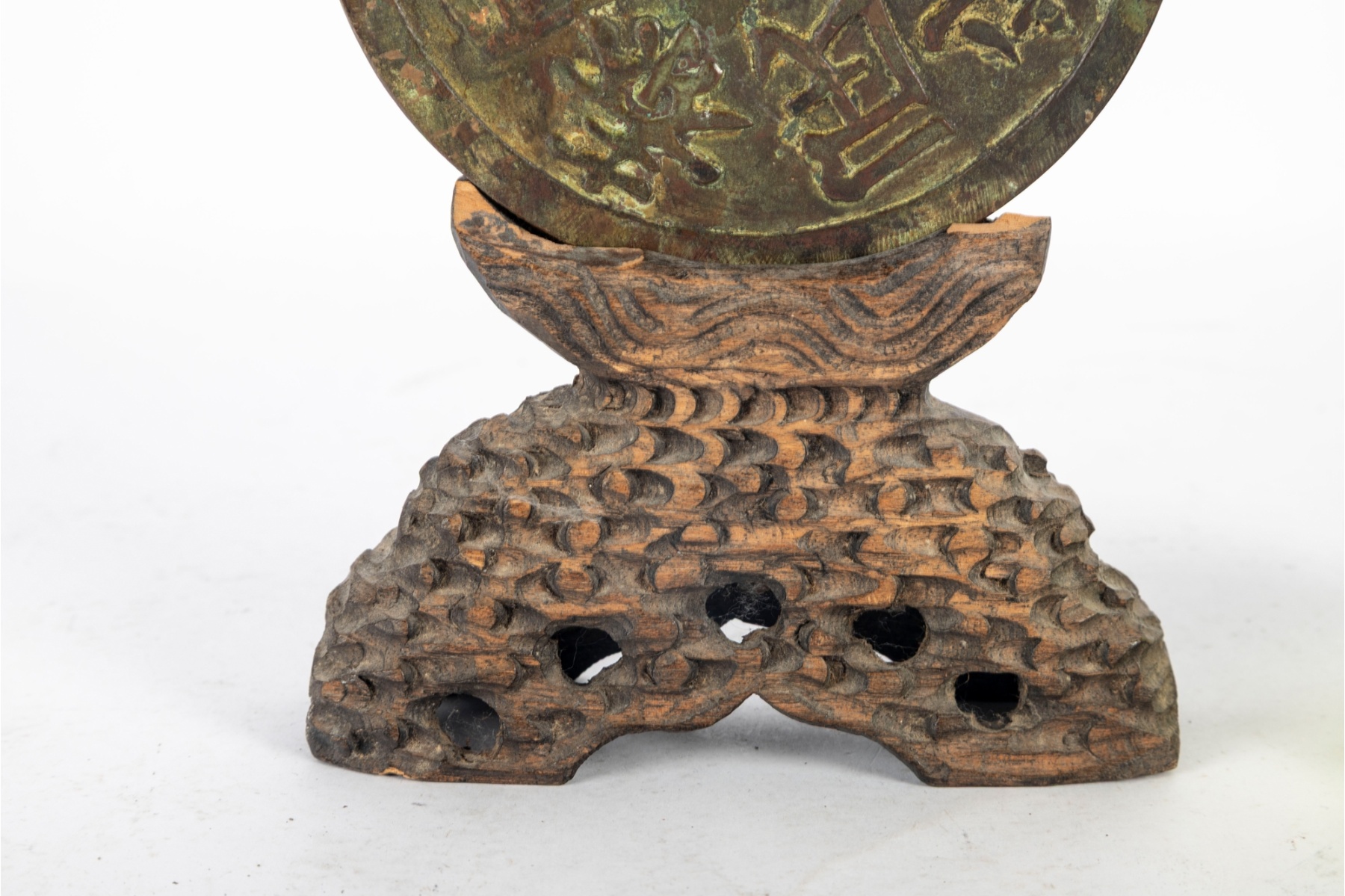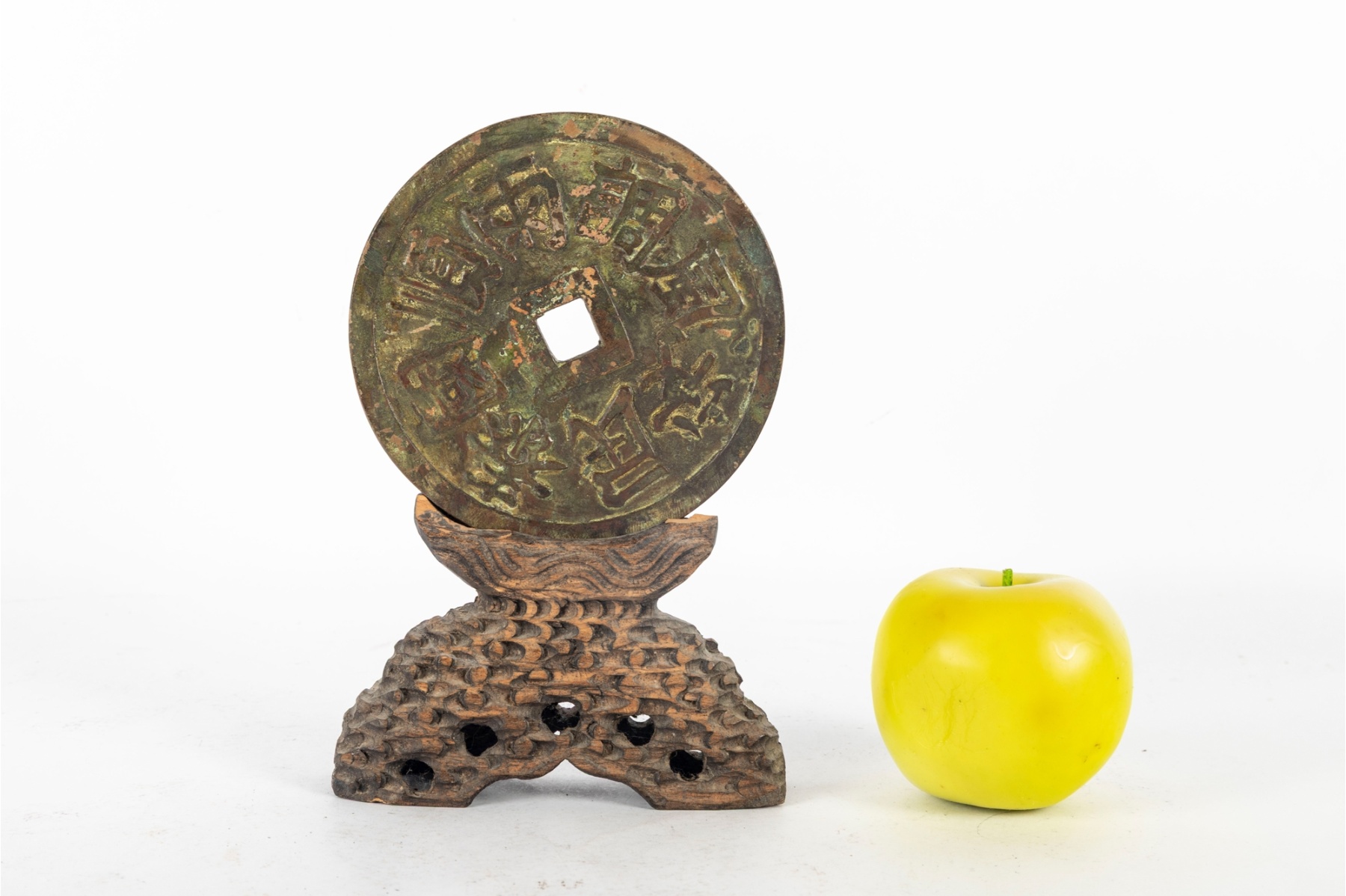 A decorative oversized Chinese-style bronze coin, modeled after traditional “cash” coins featuring a central square aperture and raised Chinese characters on both sides. The piece exhibits a rich, aged patina of green and brown tones, giving it an antique appearance. It is displayed on a carved wooden stand with a pierced and textured surface, likely designed to resemble stylized clouds or waves.