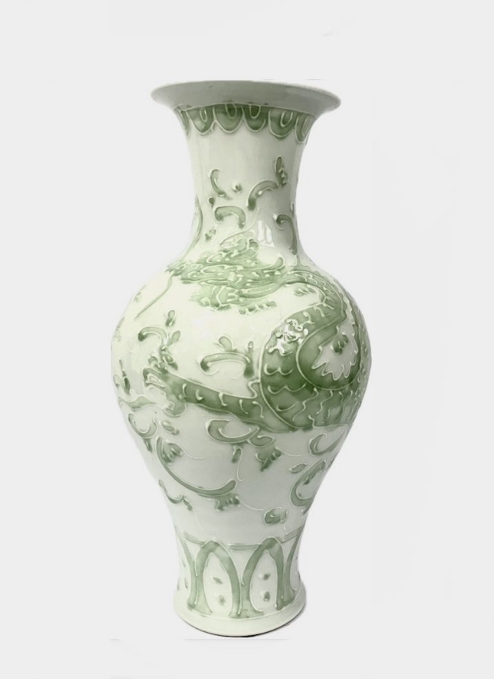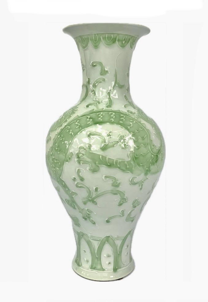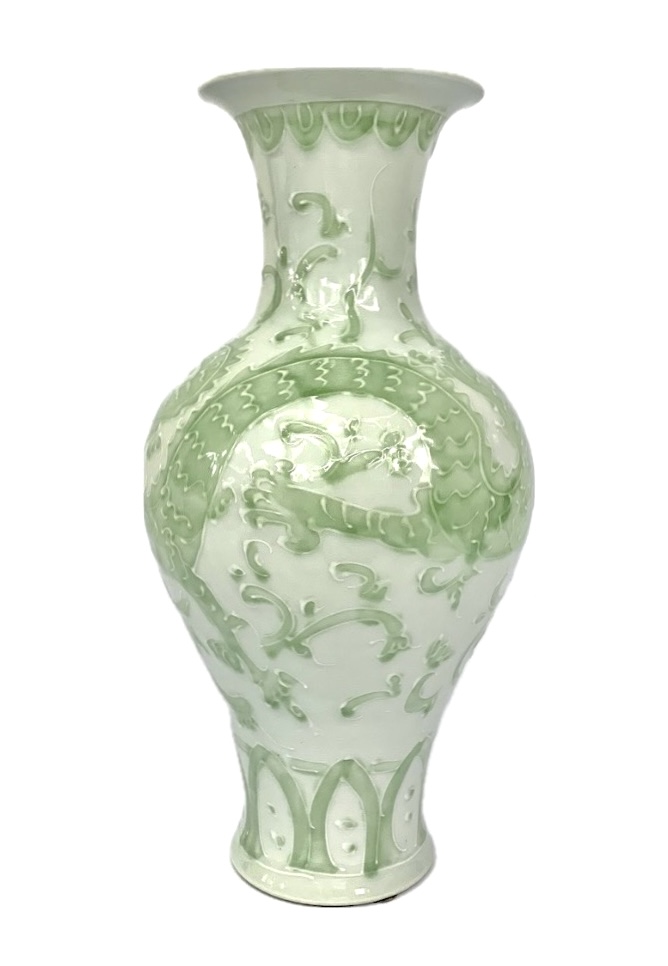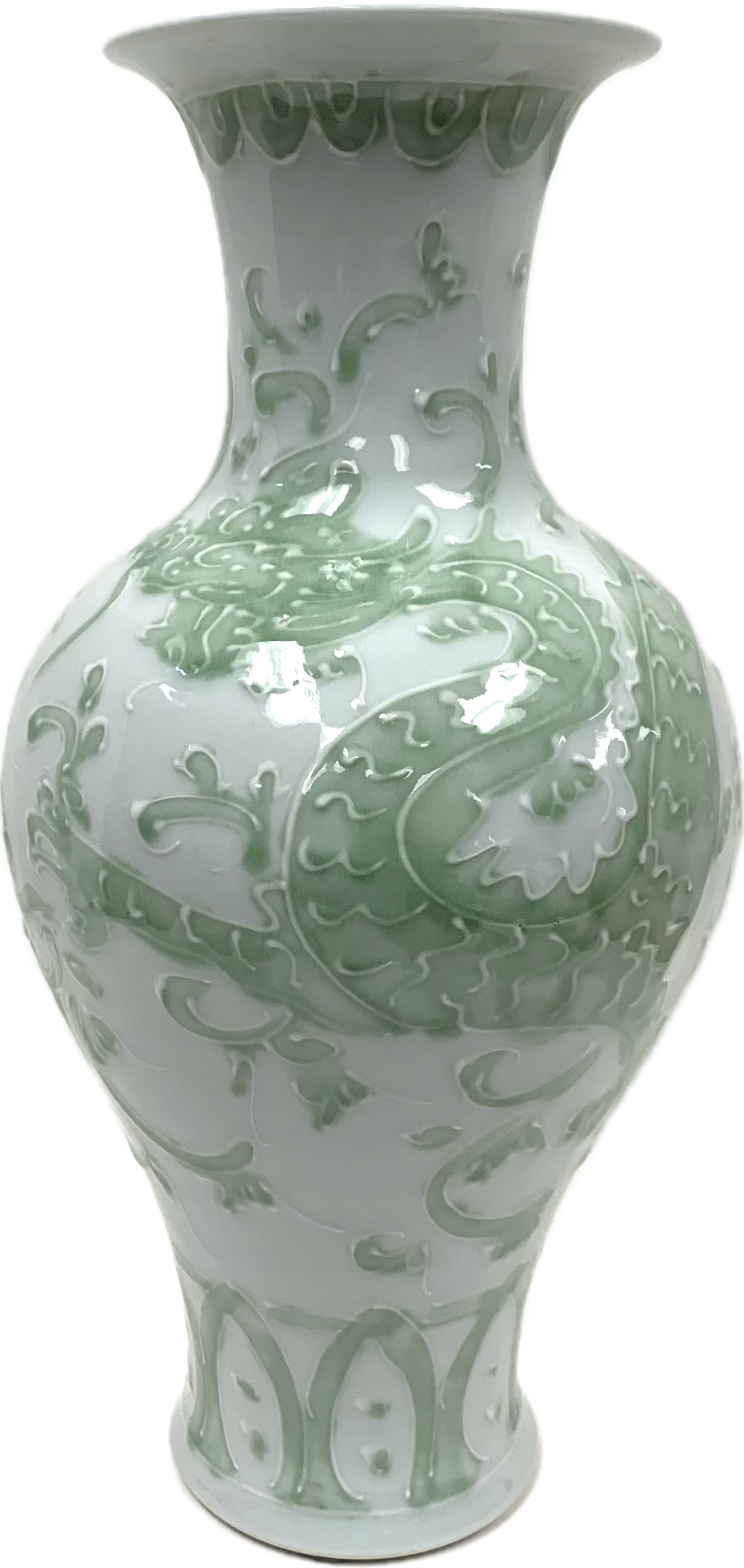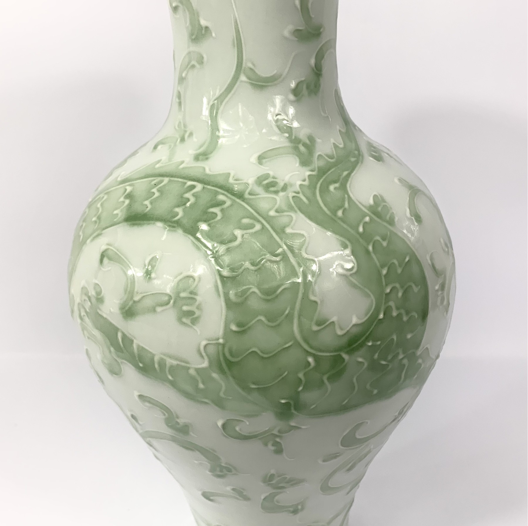 A sage and white large baluster form glossy porcelain vase with relief dragon across the front, a field of scattered abstractions in relief and a geometric arched trellis around the base. Partial old Lillian August sticker over blue character marks.
