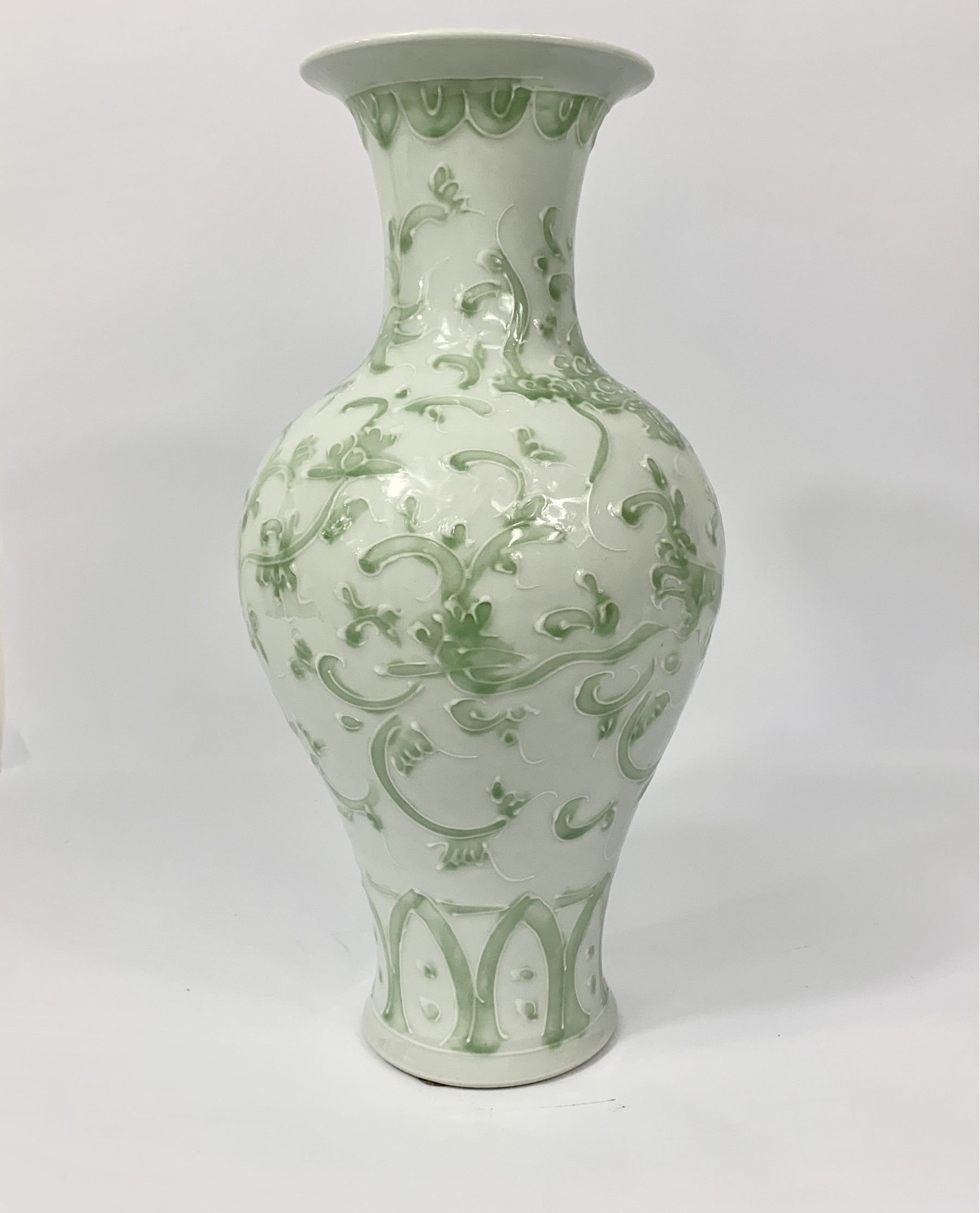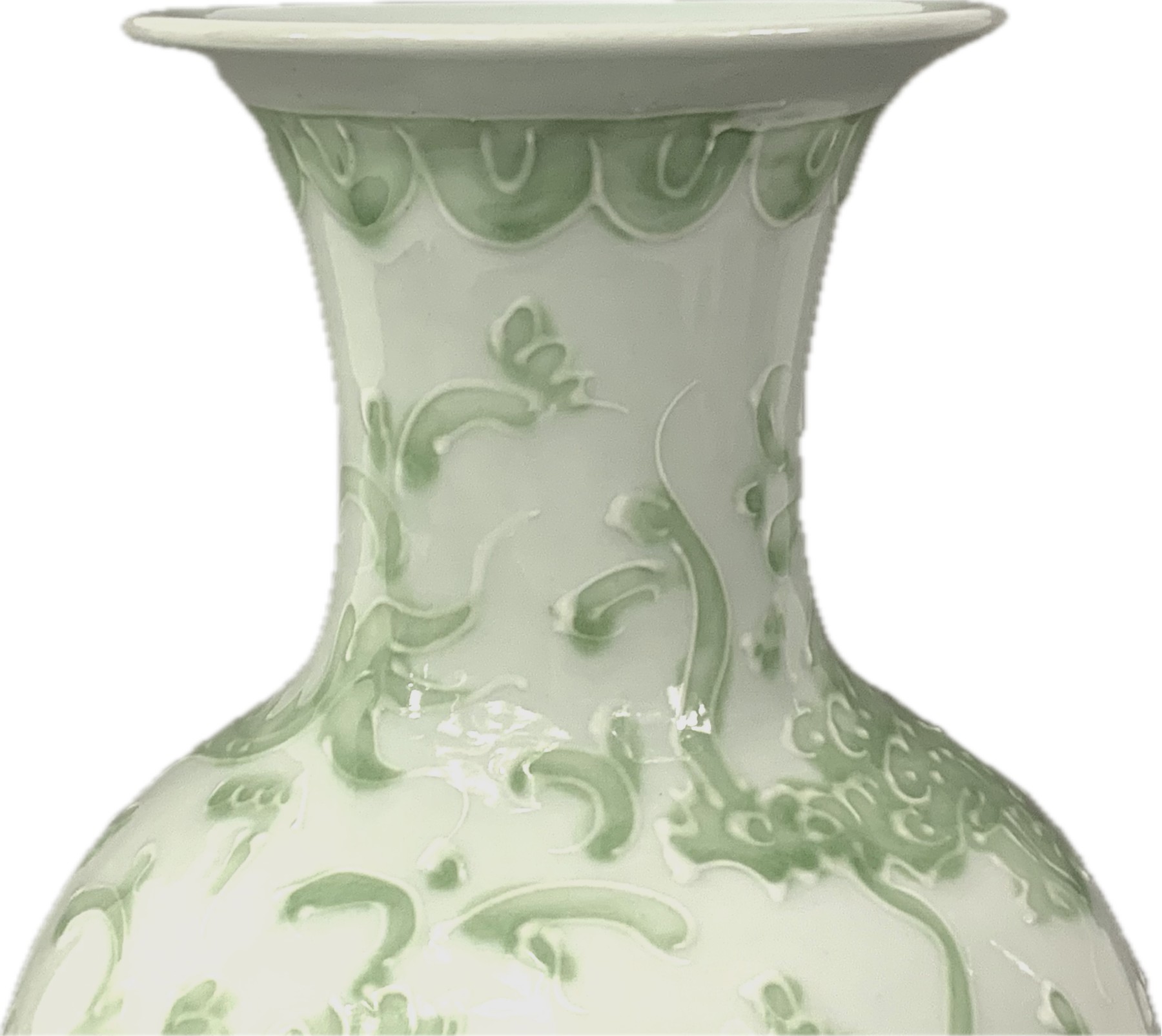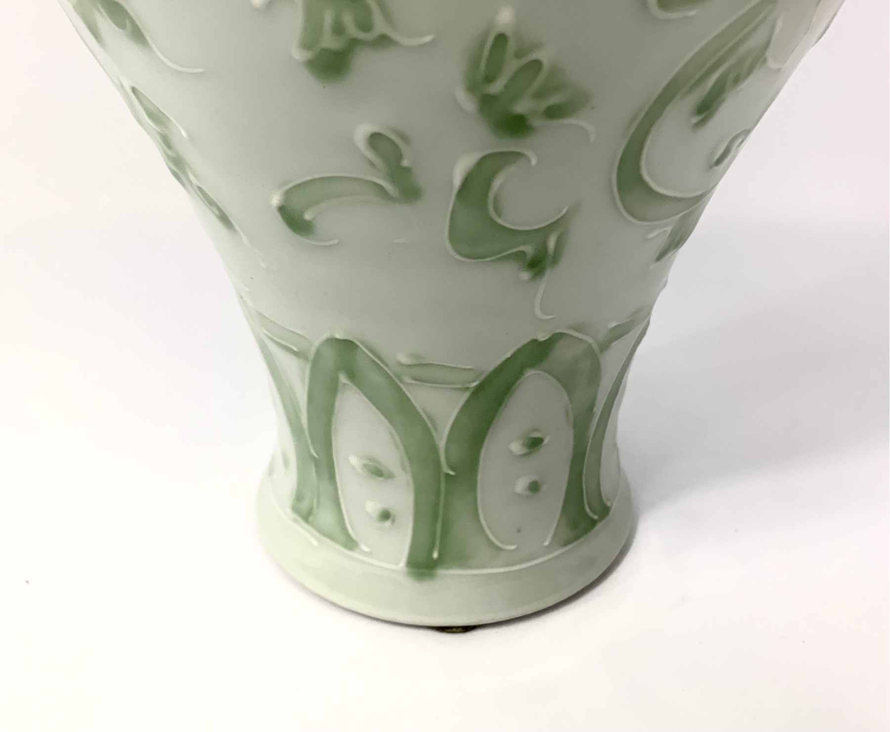 A sage and white large baluster form glossy porcelain vase with relief dragon across the front, a field of scattered abstractions in relief and a geometric arched trellis around the base. Partial old Lillian August sticker over blue character marks.