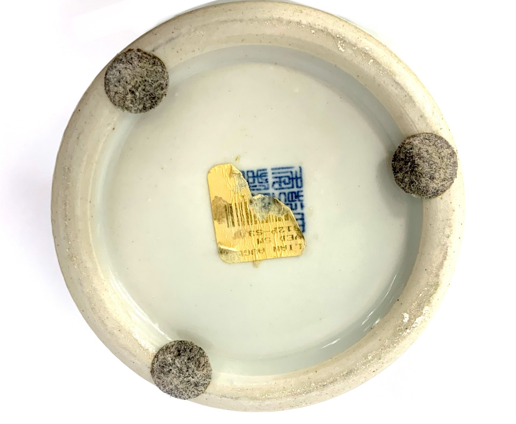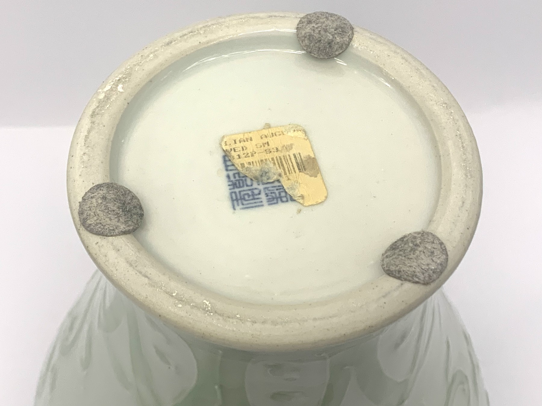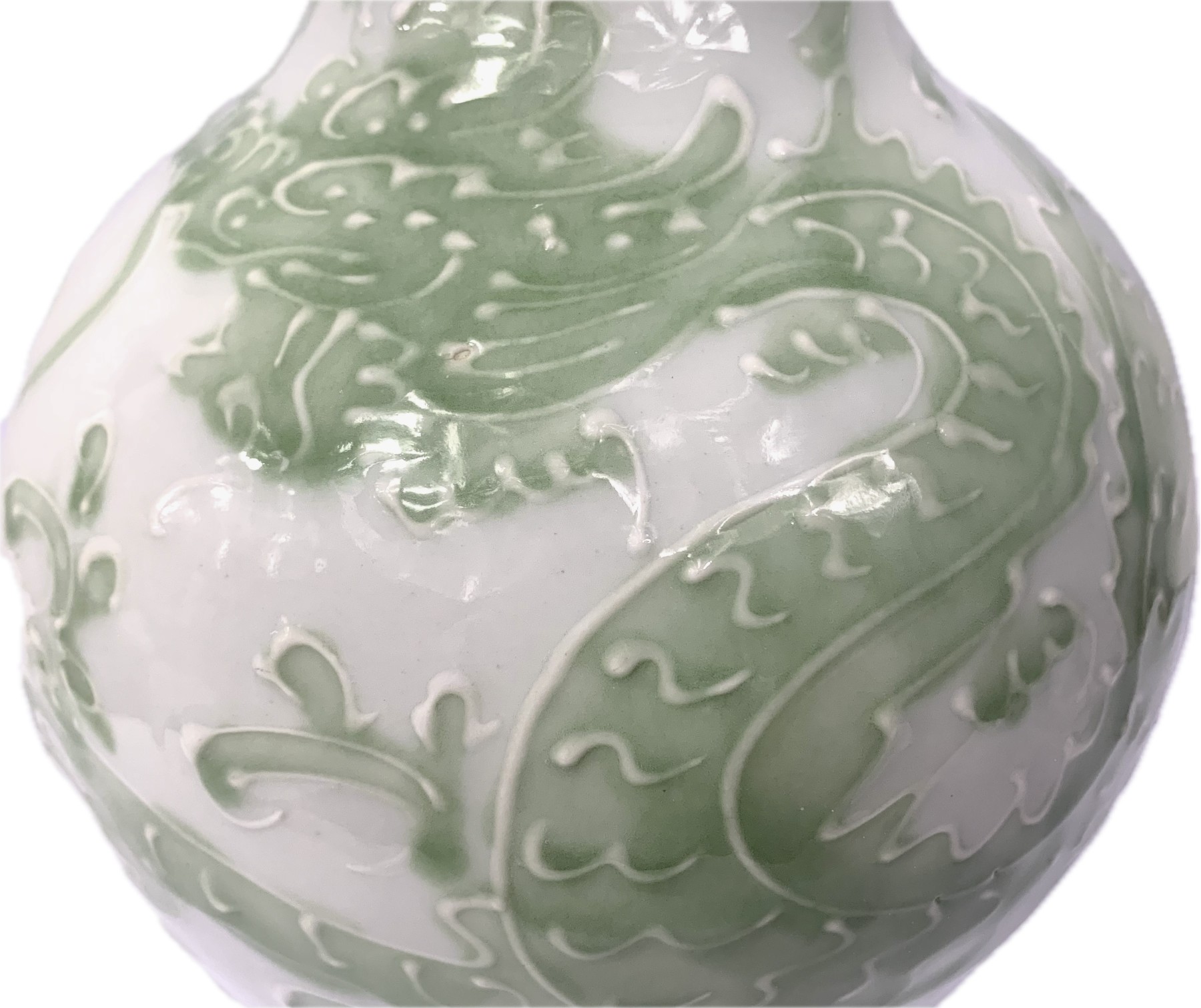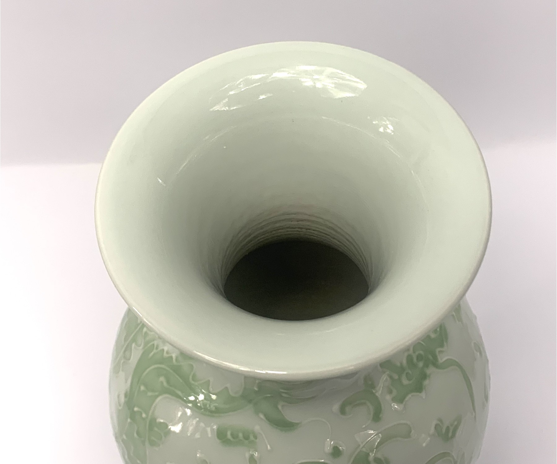 A sage and white large baluster form glossy porcelain vase with relief dragon across the front, a field of scattered abstractions in relief and a geometric arched trellis around the base. Partial old Lillian August sticker over blue character marks.