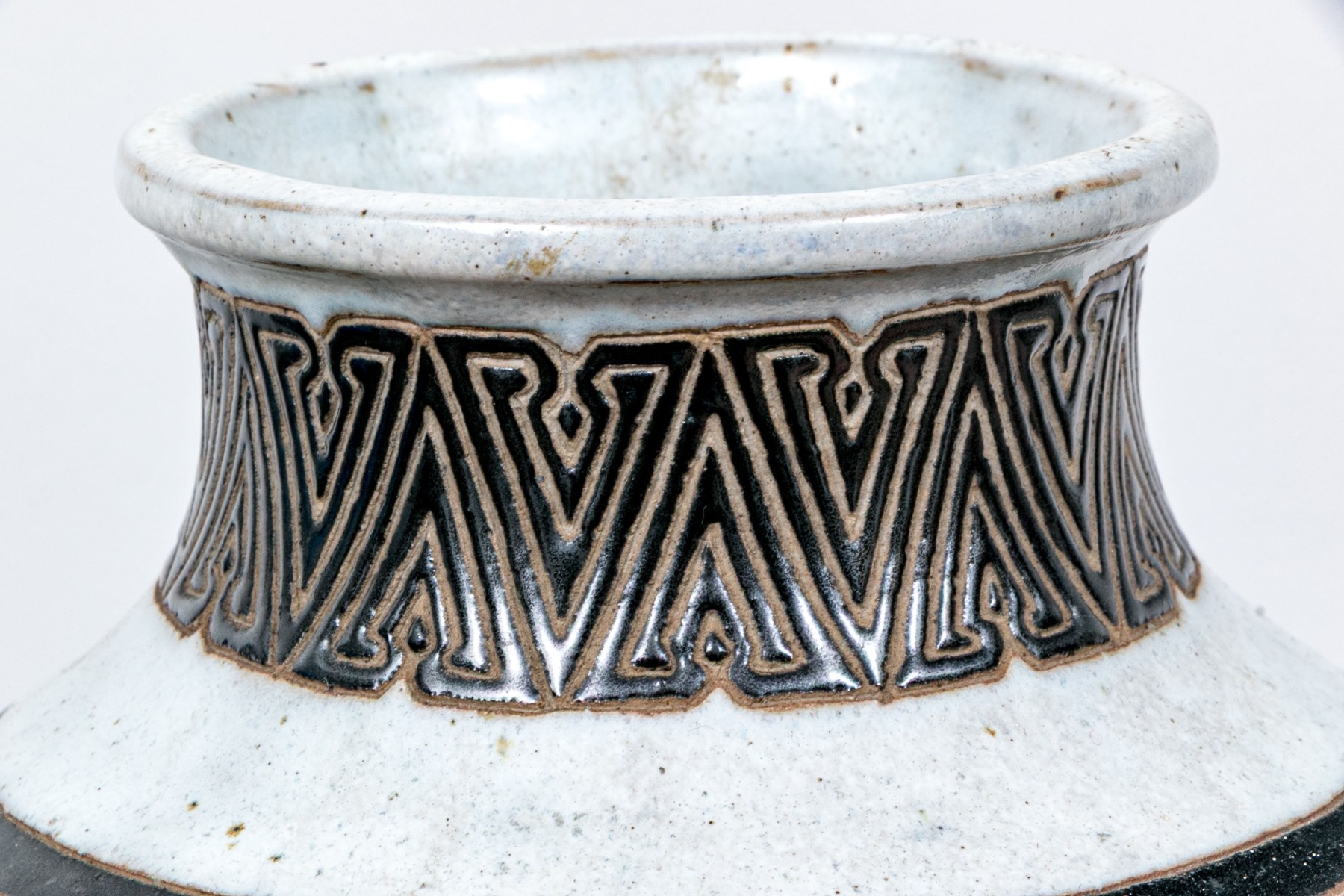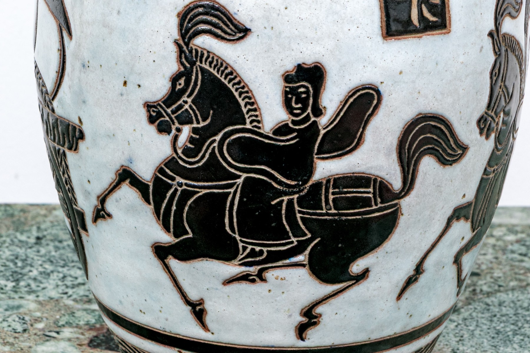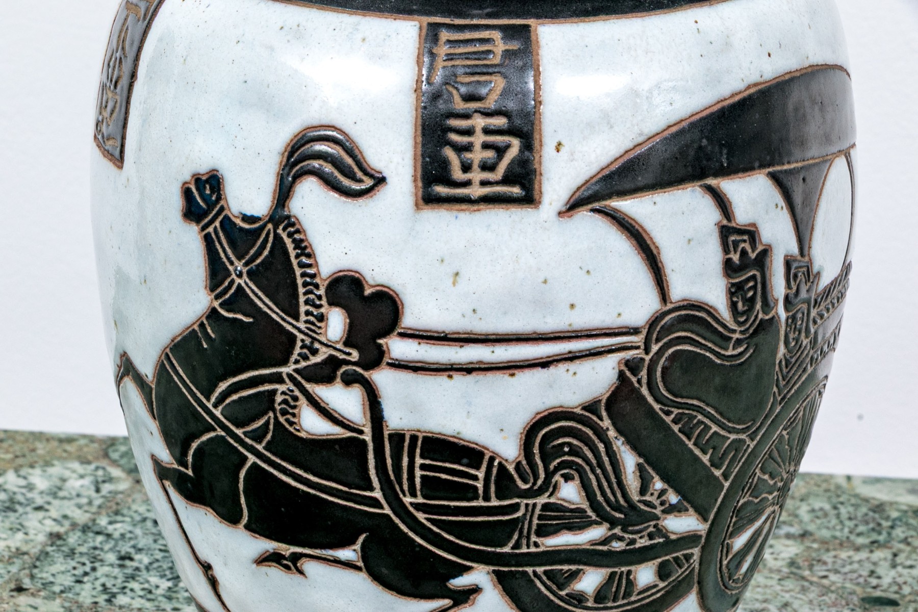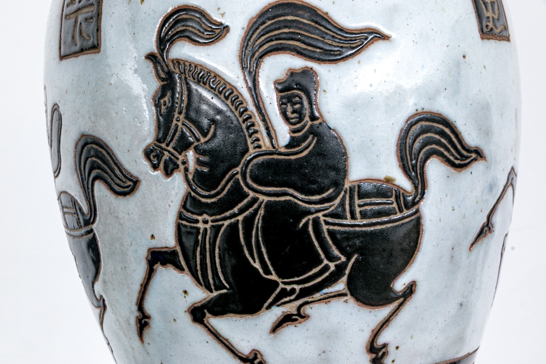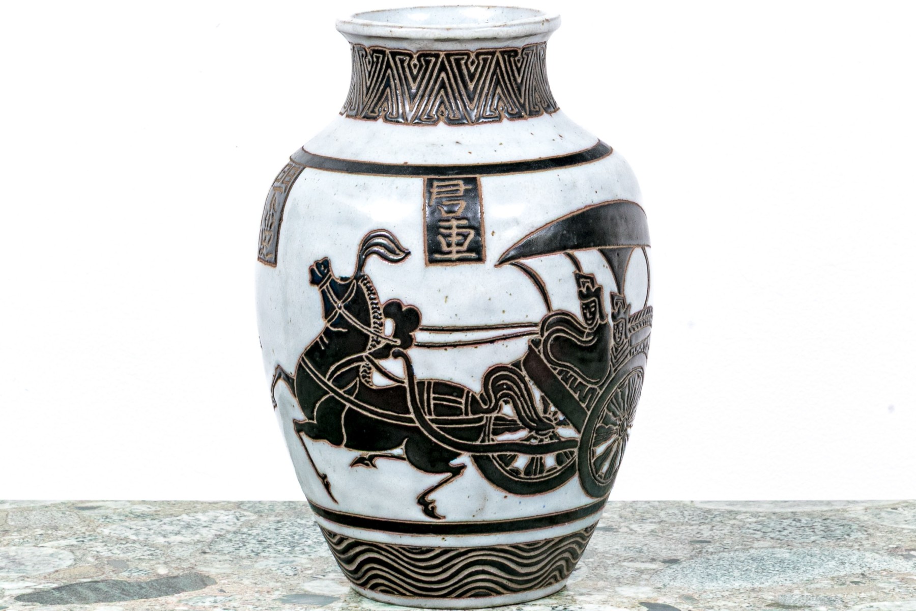 A gorgeous Asian ceramic vase with a raised neck and elongated ovoid form decorated with striking black and cool-toned white glaze depicting a figure in a horse drawn carriage with rectangular inscriptions around the shoulders and geometric borders around the neck and base. Marked underfoot.