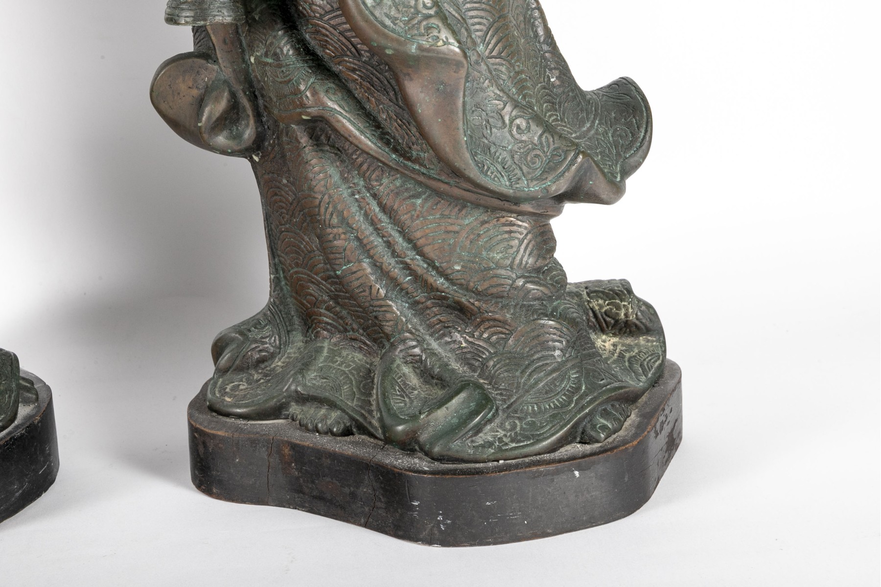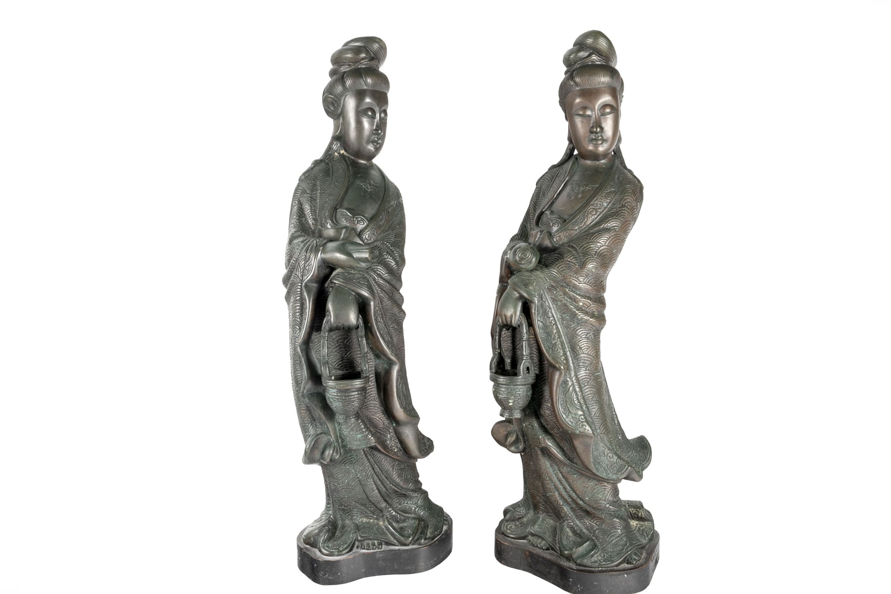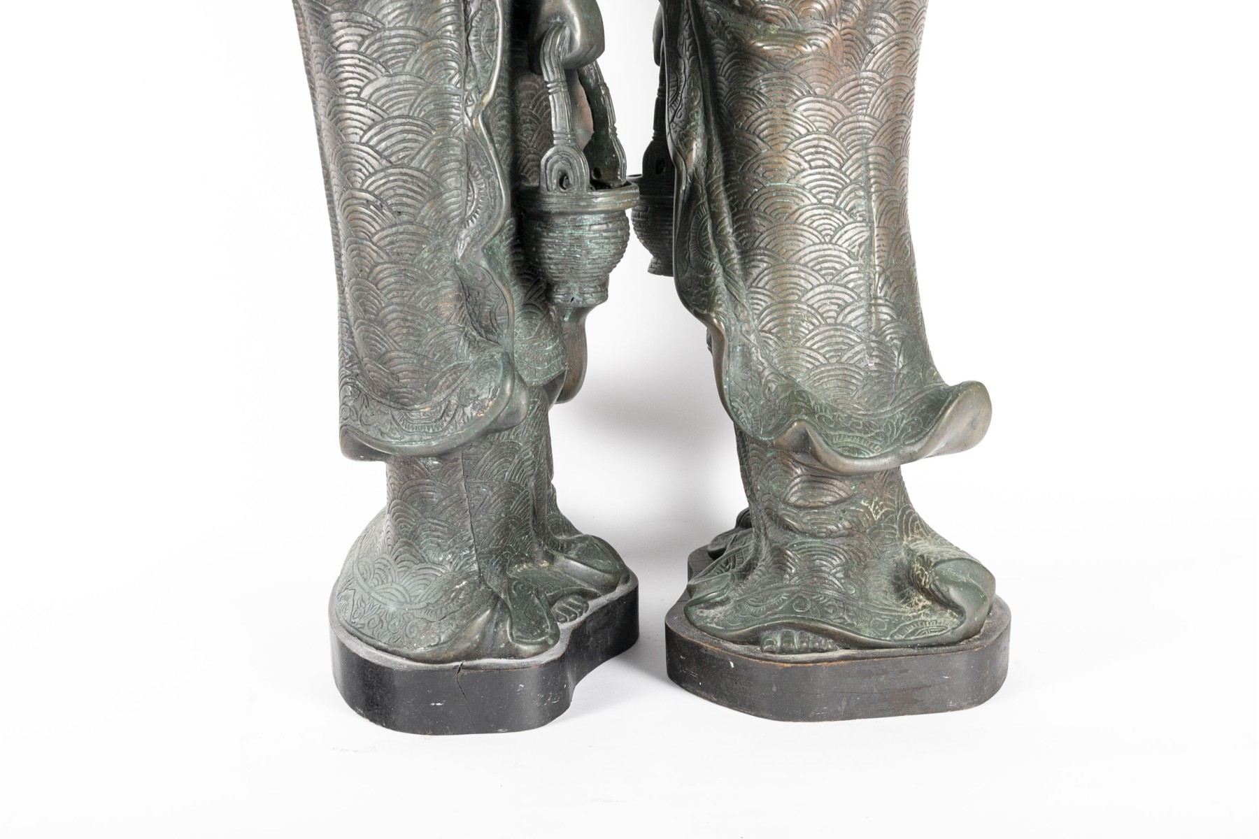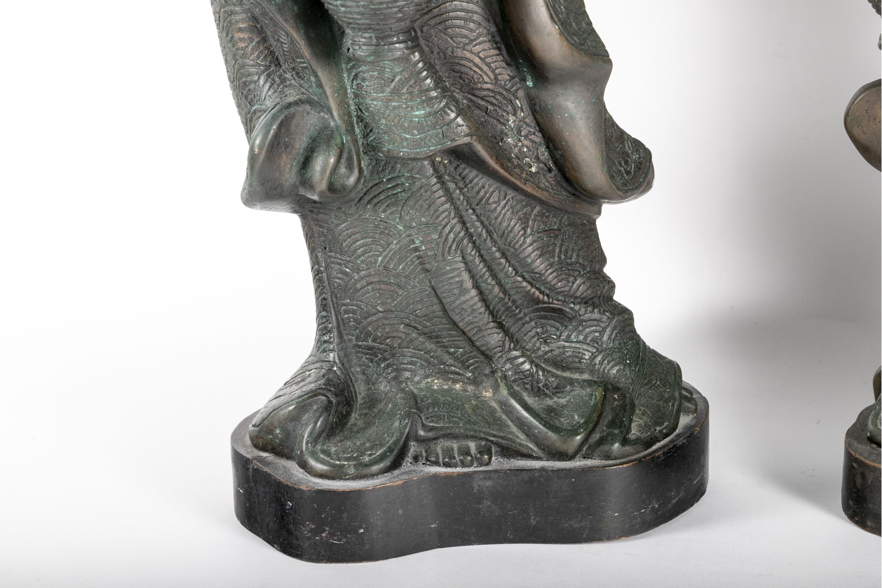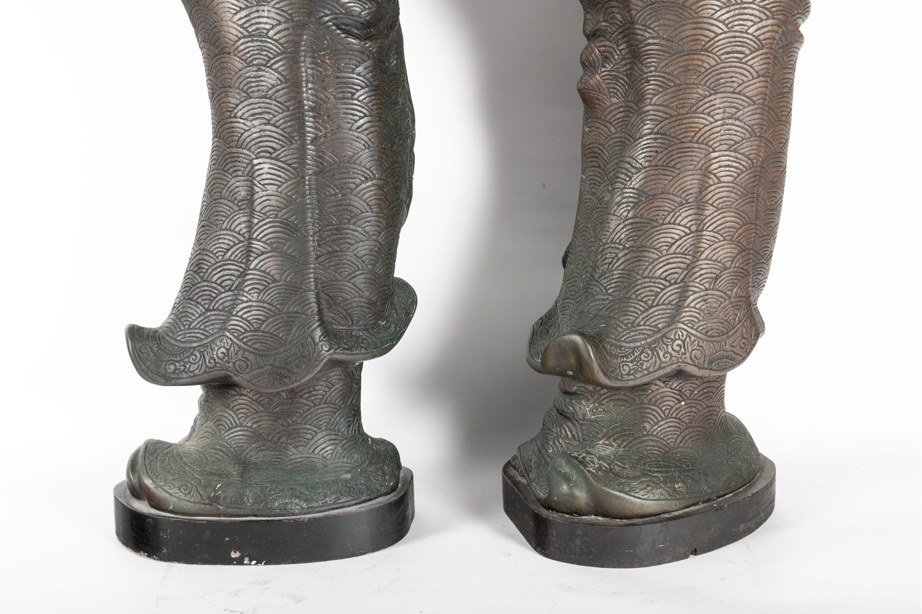 A matching pair of large Chinese Guanyin metal sculptures. She stands in a graceful pose, holding a scroll and a bucket while wearing beautiful robes detailed with wave motif relief.