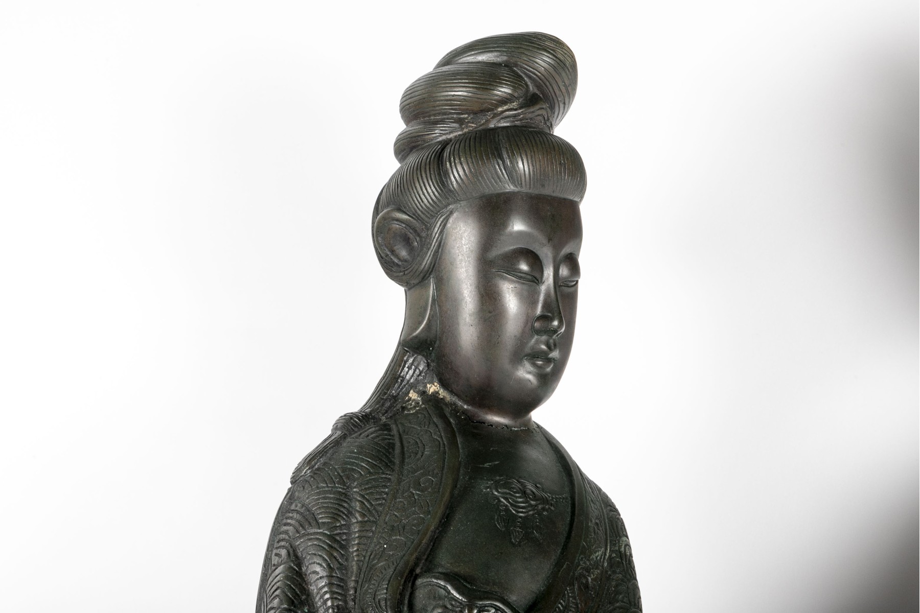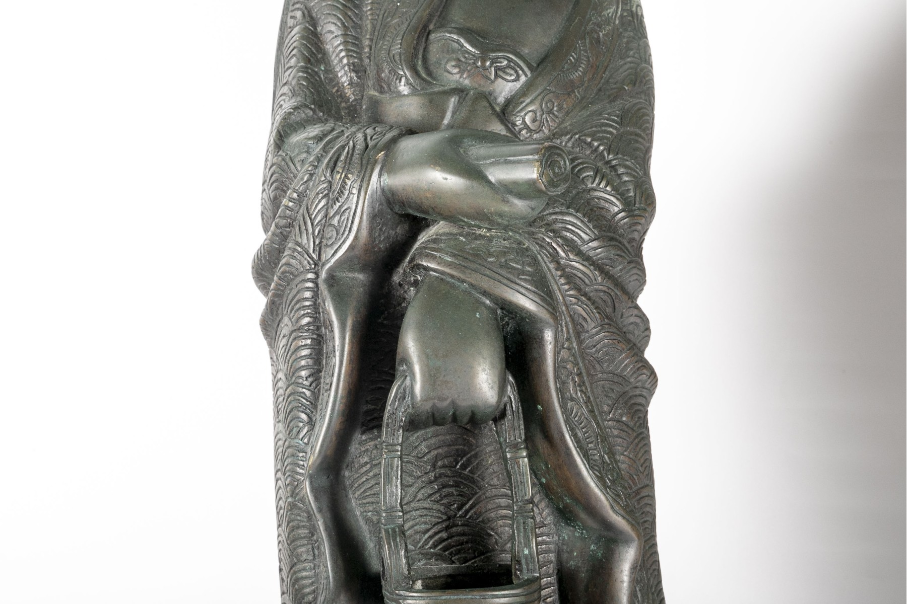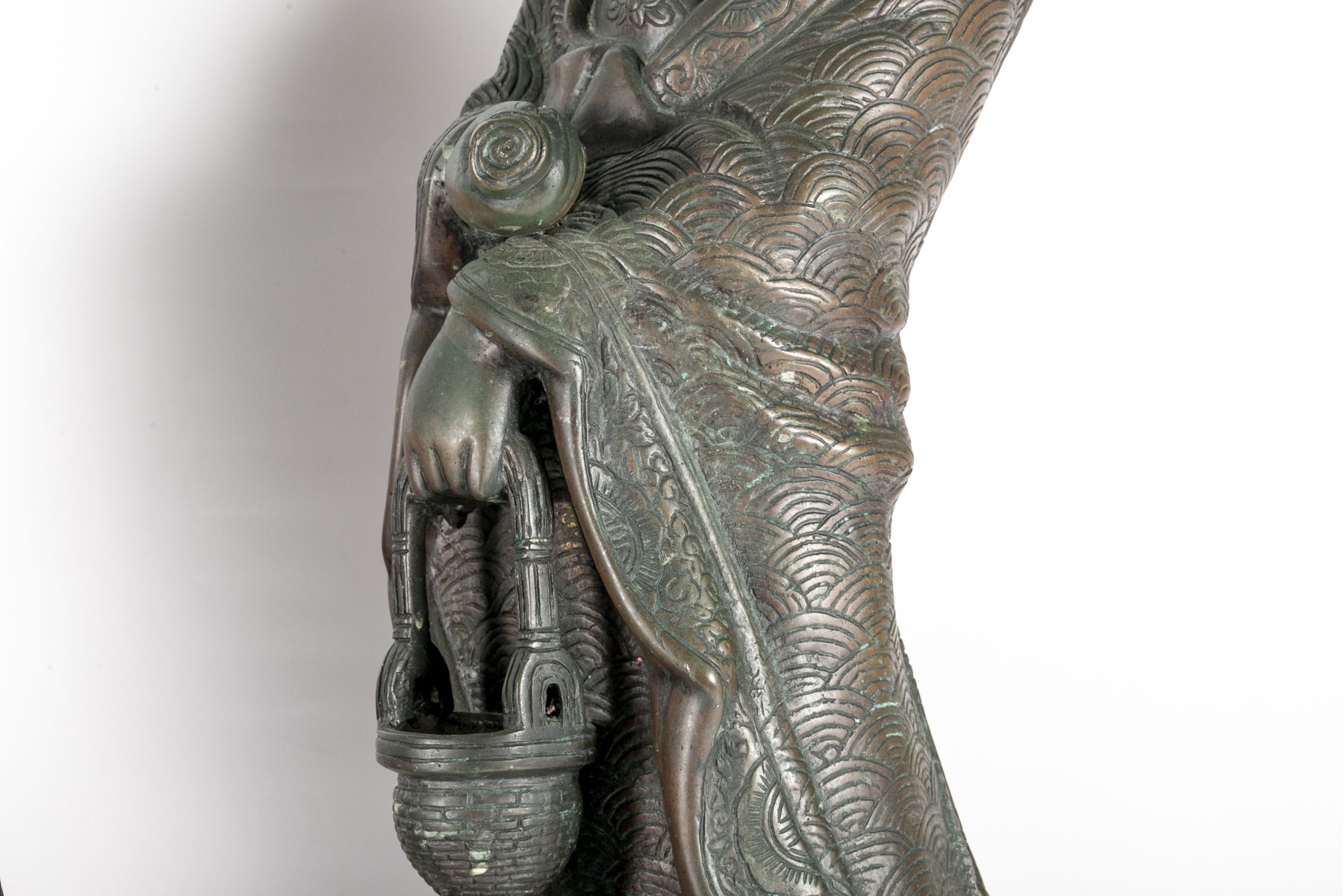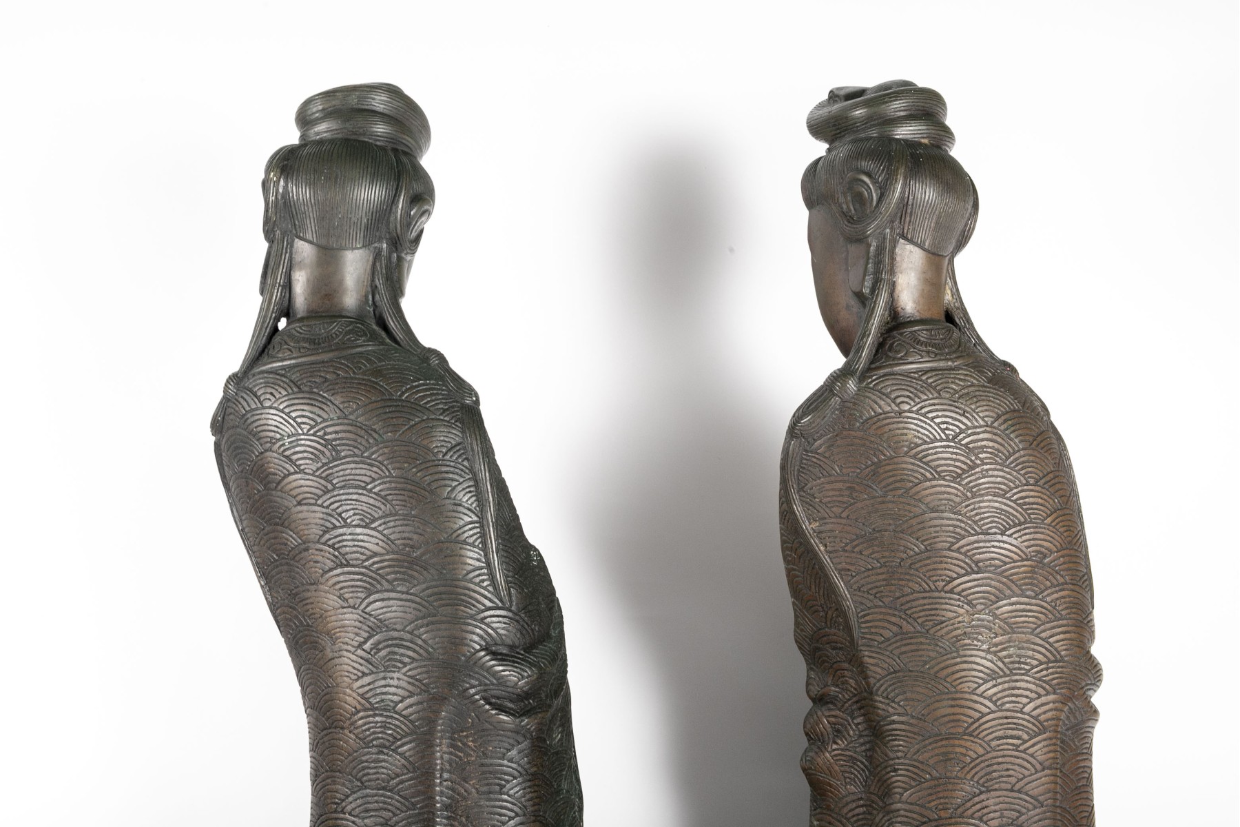 A matching pair of large Chinese Guanyin metal sculptures. She stands in a graceful pose, holding a scroll and a bucket while wearing beautiful robes detailed with wave motif relief.