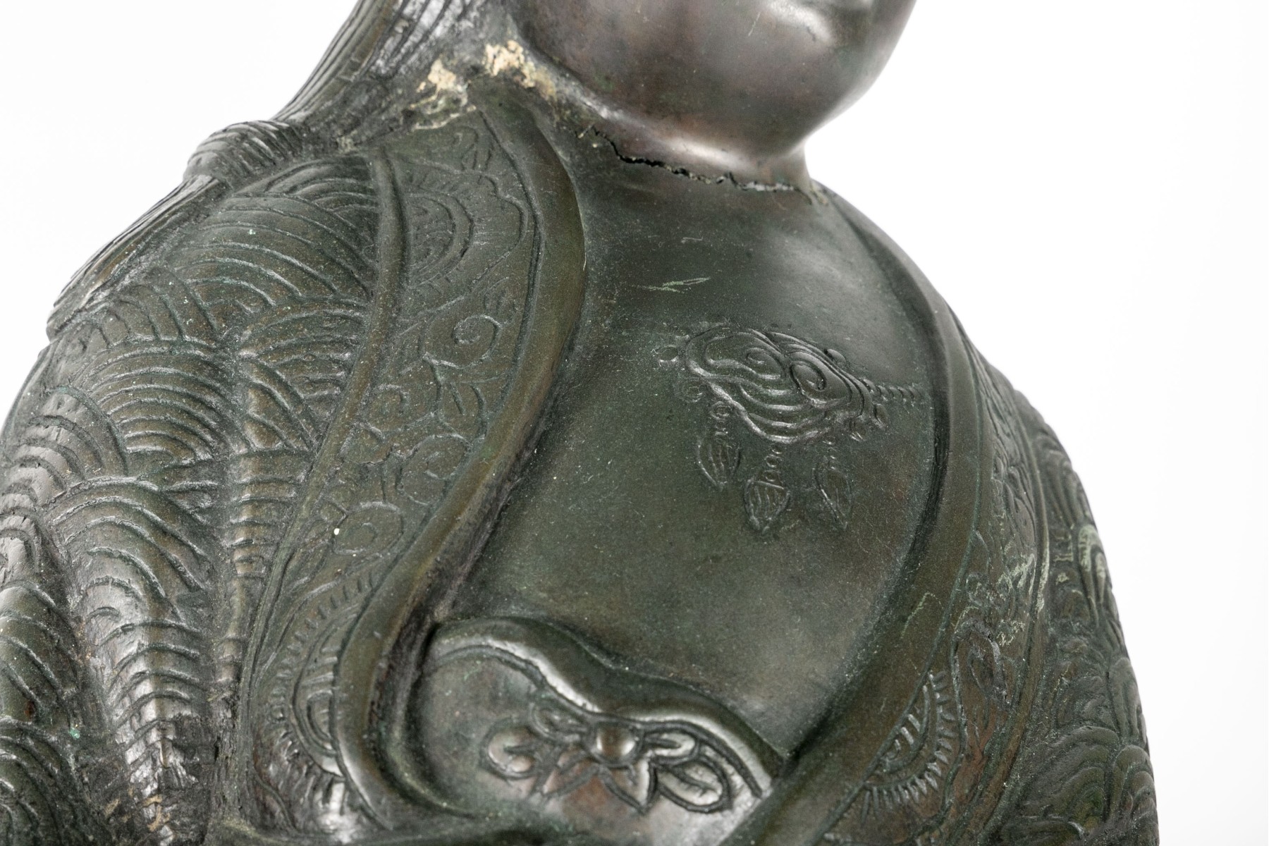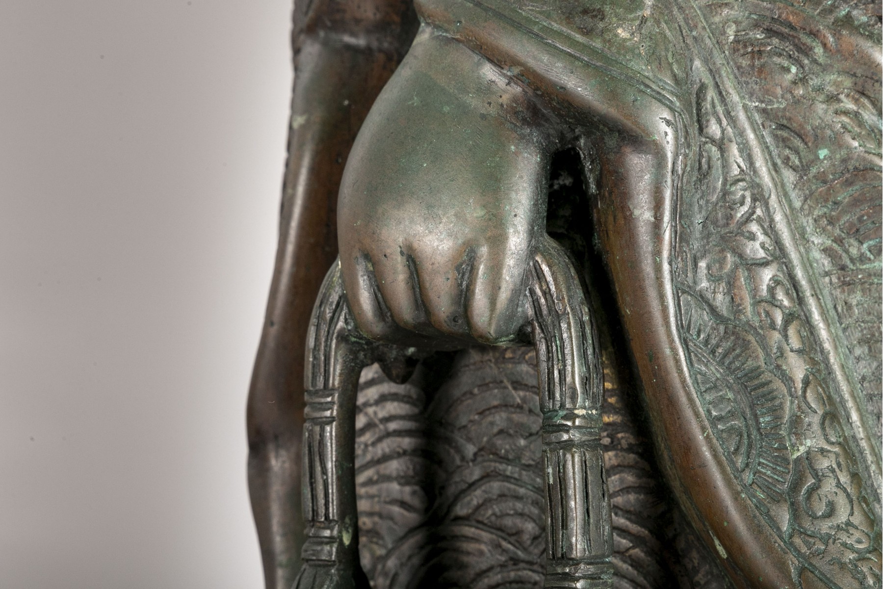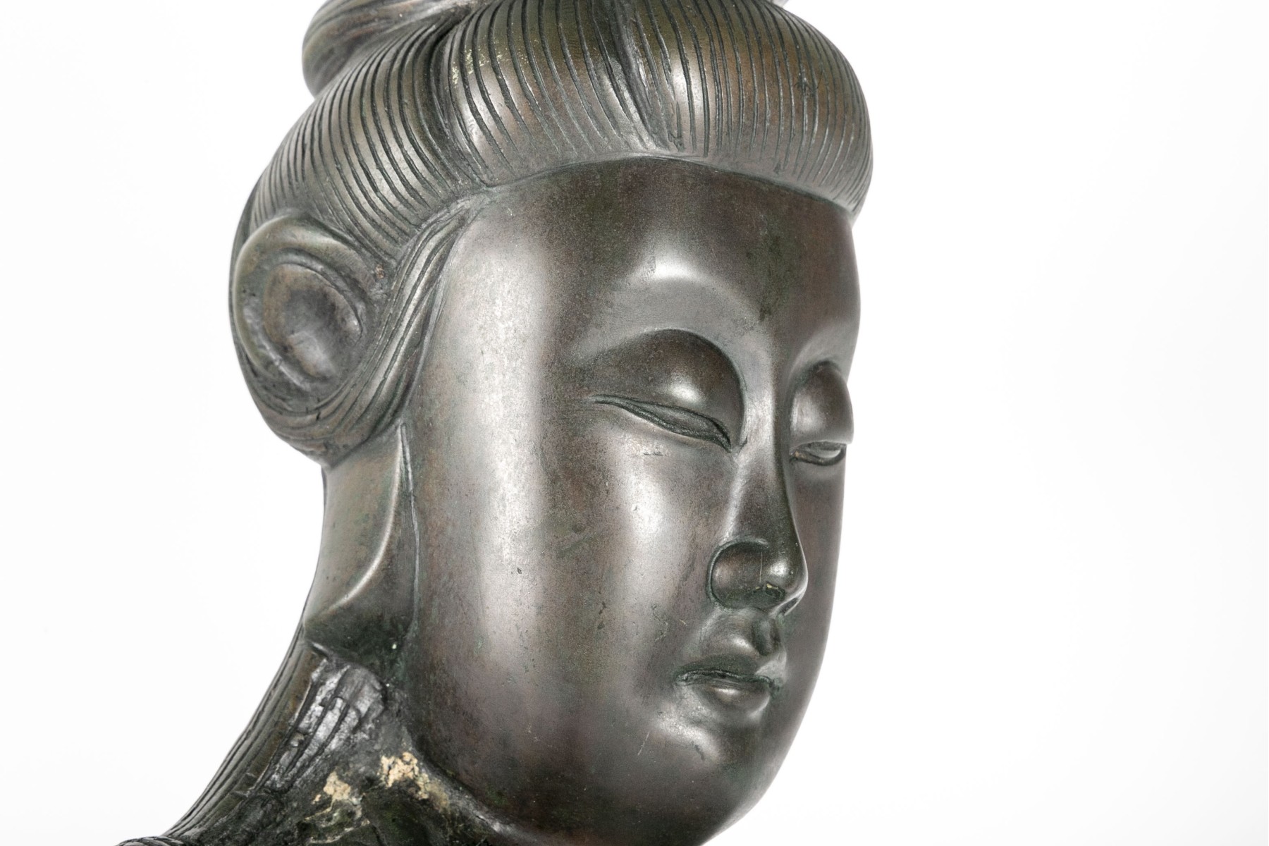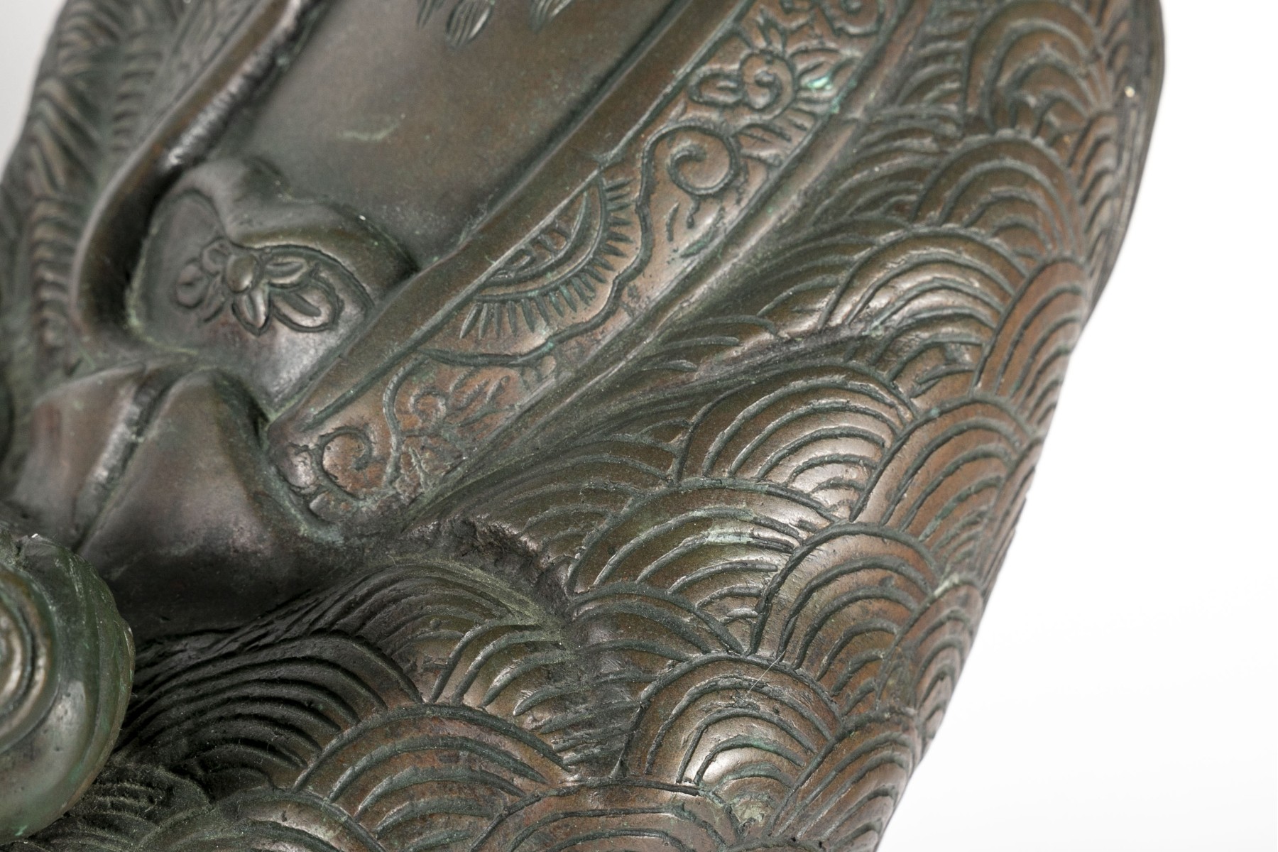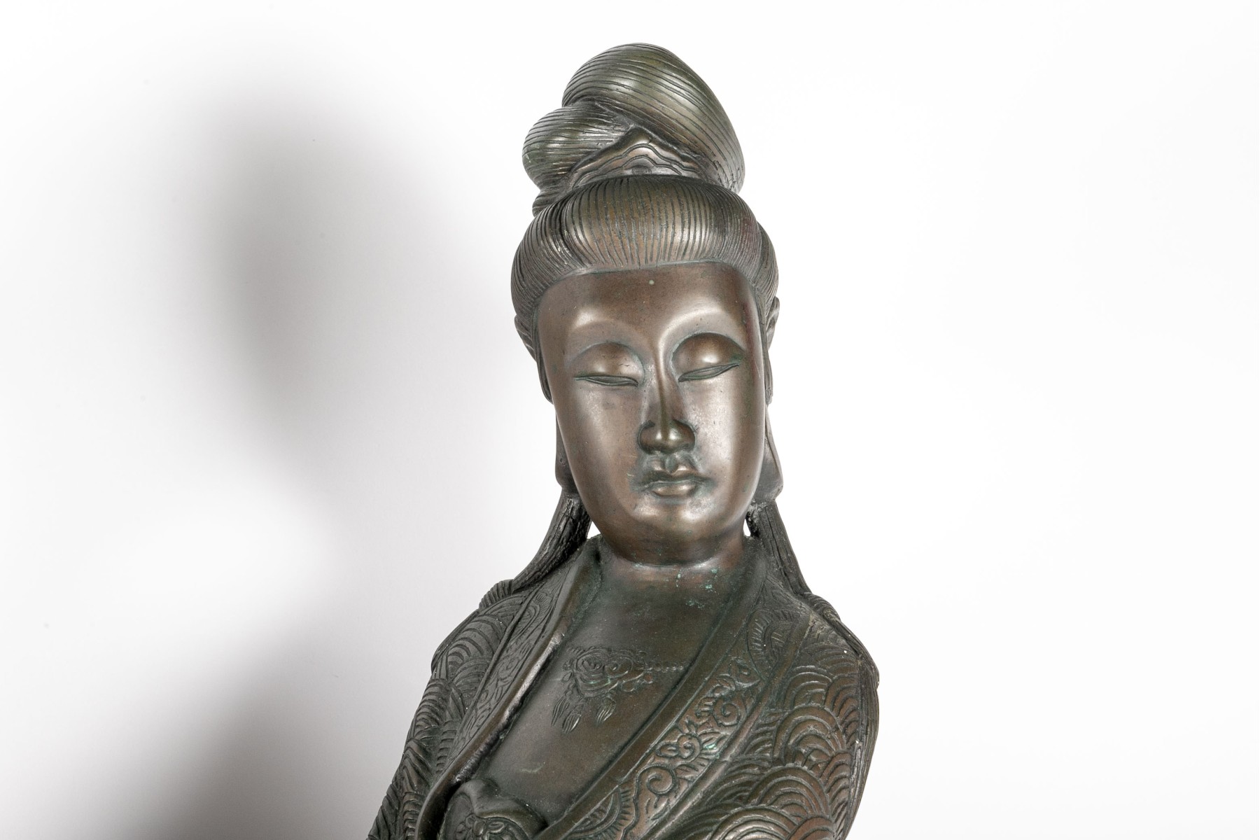 A matching pair of large Chinese Guanyin metal sculptures. She stands in a graceful pose, holding a scroll and a bucket while wearing beautiful robes detailed with wave motif relief.