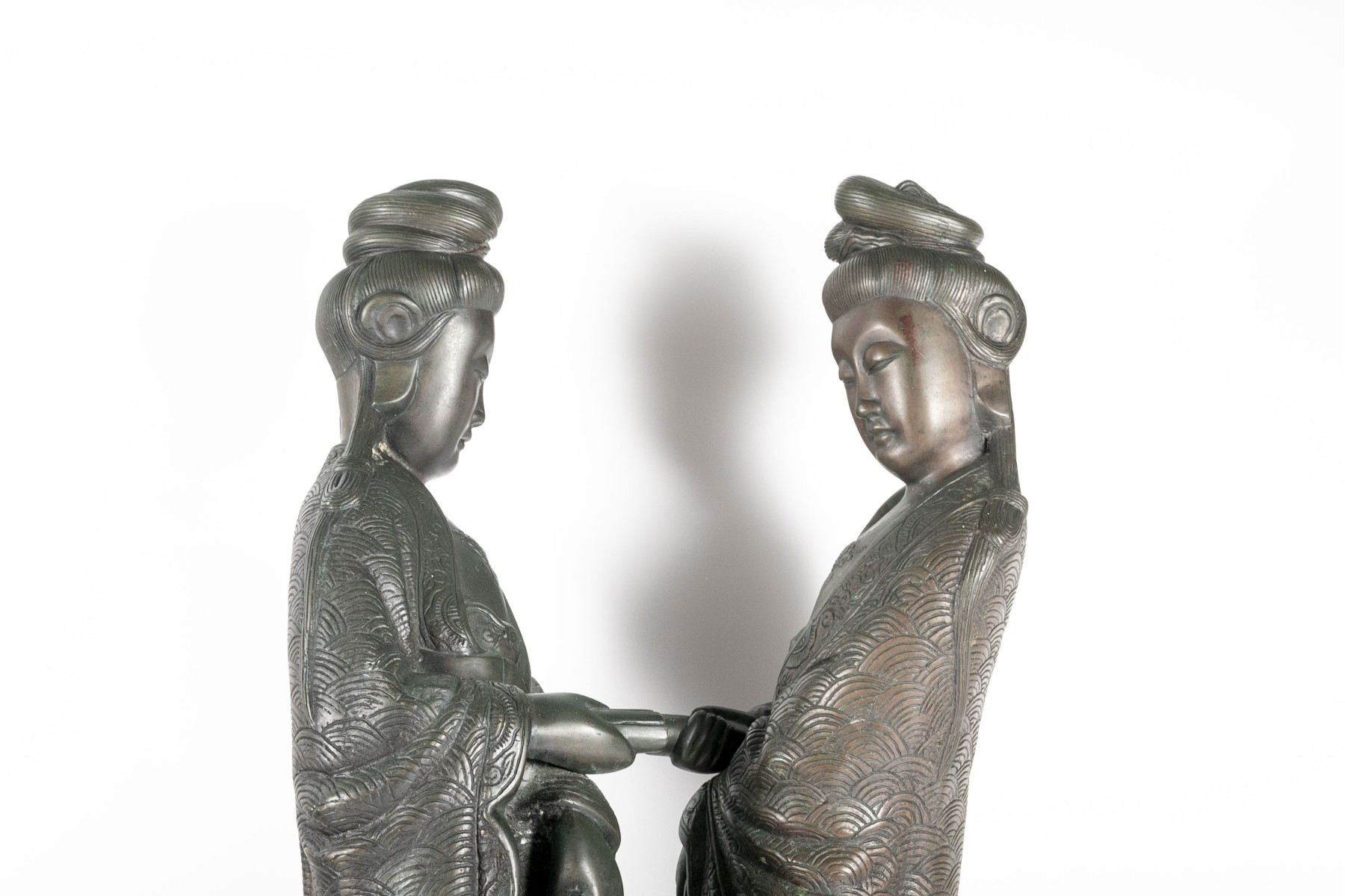 Wear commensurate with age including a crack along one of the statue's neck; scuffs, nicks, and checking to the bases. Please review the pictures as they are a part of the condition report.