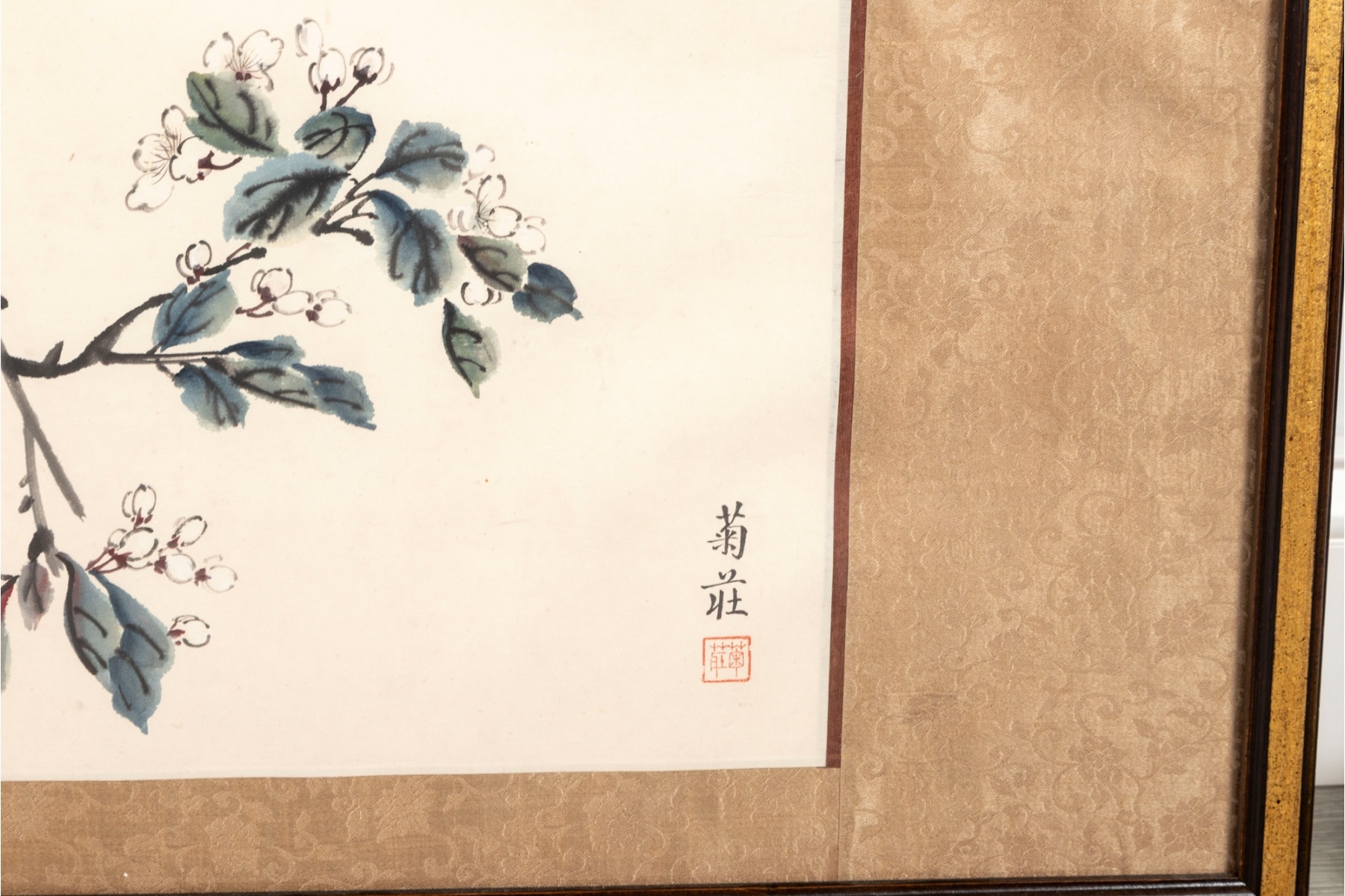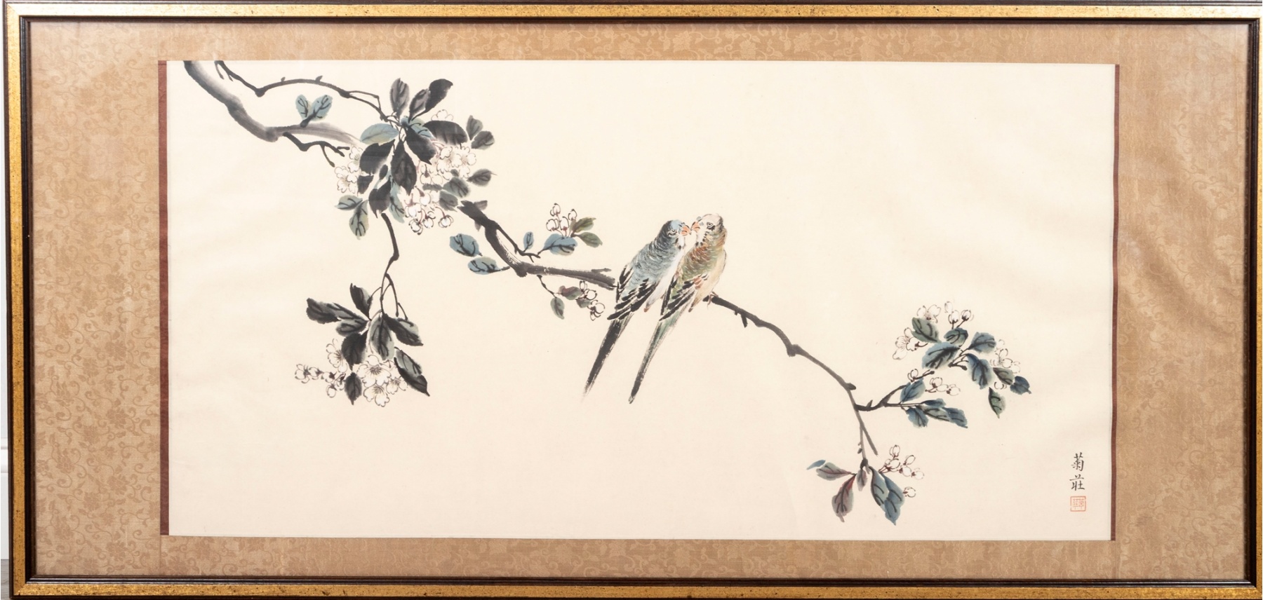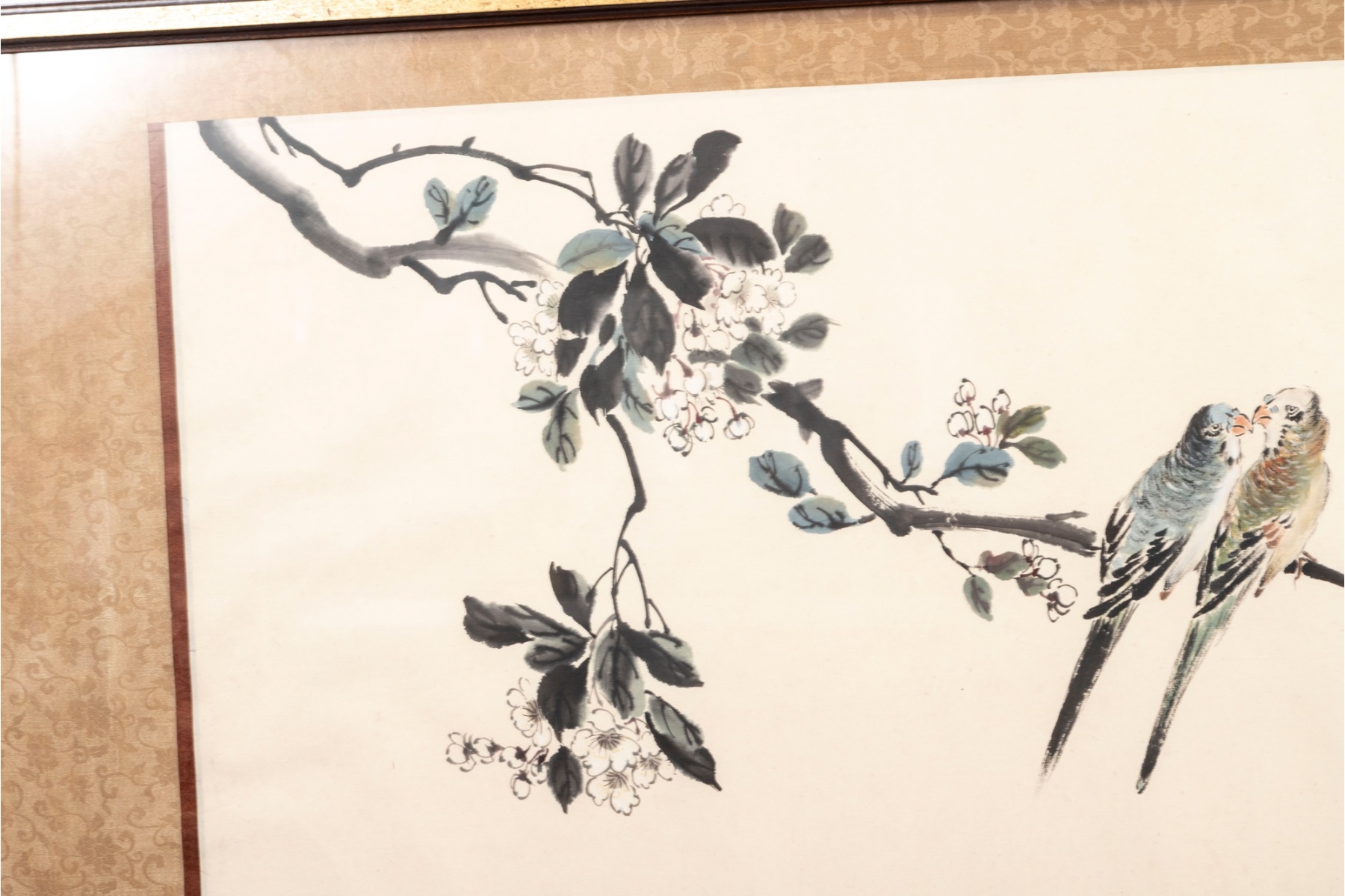 Elegant Chinese ink and watercolor painting depicting two birds perched on a blossoming branch, rendered with delicate brushwork and subtle coloration. Presented with a patterned silk border and gilt frame under glass.