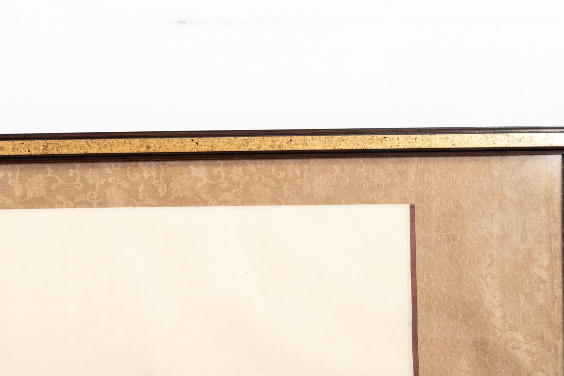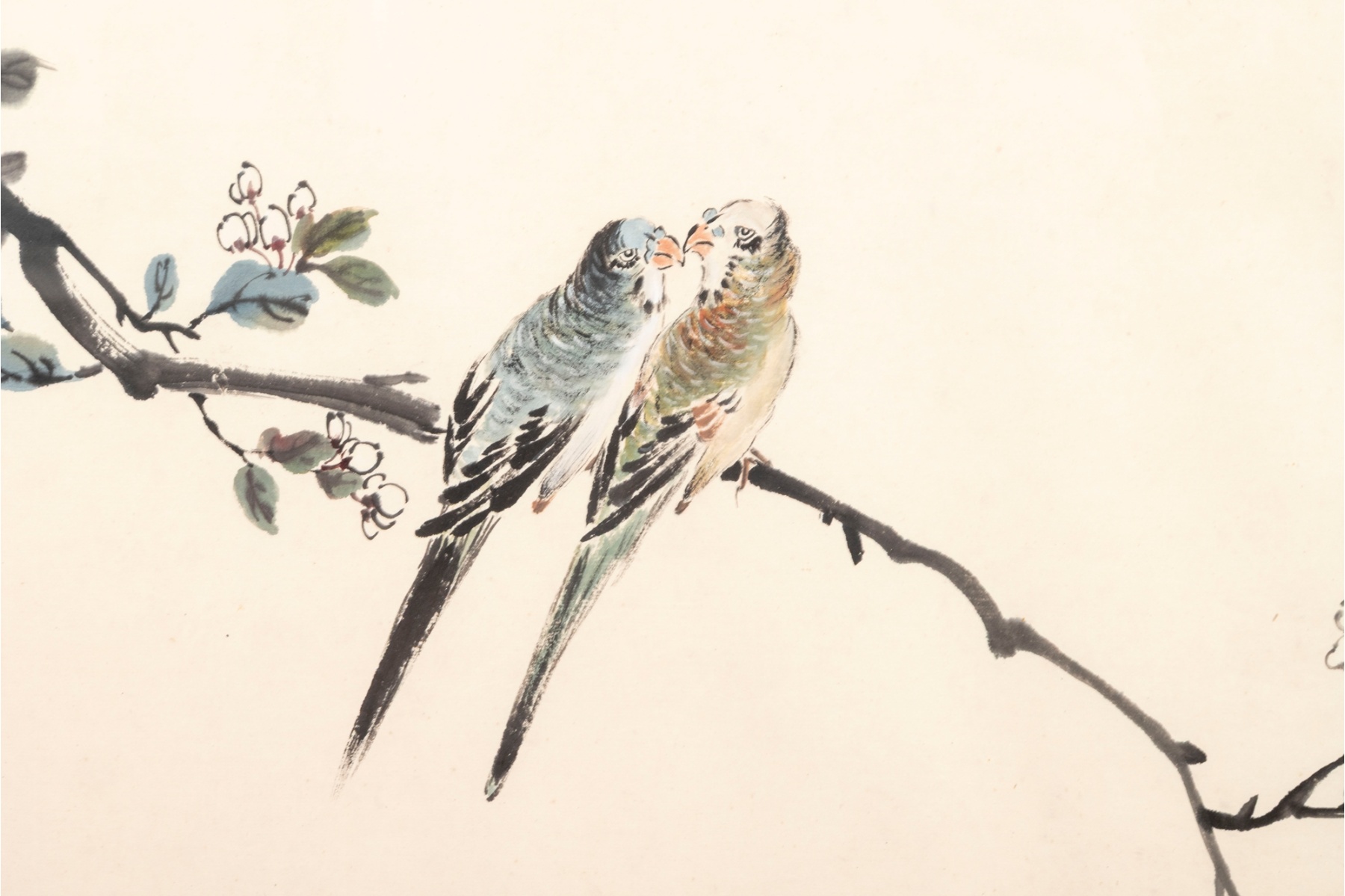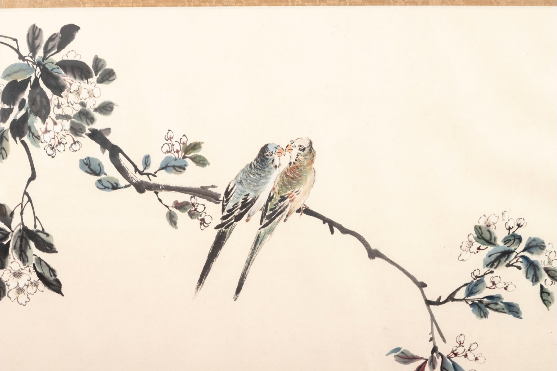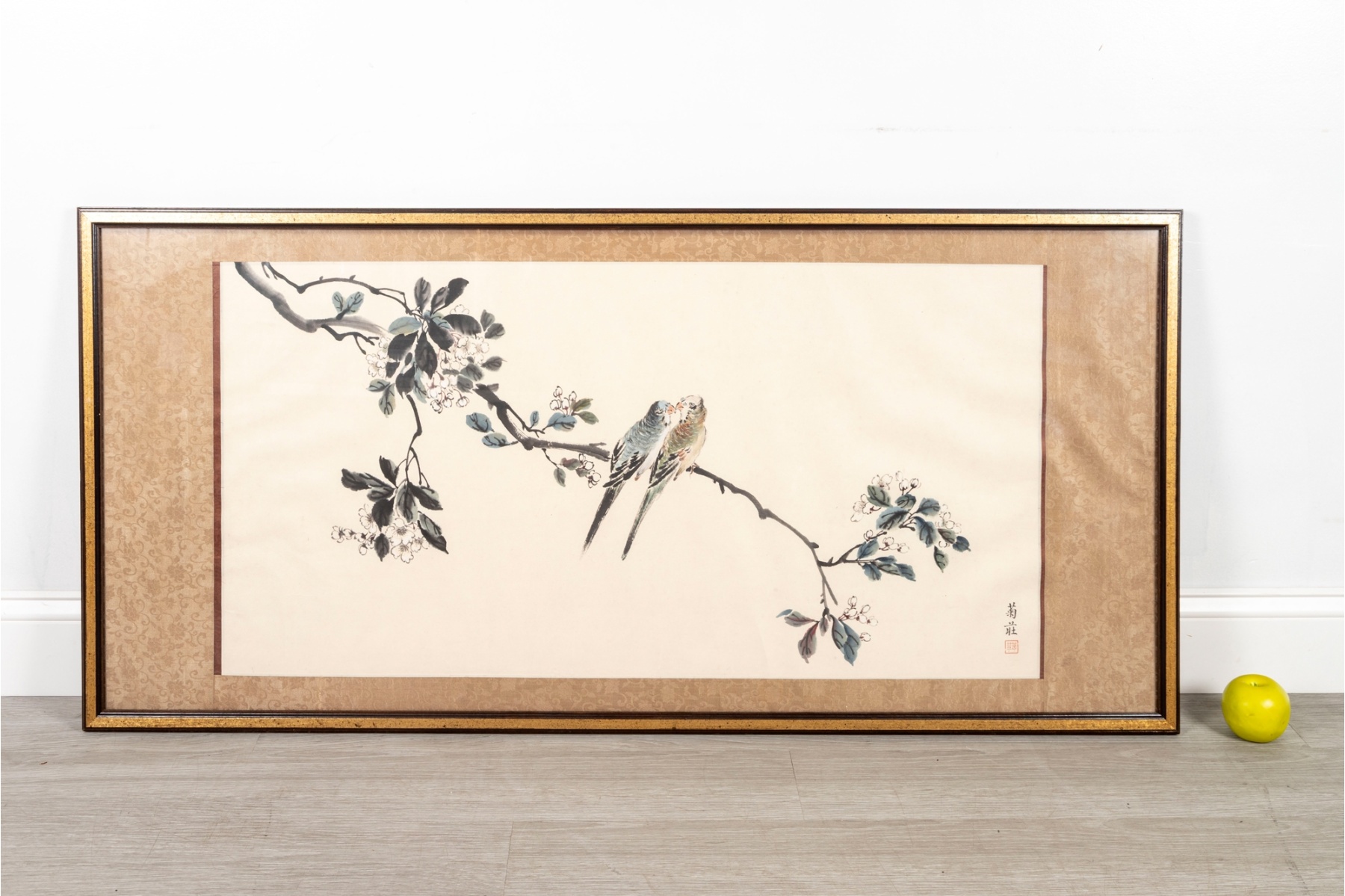 Elegant Chinese ink and watercolor painting depicting two birds perched on a blossoming branch, rendered with delicate brushwork and subtle coloration. Presented with a patterned silk border and gilt frame under glass.