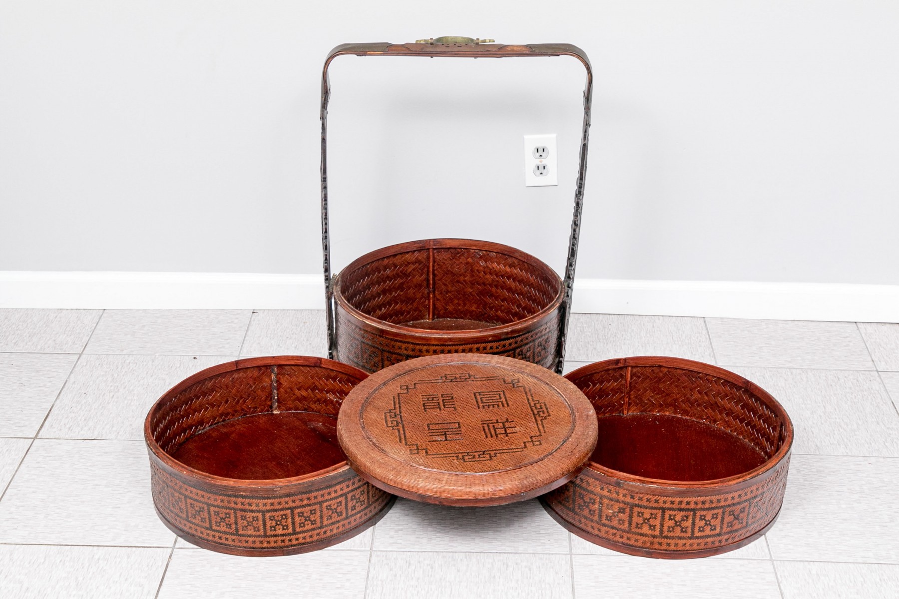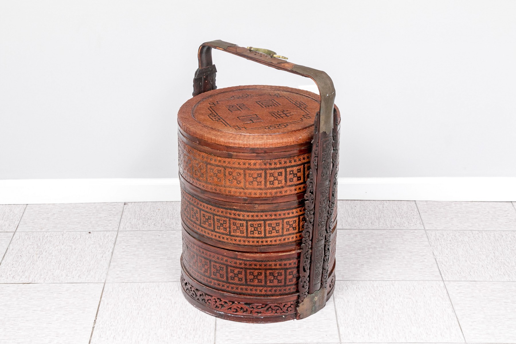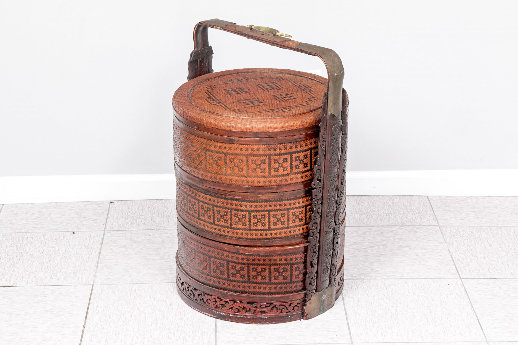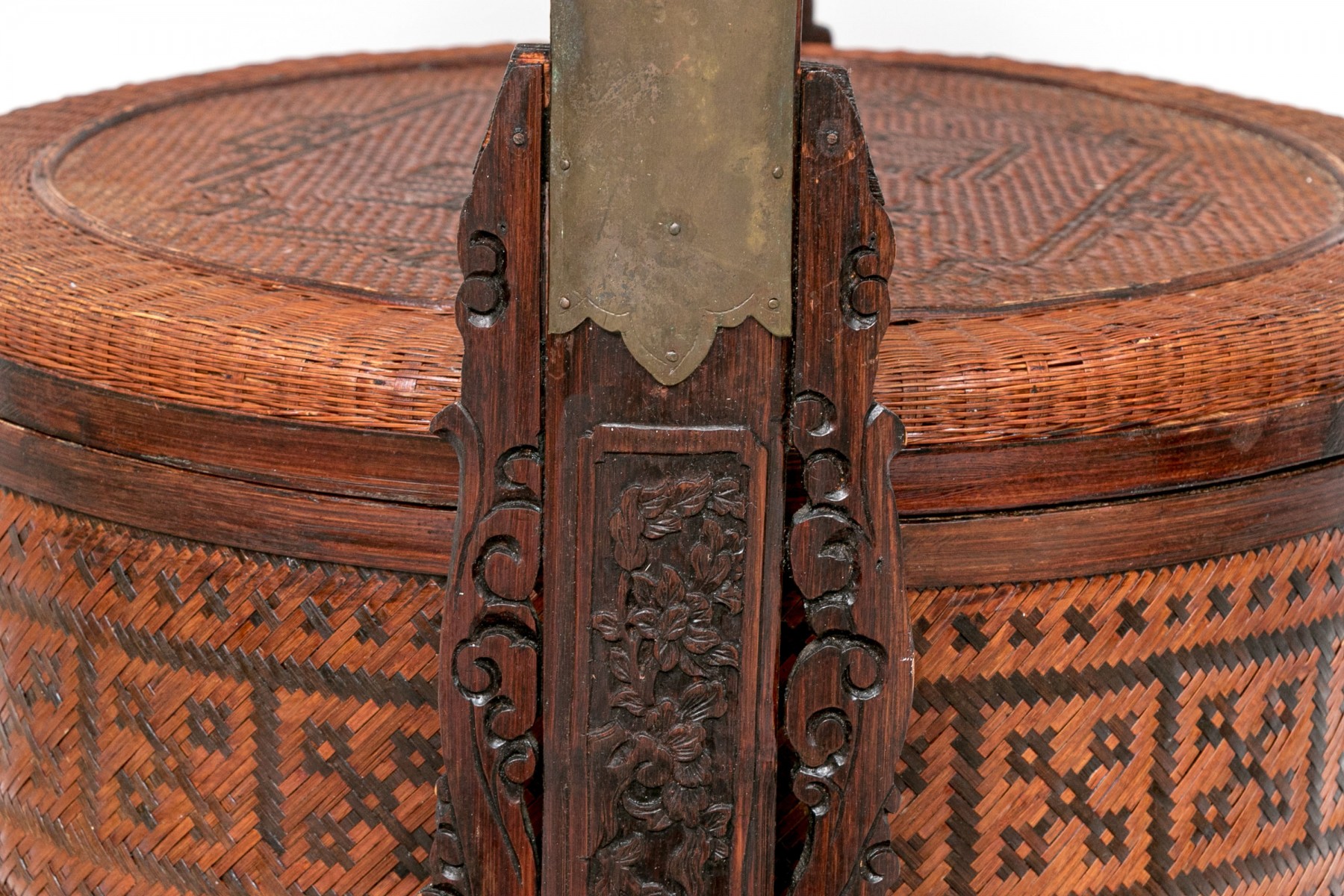 Large Chinese woven wedding basket comprised of three compartments and a lid. The basket woven with fine split wicker in geometric patterns and the lid with character marks. Decorated with metal and carved motifs.