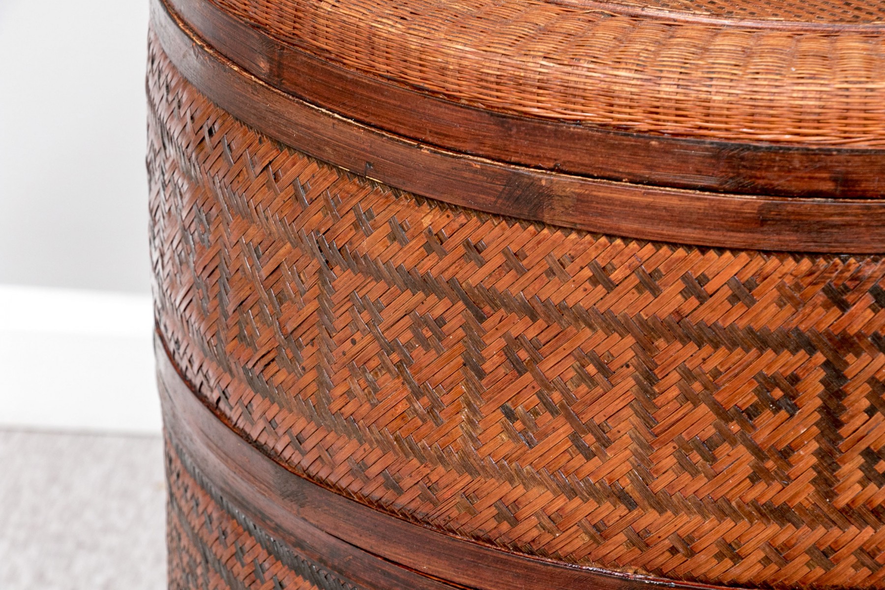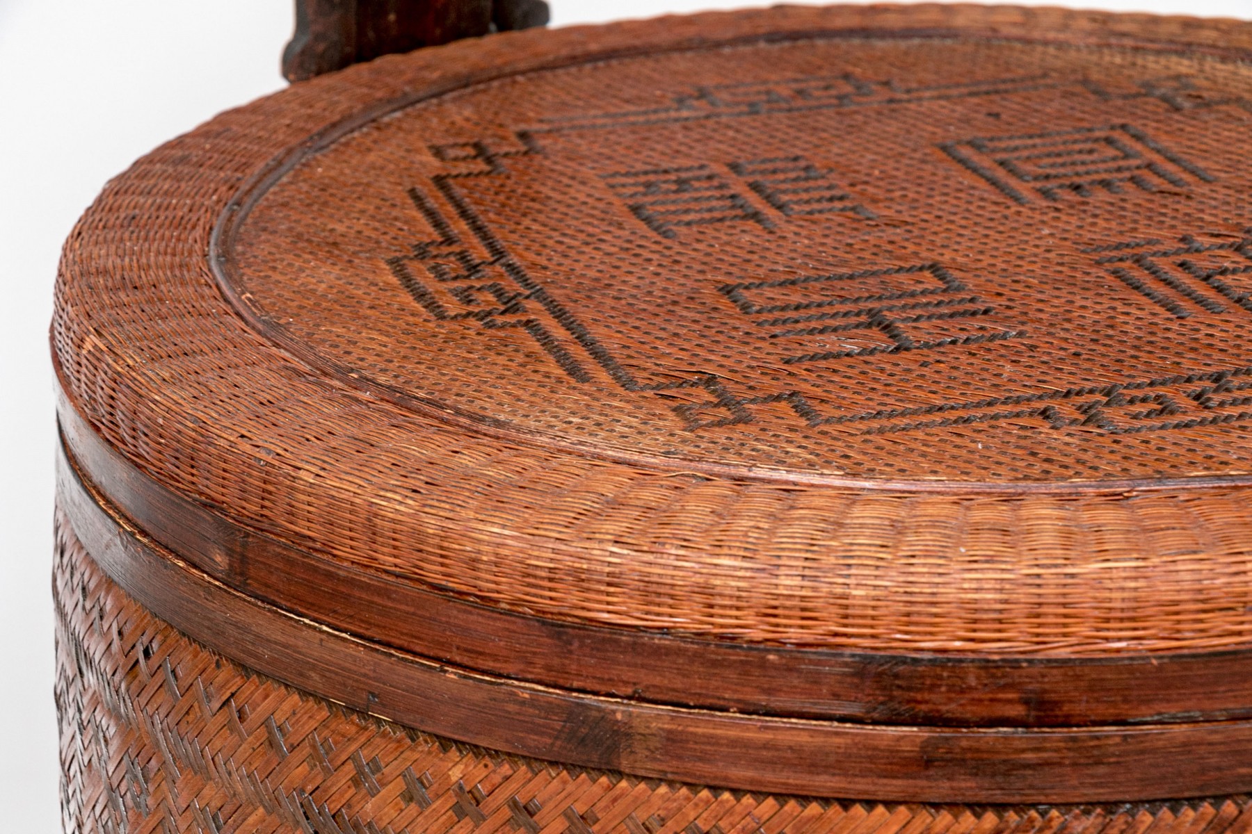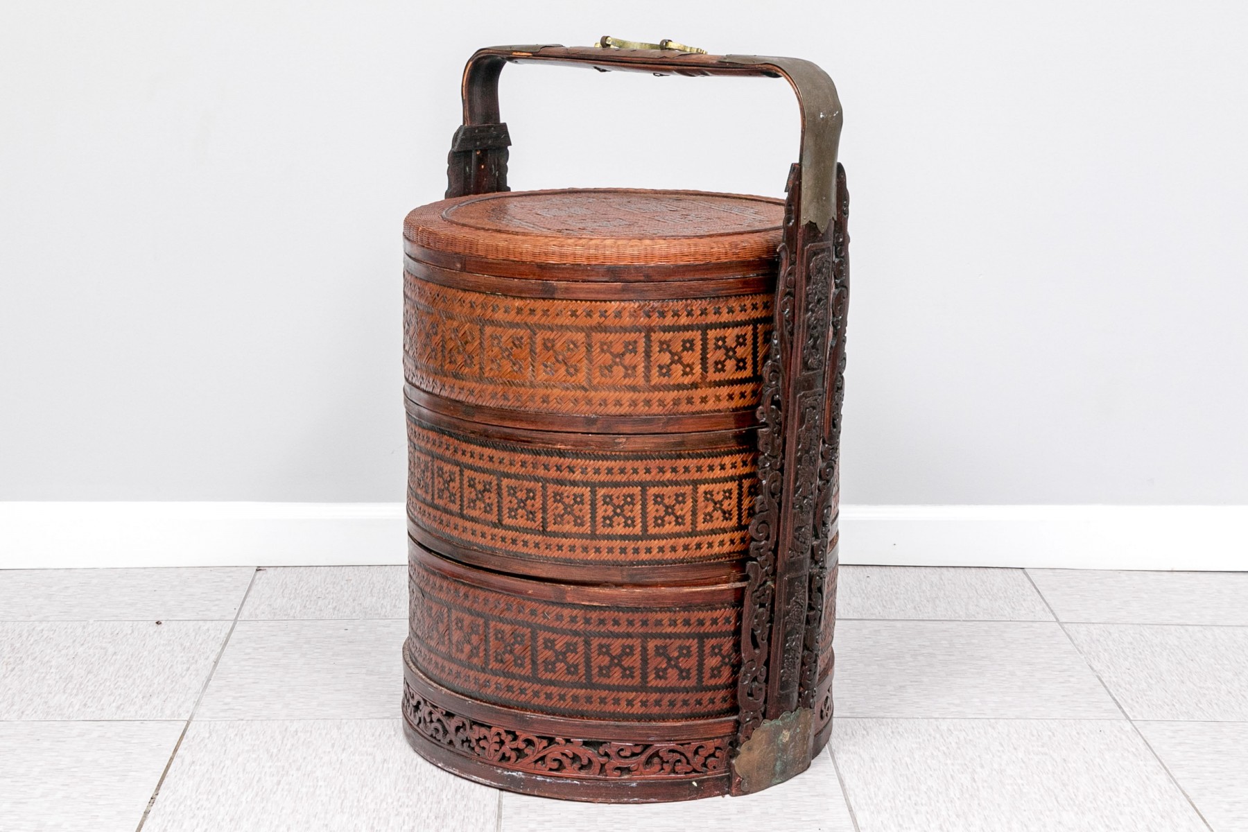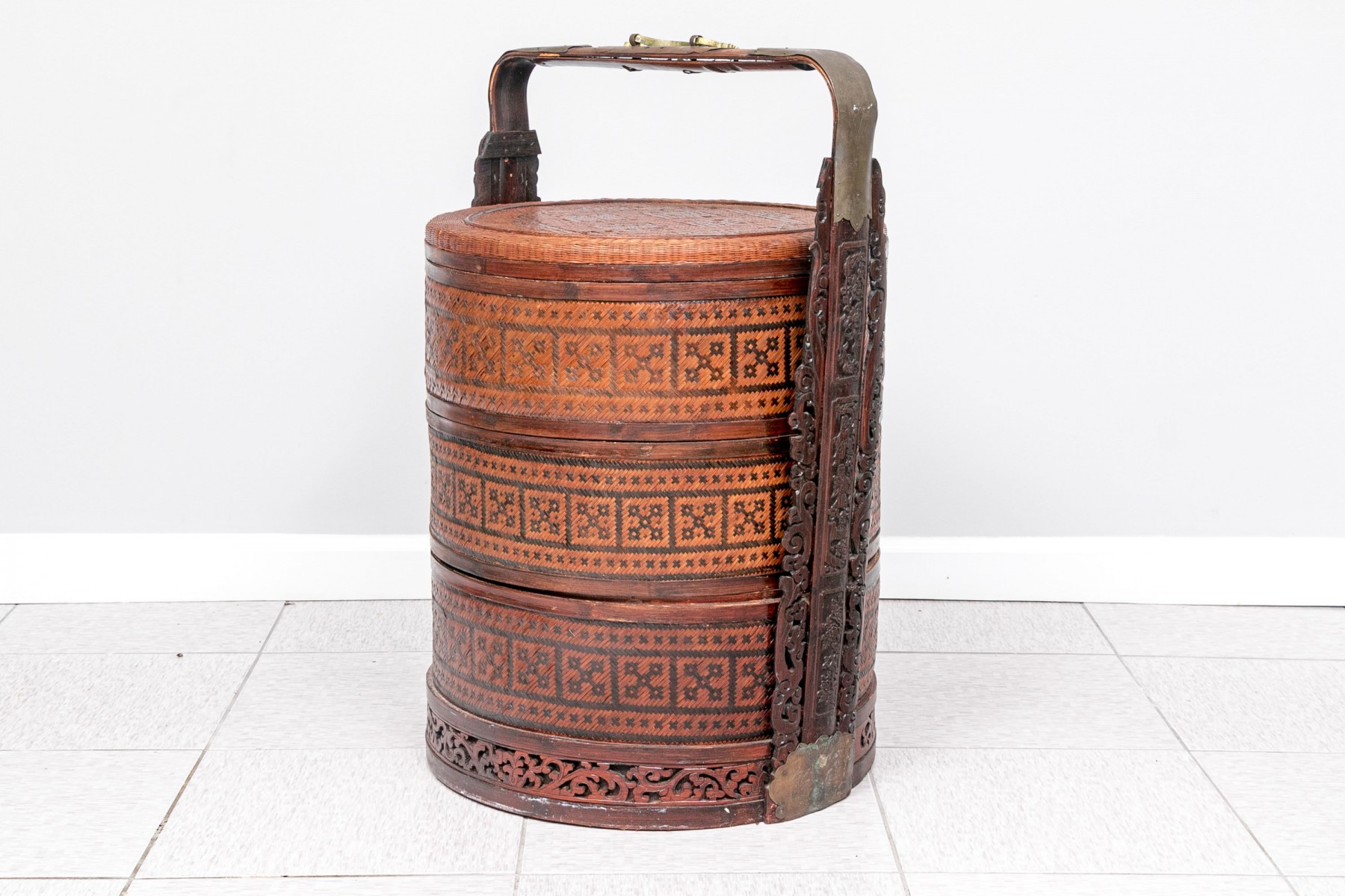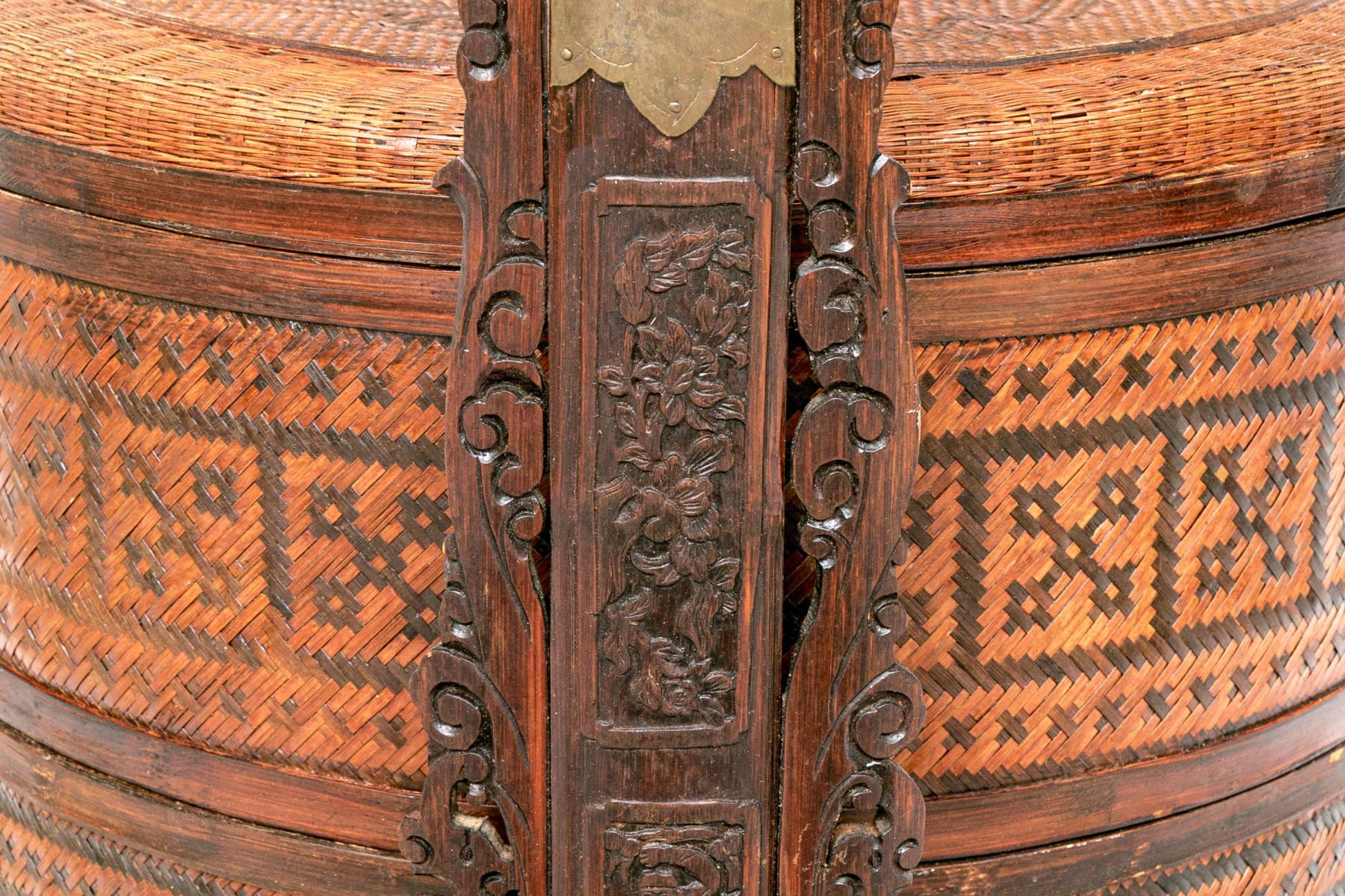 Large Chinese woven wedding basket comprised of three compartments and a lid. The basket woven with fine split wicker in geometric patterns and the lid with character marks. Decorated with metal and carved motifs.