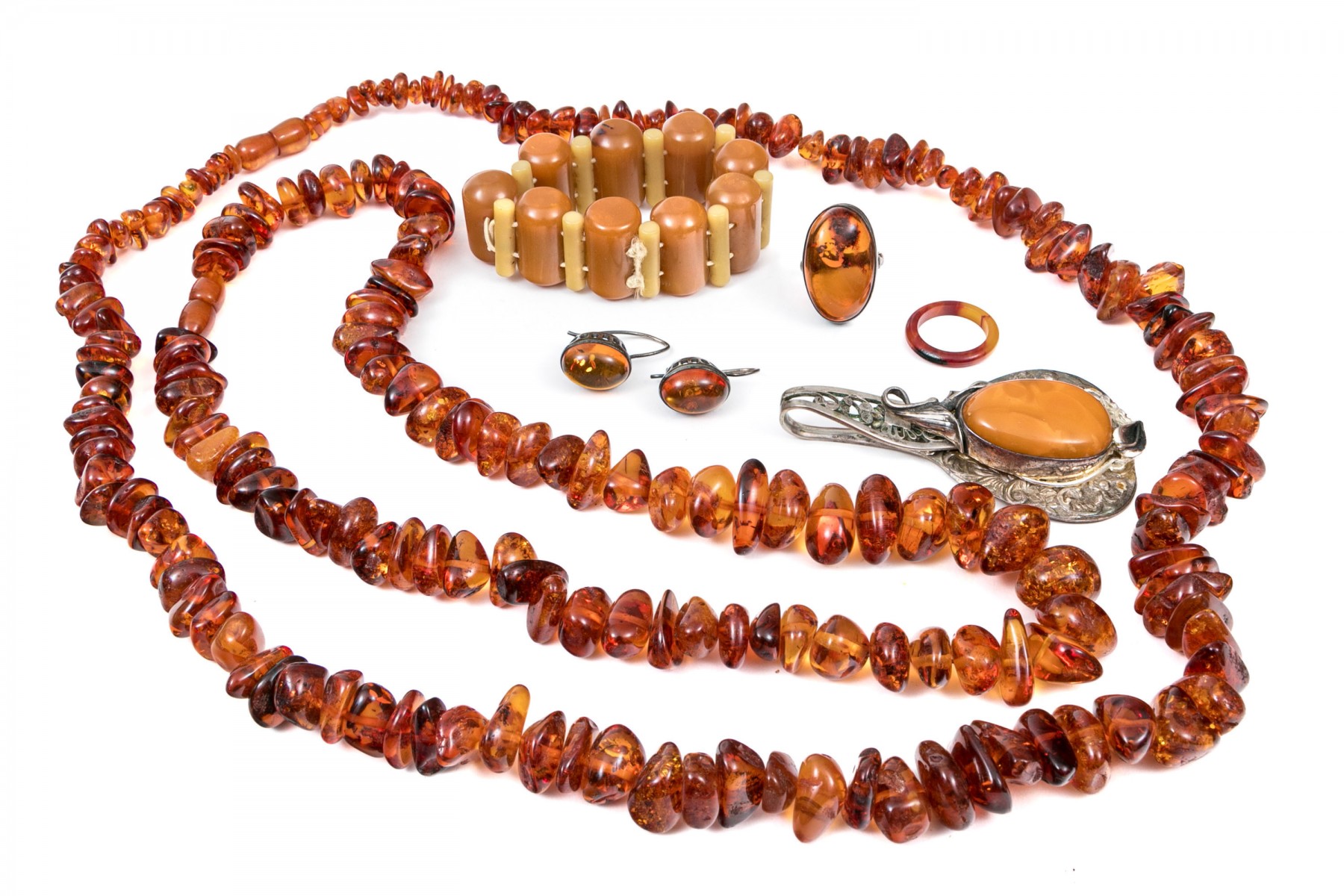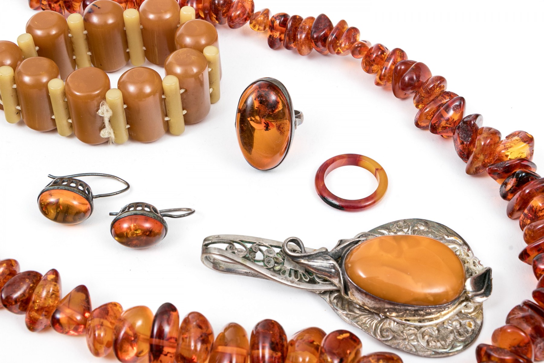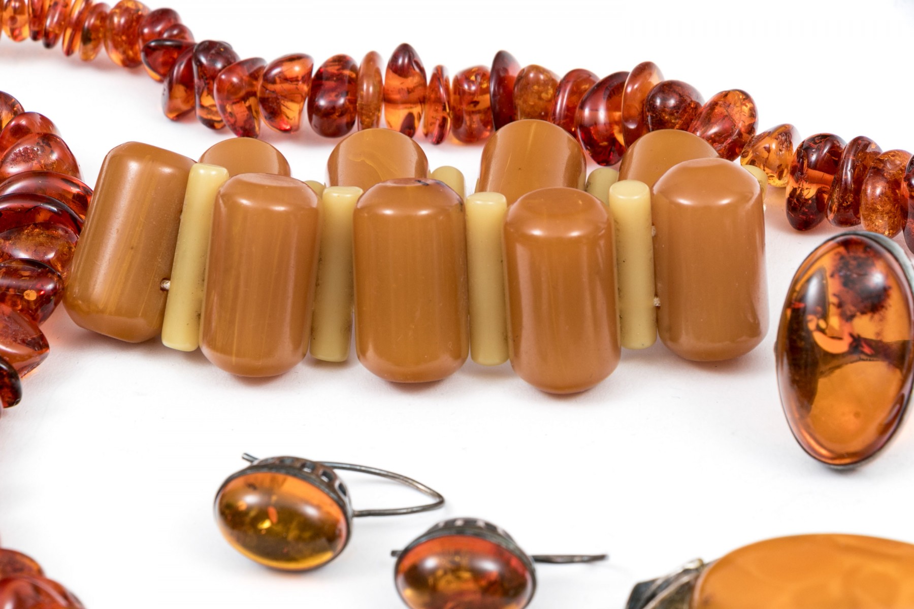 Large group of amber beaded jewelry. Two necklaces of tumbled beads, opaque beaded bracelet and pendant. The earrings have hook style backings. Both rings are size 6.5.
