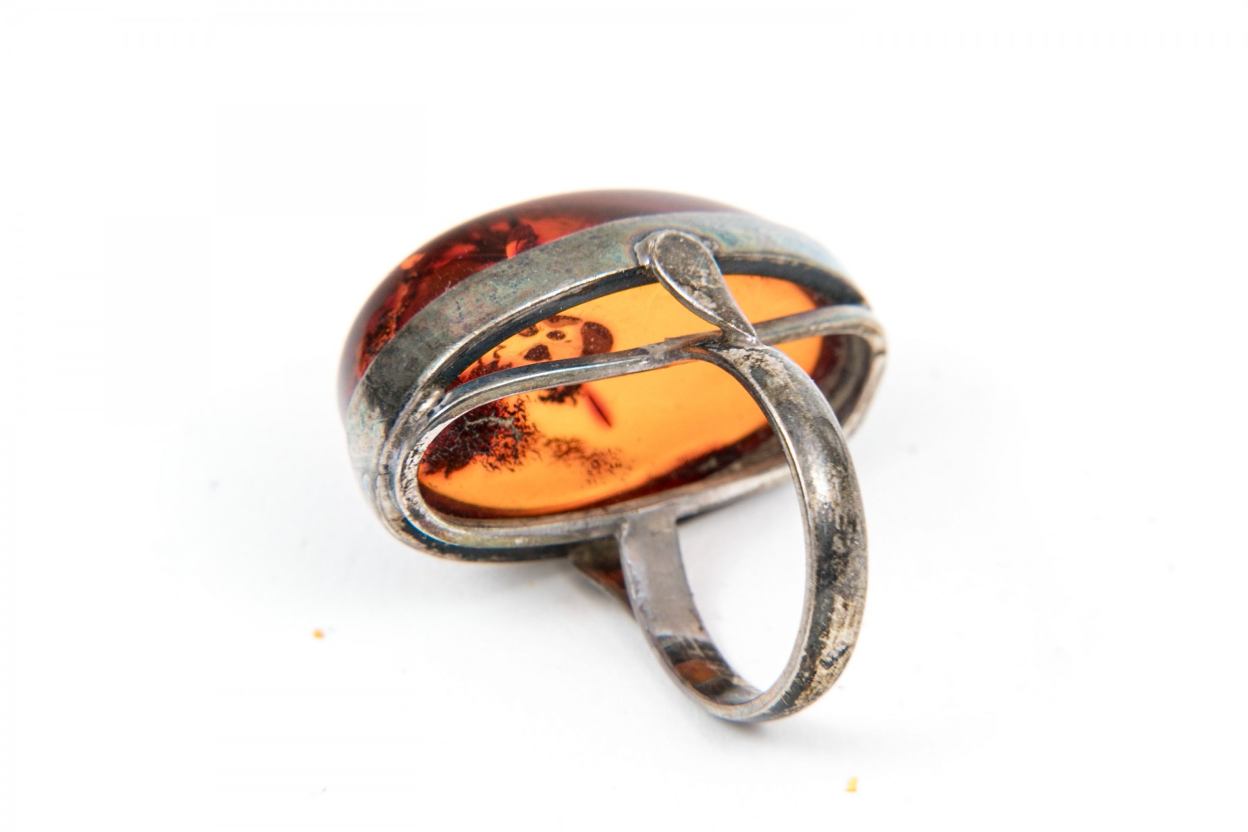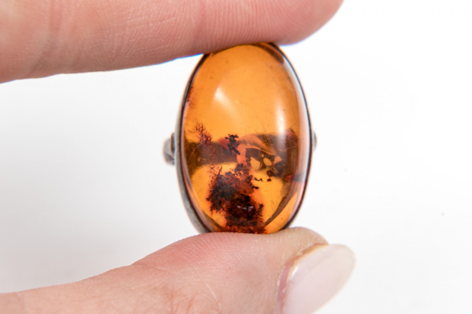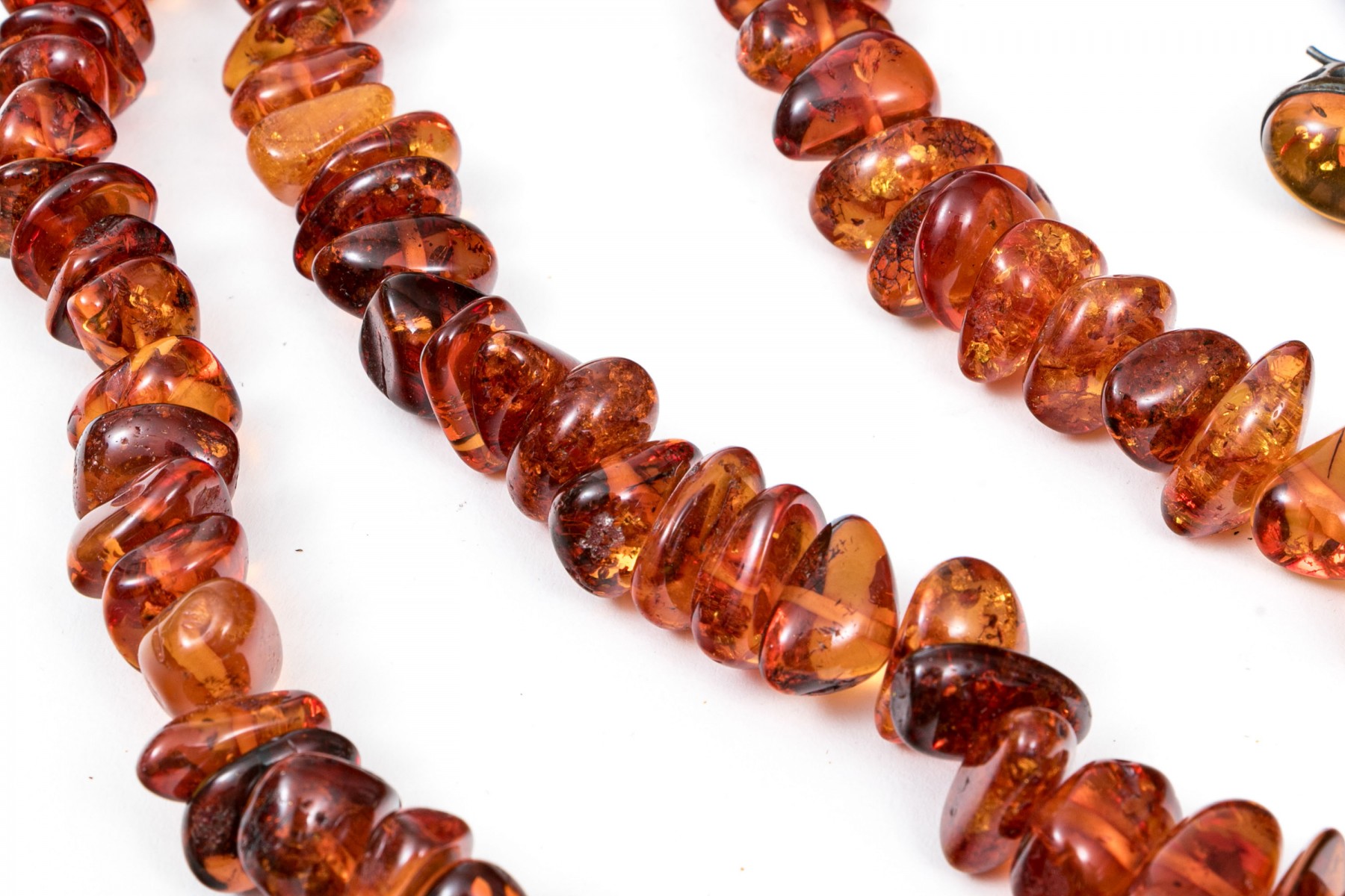 Large group of amber beaded jewelry. Two necklaces of tumbled beads, opaque beaded bracelet and pendant. The earrings have hook style backings. Both rings are size 6.5.