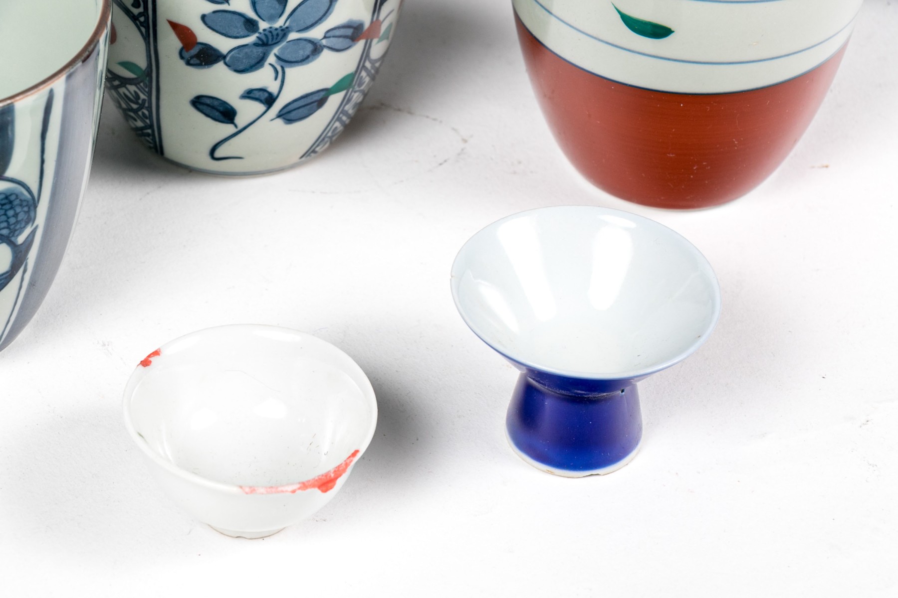 Along with two tiny wine cups- chip to one base edge, specks of red coloring on the other rim