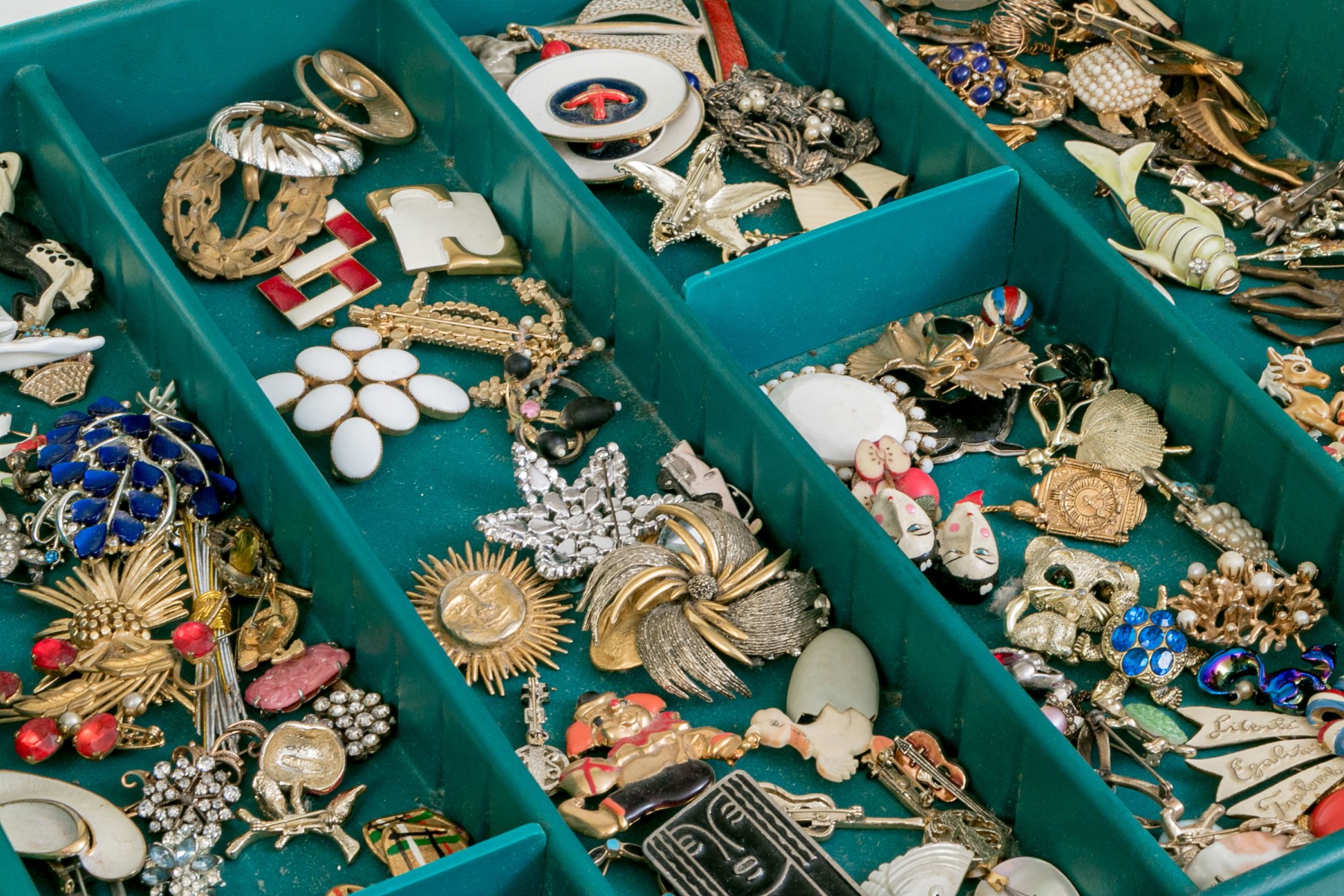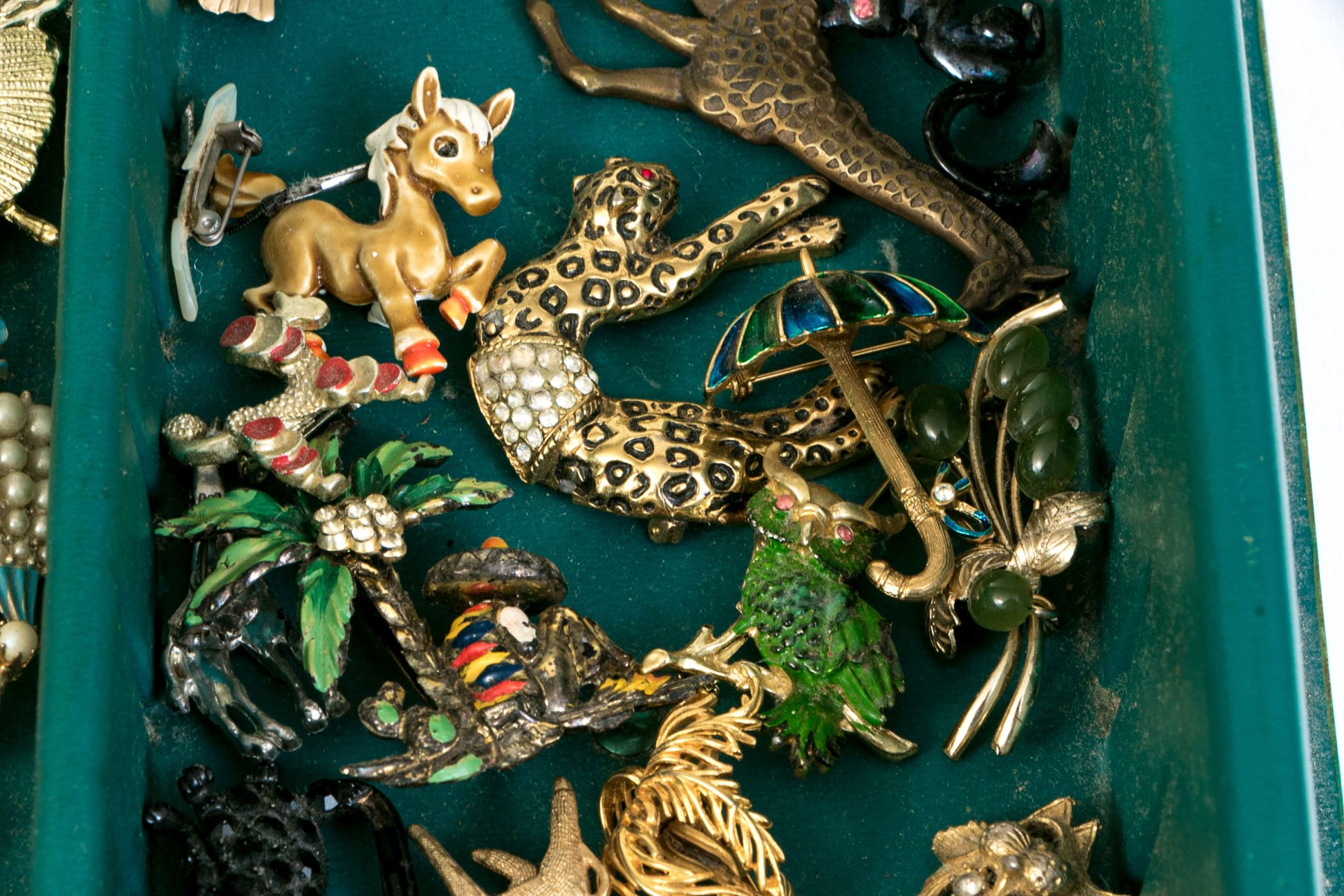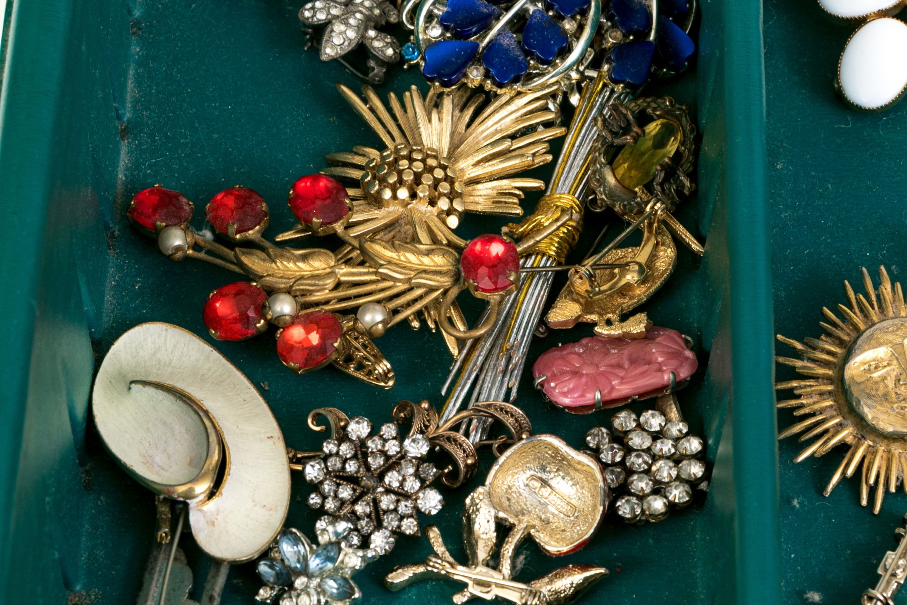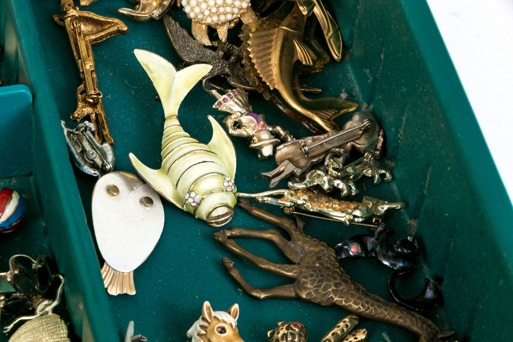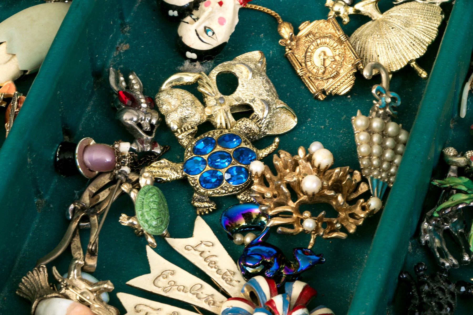 Approximately 75 brooches and earrings. Dimensions: 2 3/4” L, largest