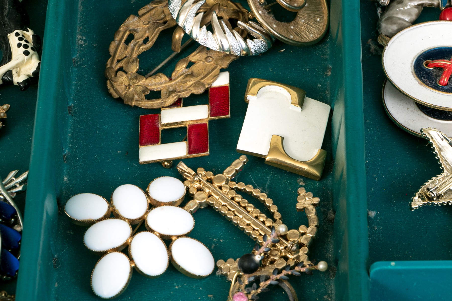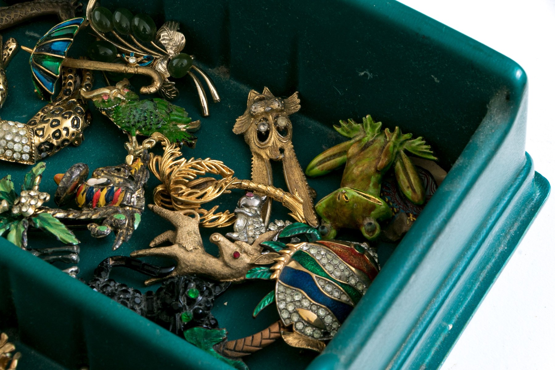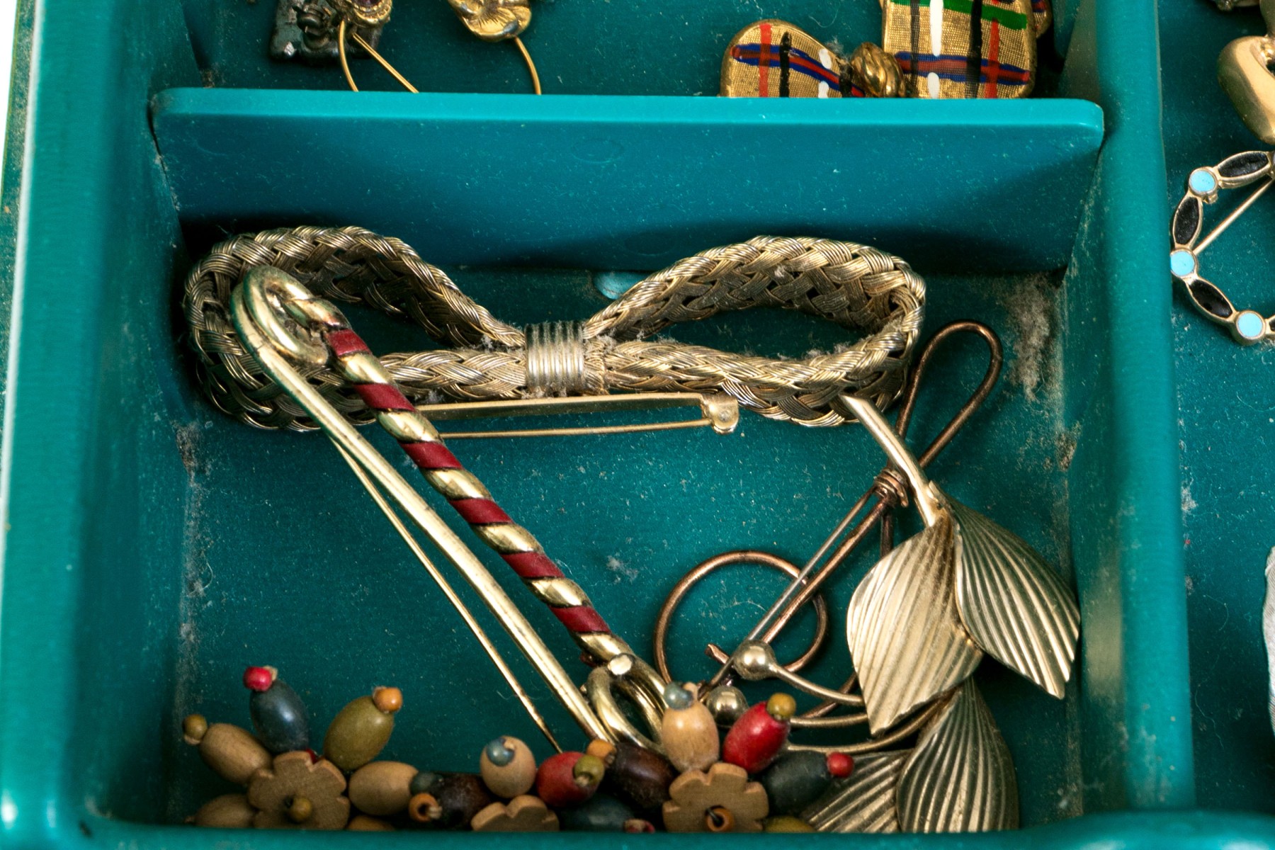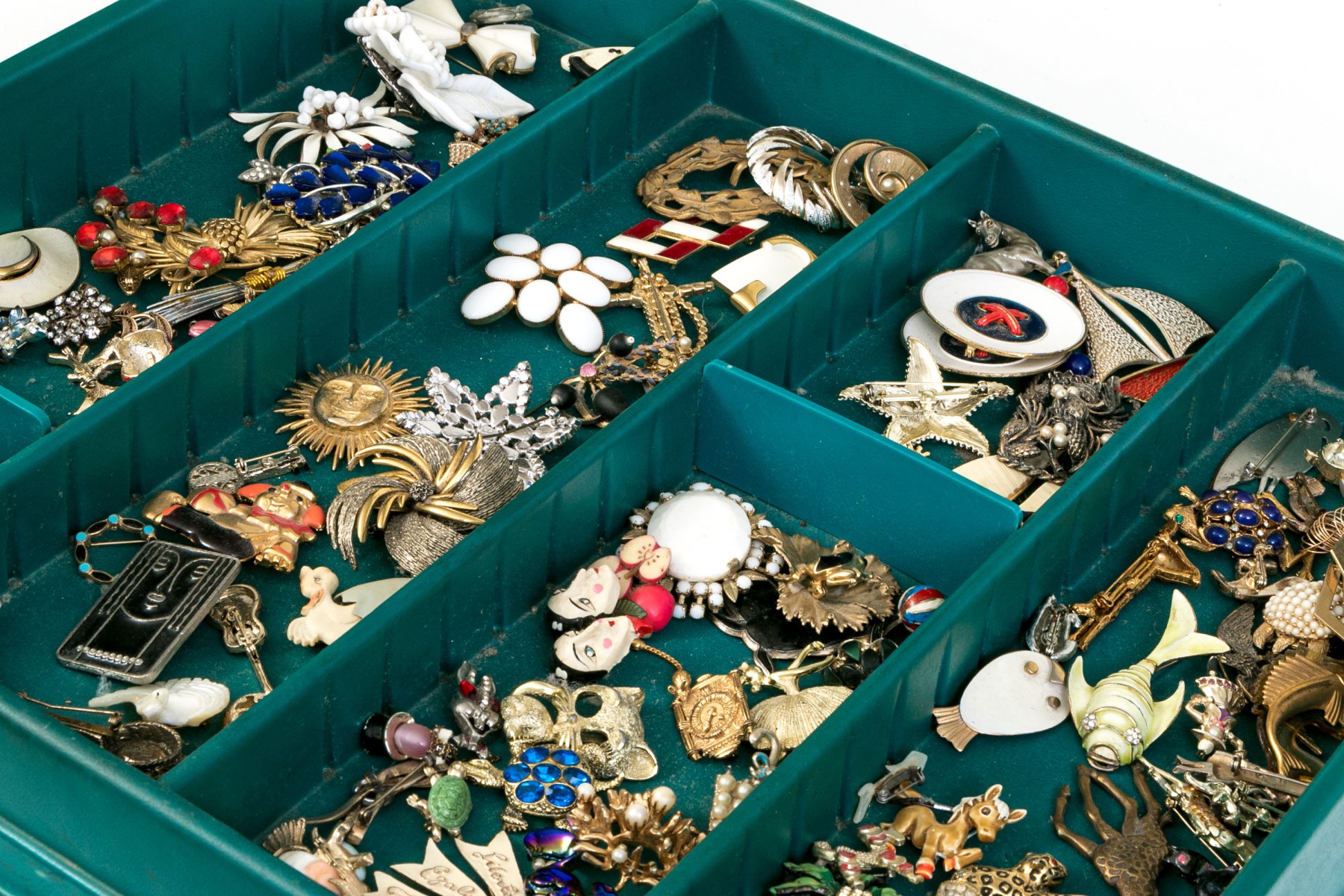 Approximately 75 brooches and earrings. Dimensions: 2 3/4” L, largest