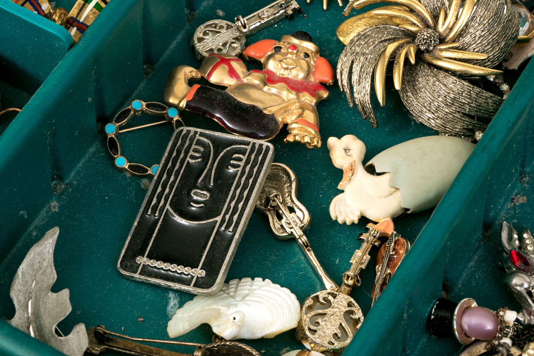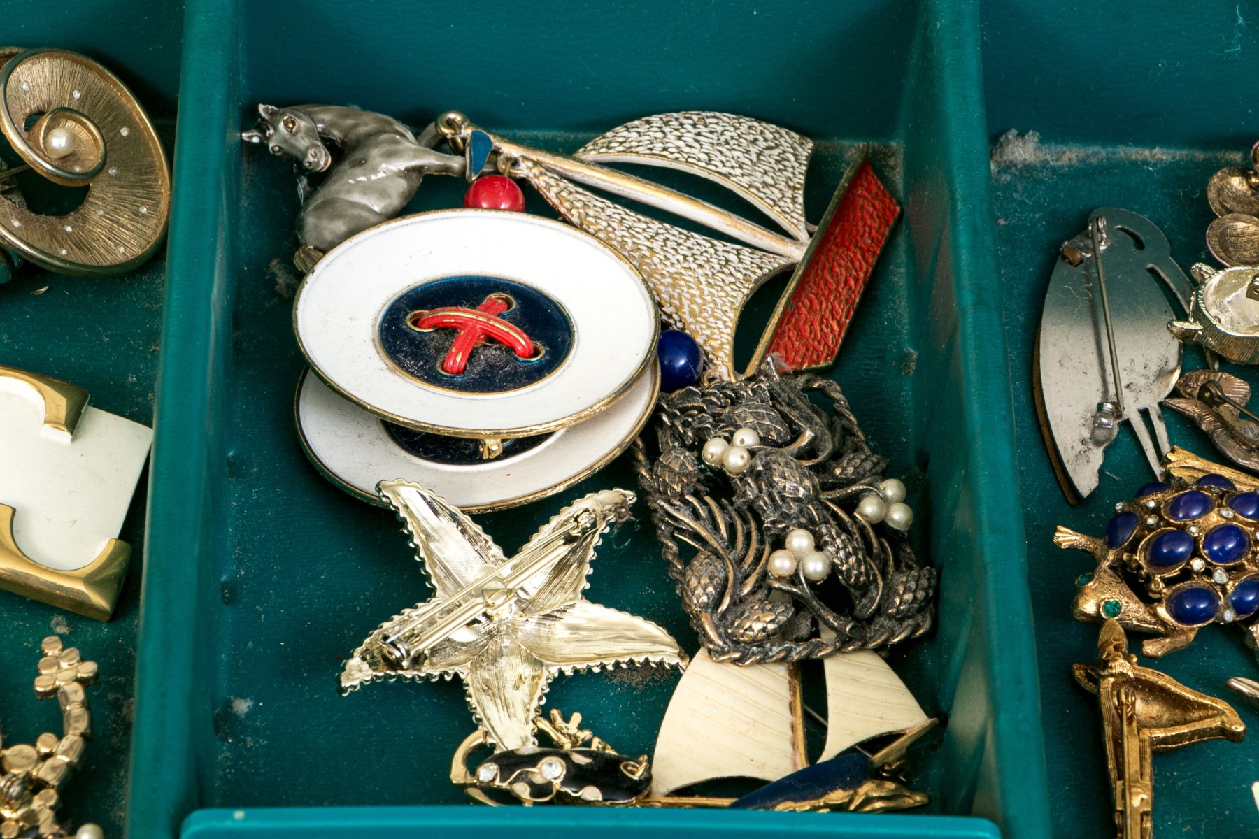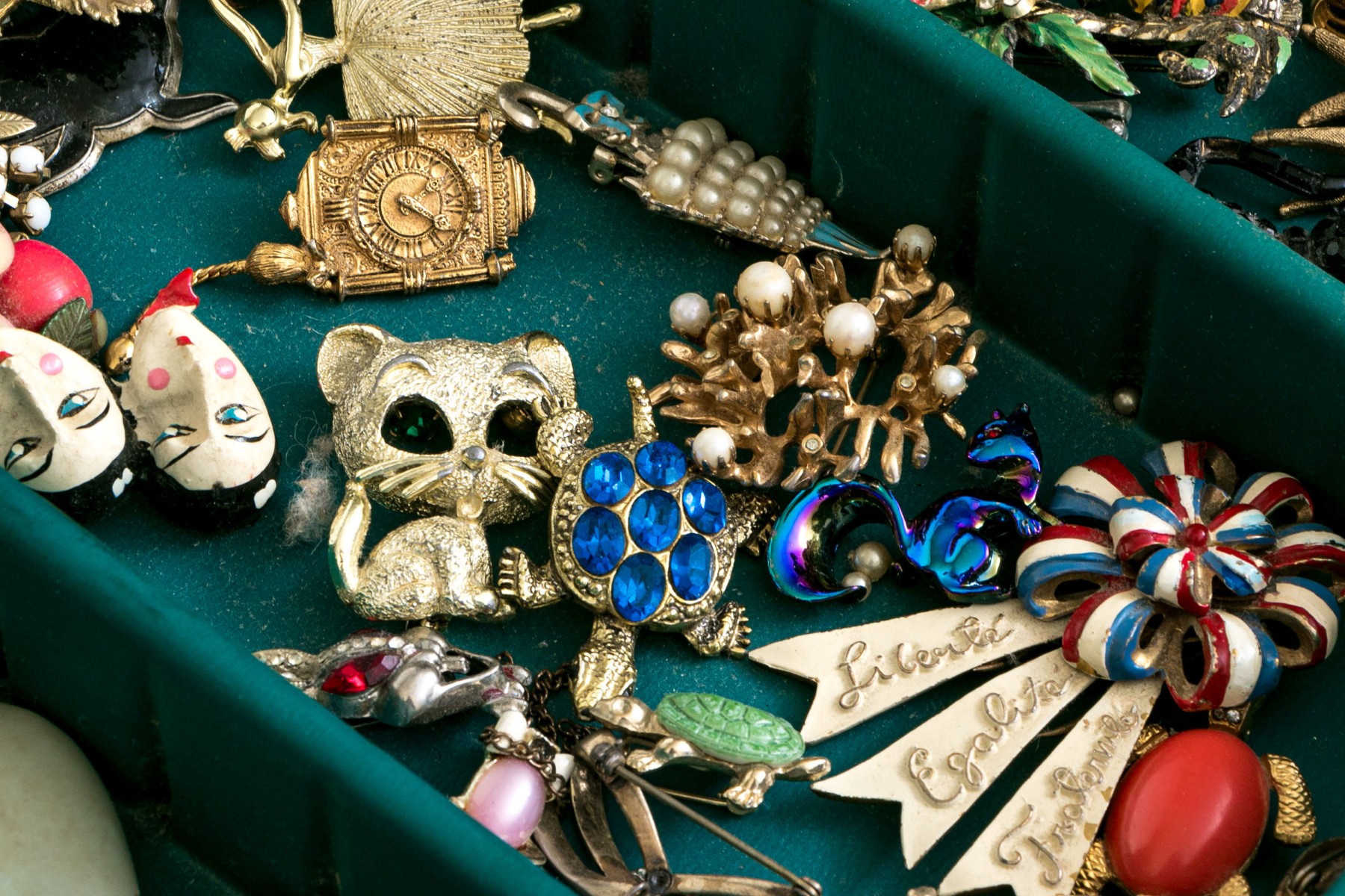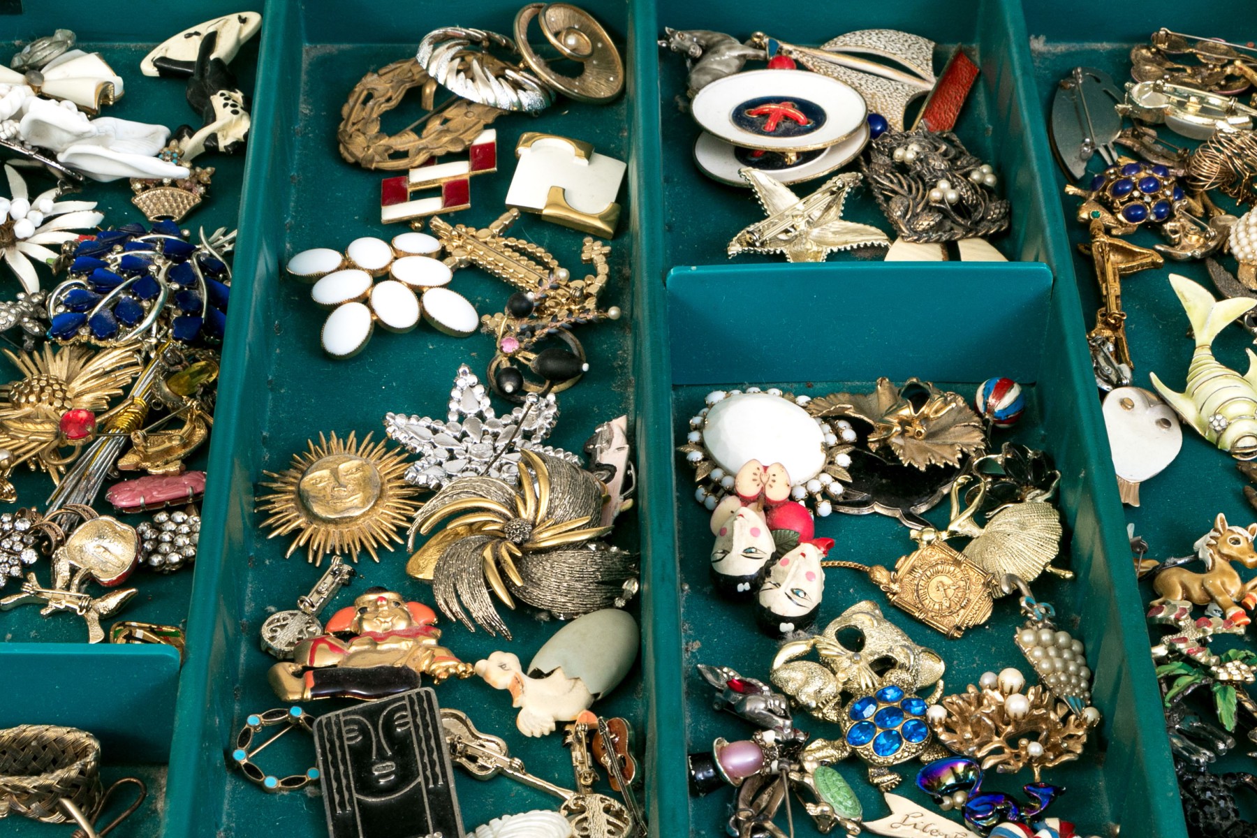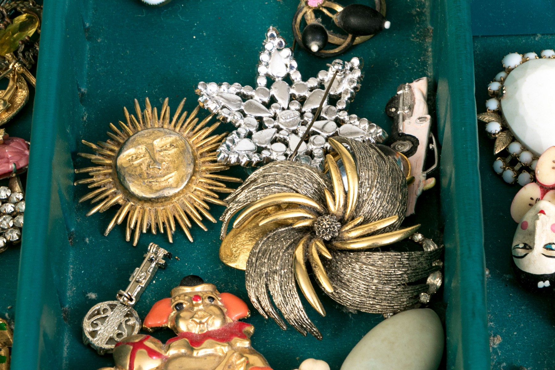 Approximately 75 brooches and earrings. Dimensions: 2 3/4” L, largest