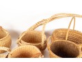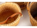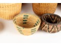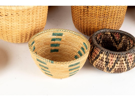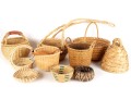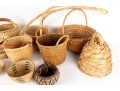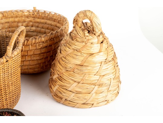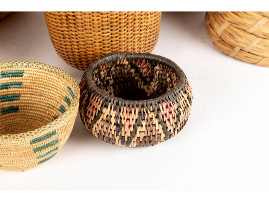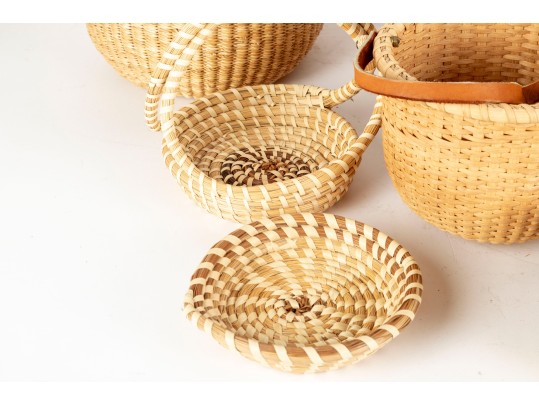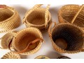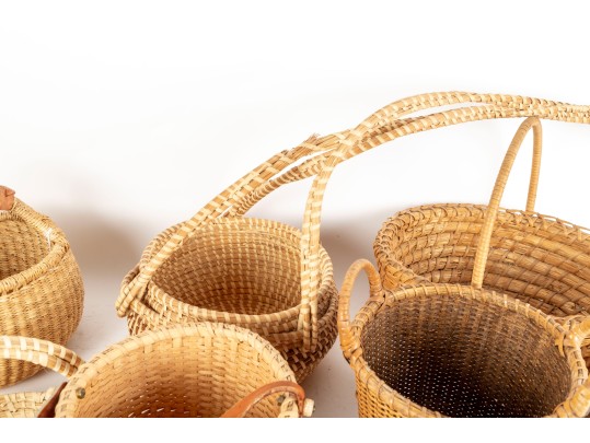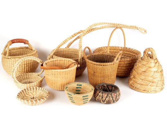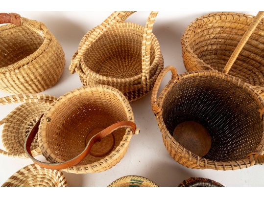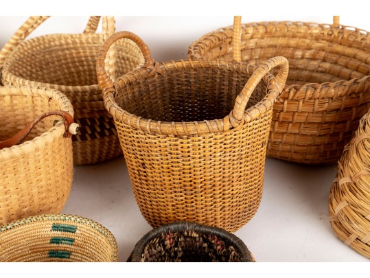 Set of ten handmade wicker and seagrass baskets in various shapes and sizes -- all small. Many feature loop or swing handles. A mix of open and lidded forms ideal for storage or display. Natural finish throughout.