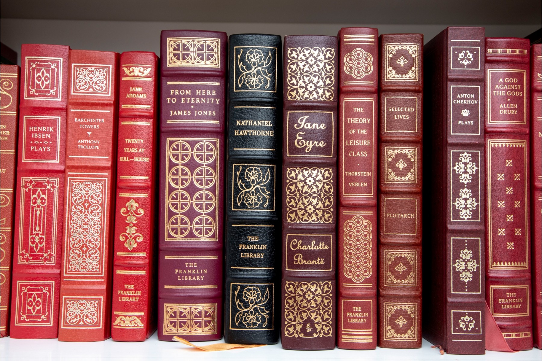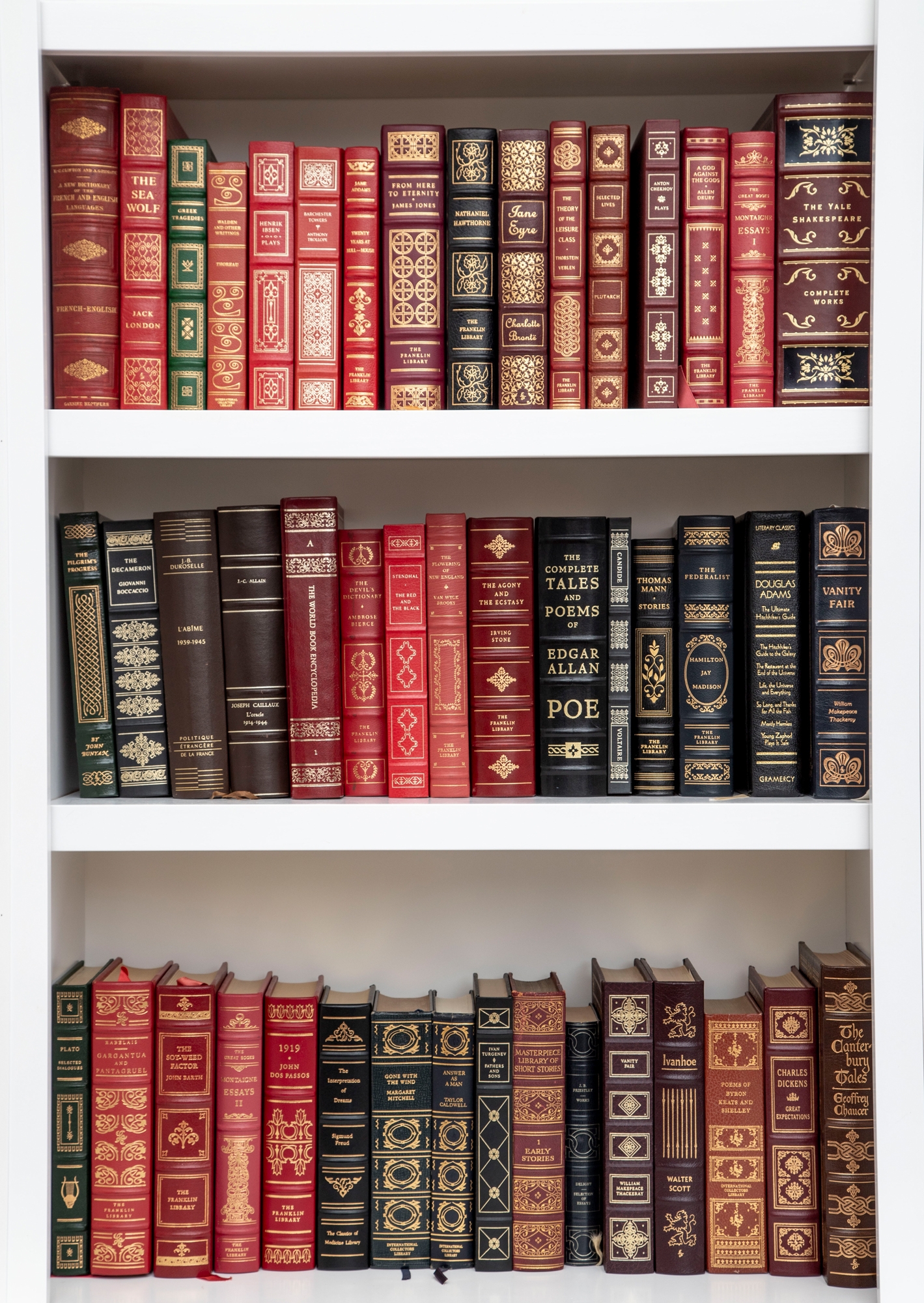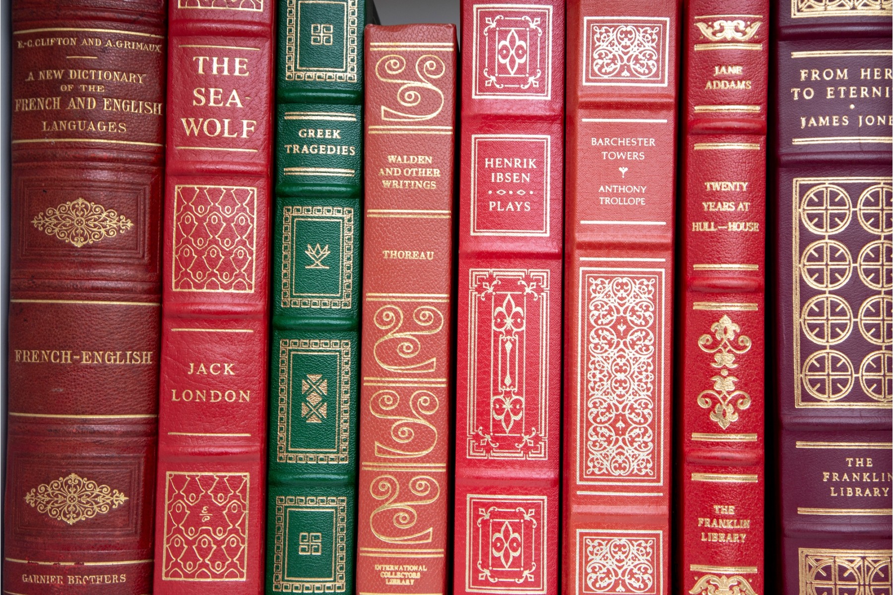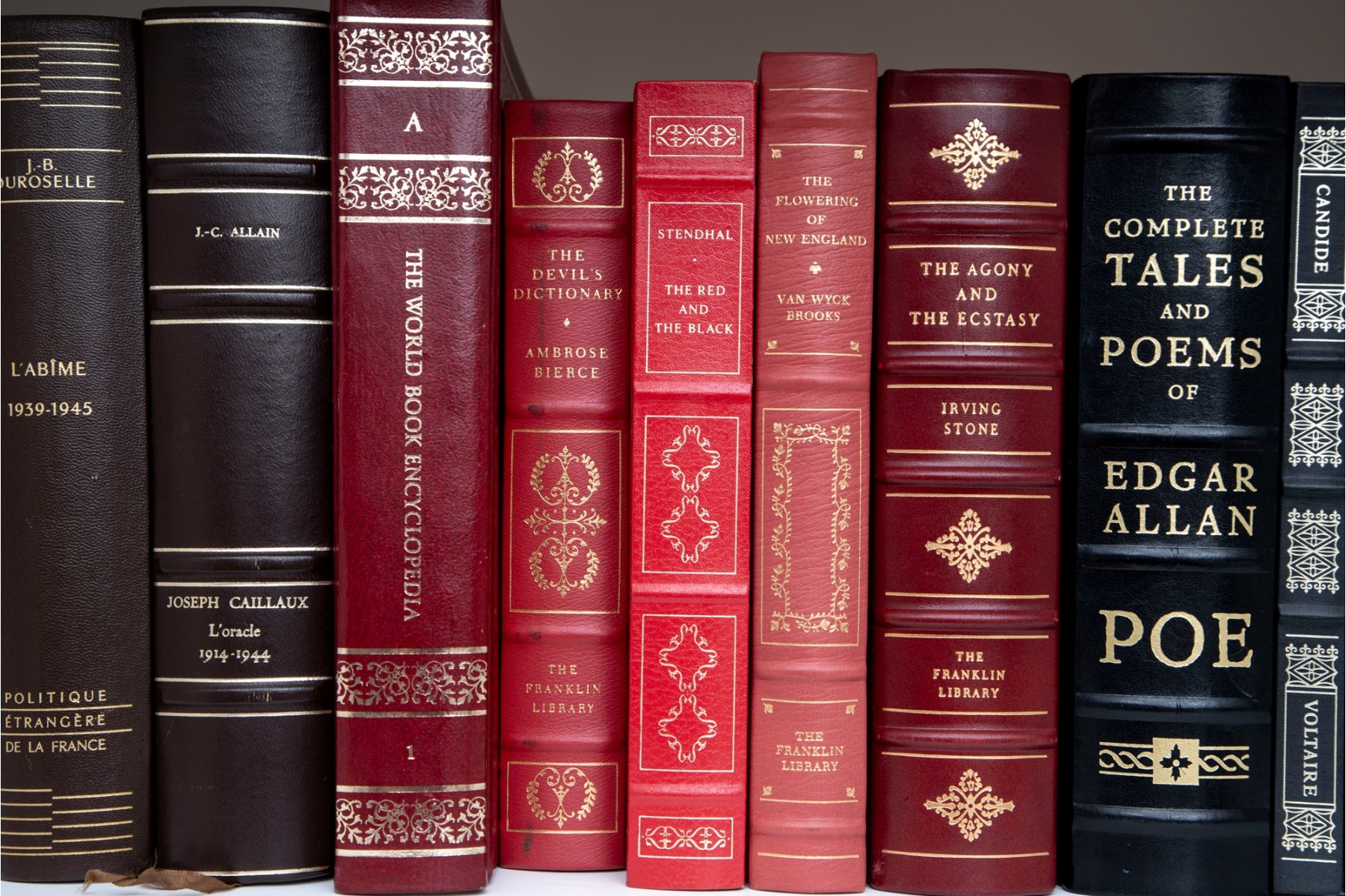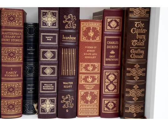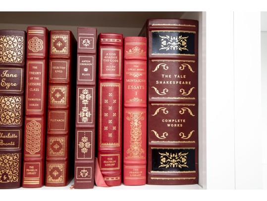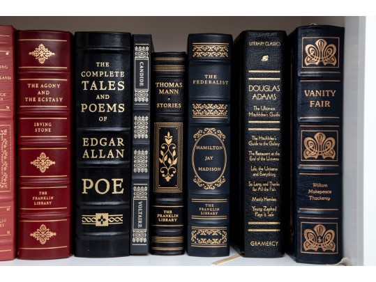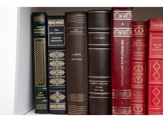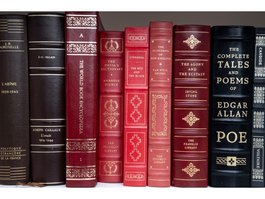 An amazing variety of quality leather bound books with examples such as; The World Book Encyclopedia, The Sea Wolf, Edgar Ellen Poe, Greek Tragedies, etc -- see photos for details.