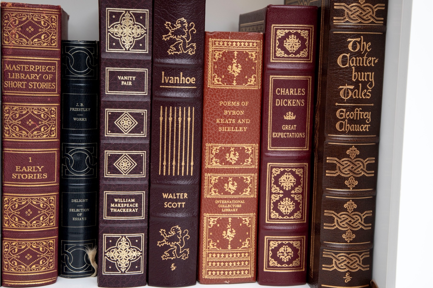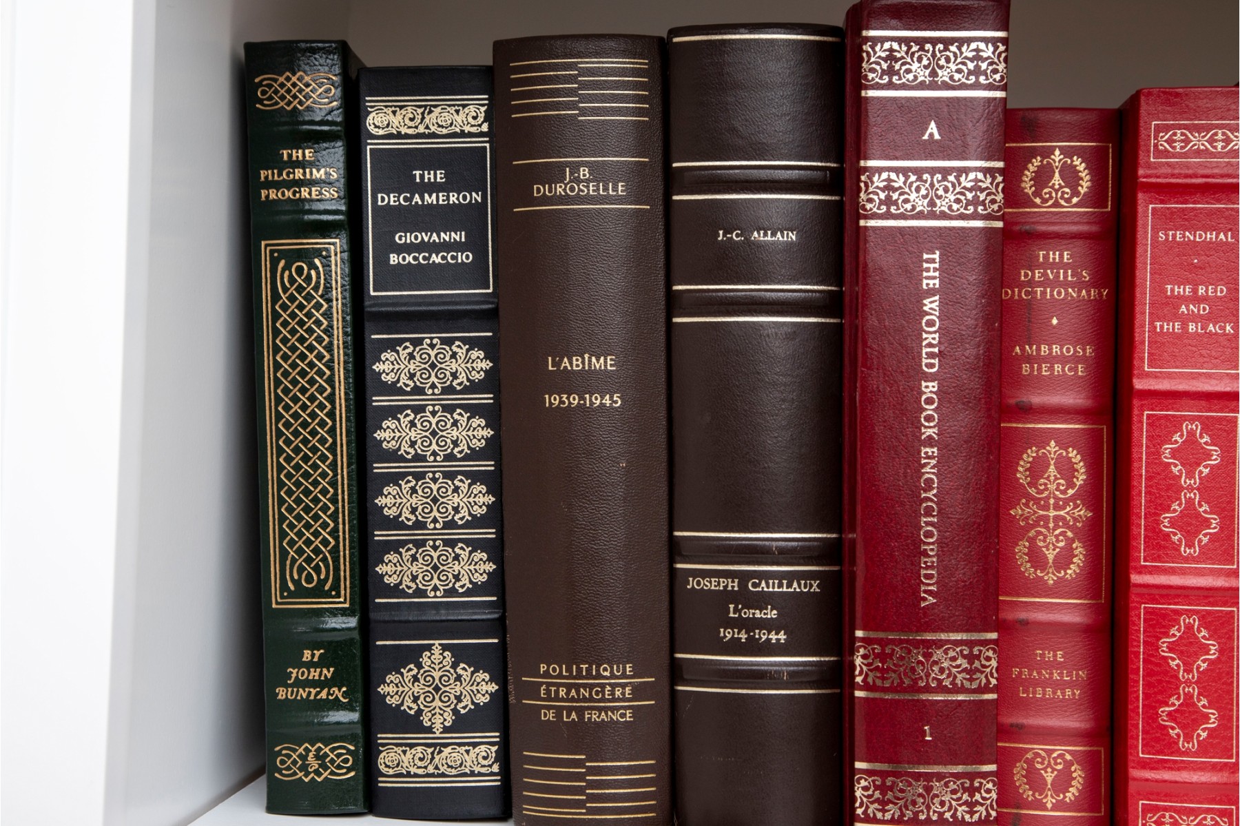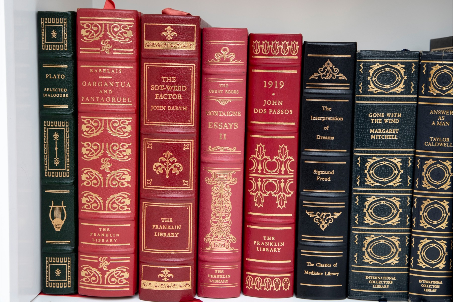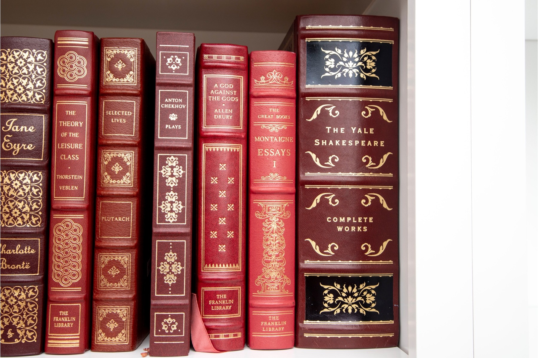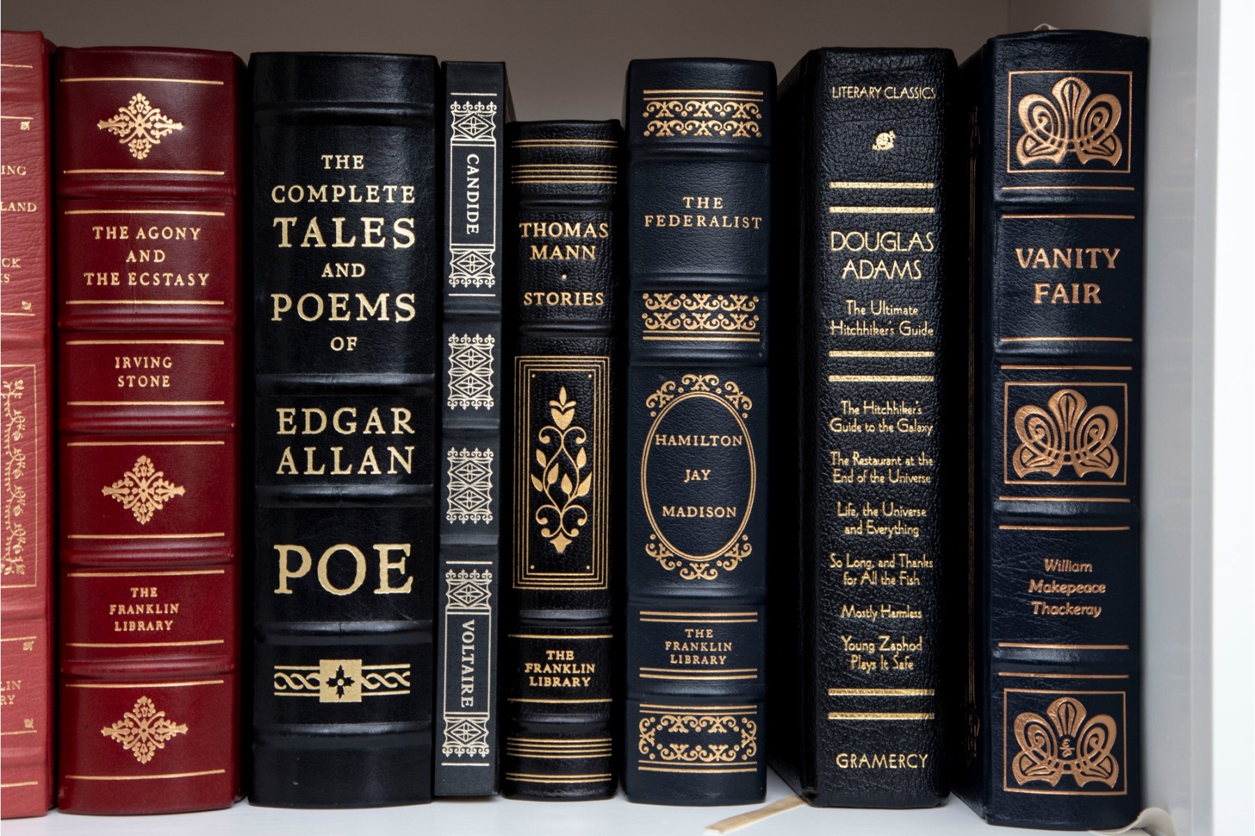 An amazing variety of quality leather bound books with examples such as; The World Book Encyclopedia, The Sea Wolf, Edgar Ellen Poe, Greek Tragedies, etc -- see photos for details.
