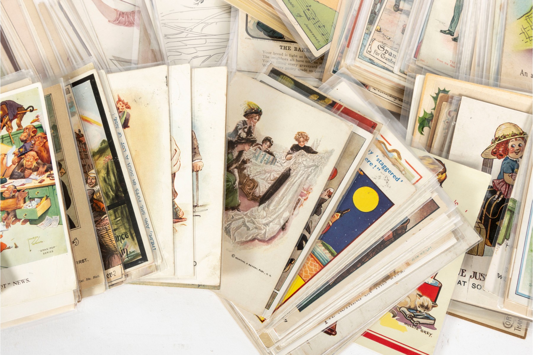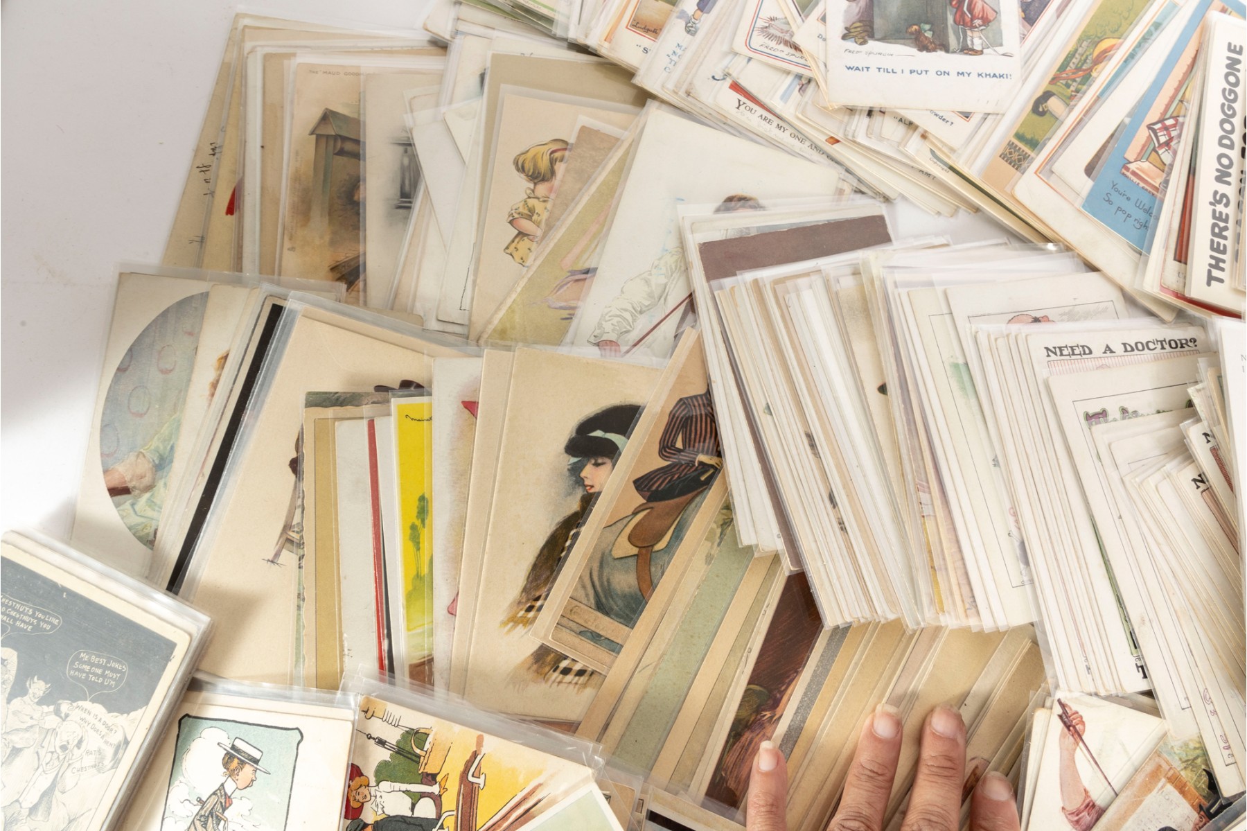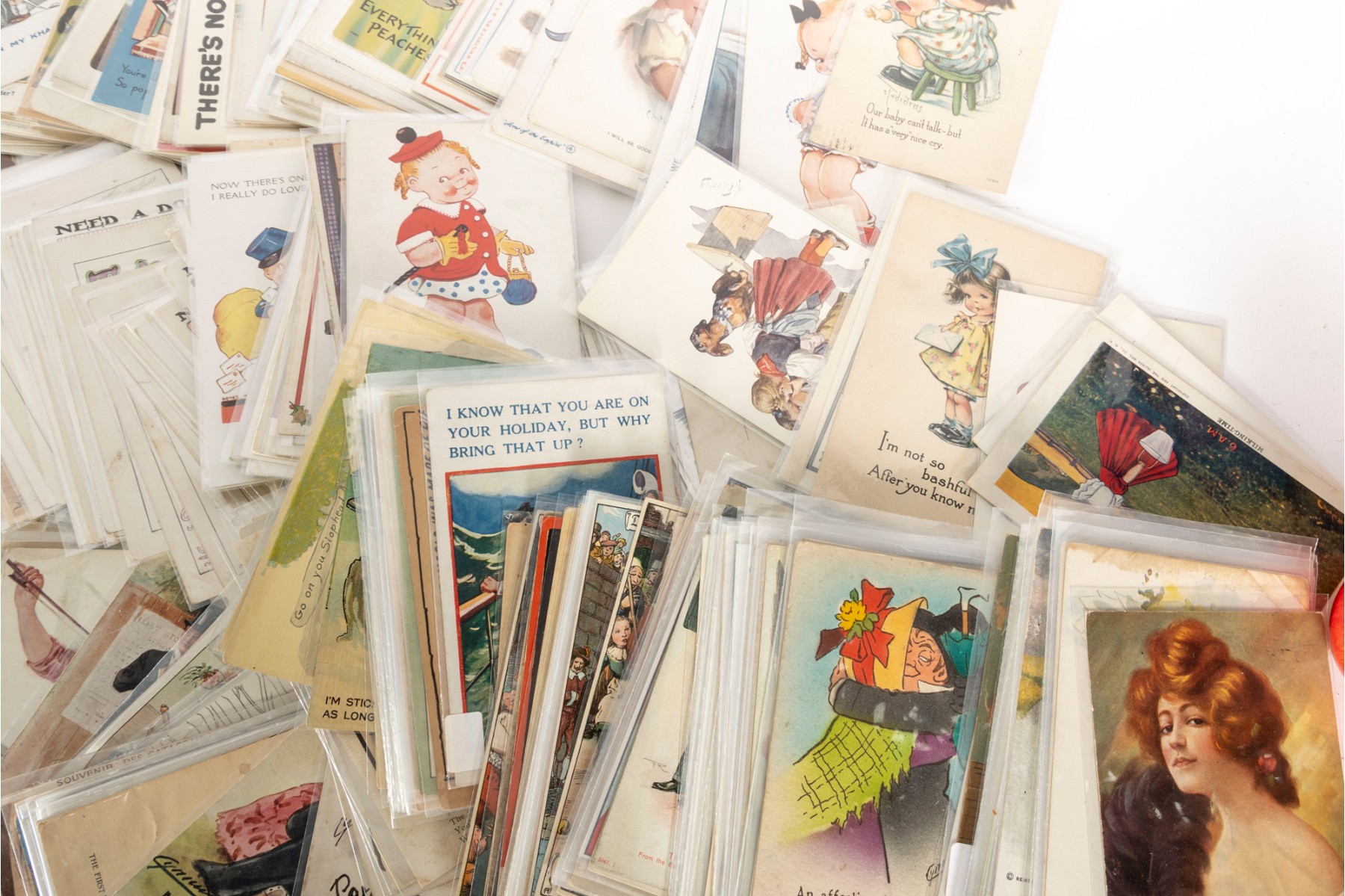 A vast collection of vintage illustrated port cards -- many of which have been used/written in graphite. Please refer to photos for details. All postcards are contained in protective sleeves.