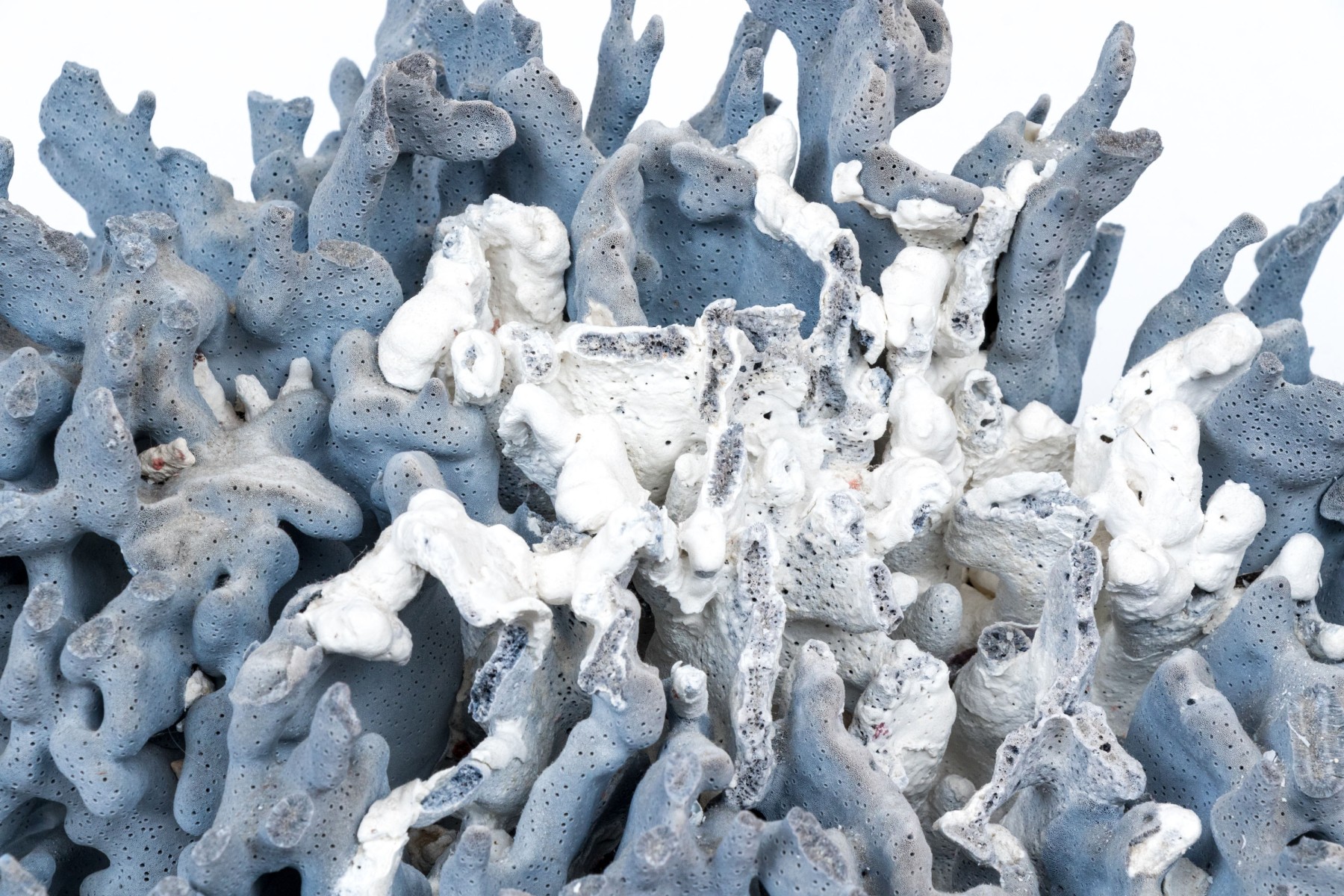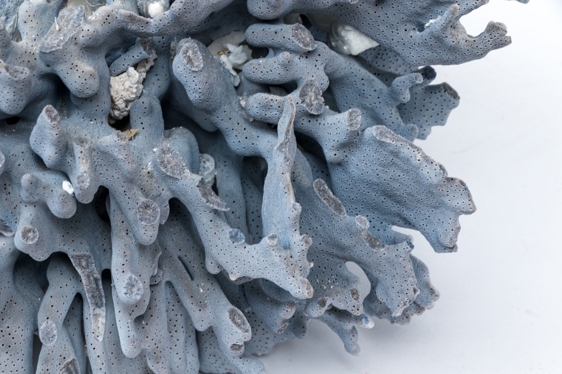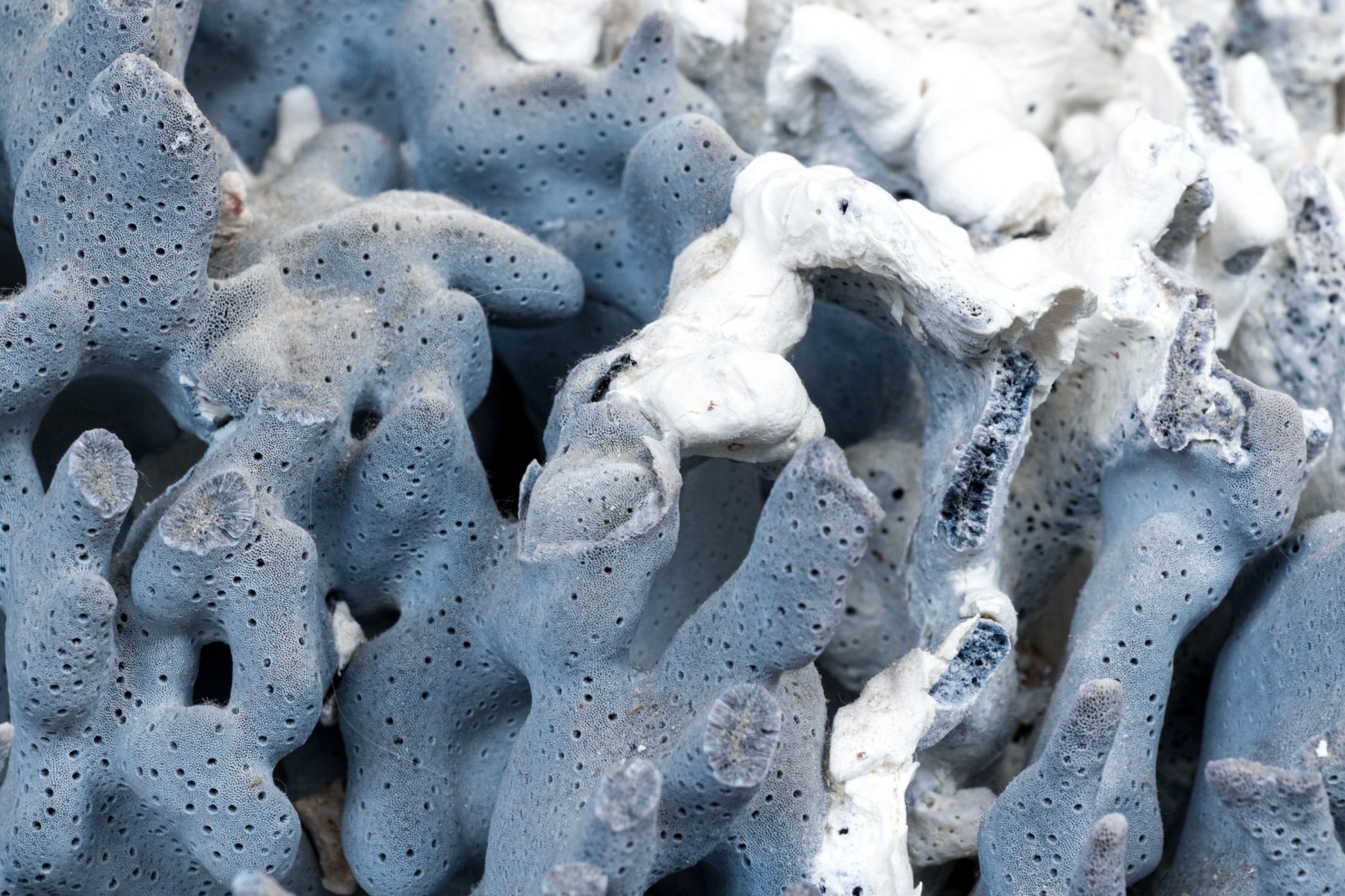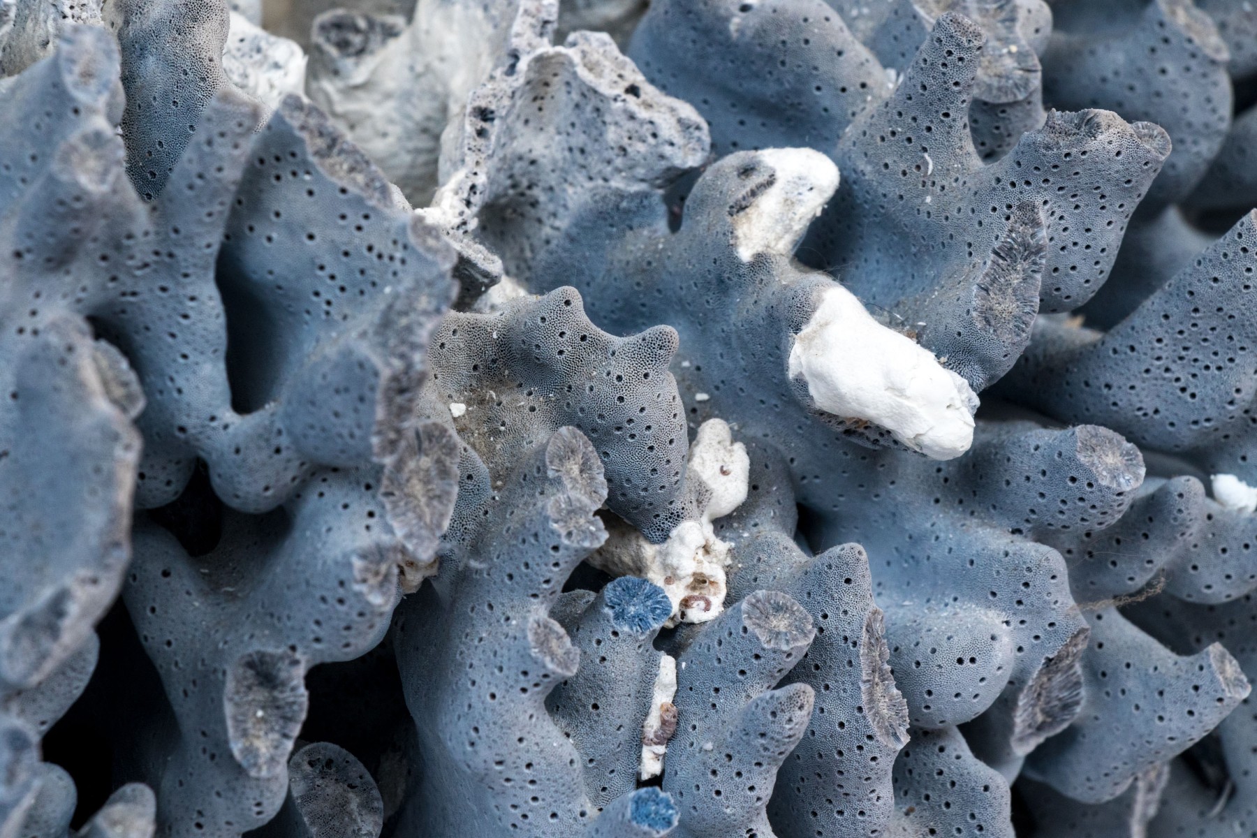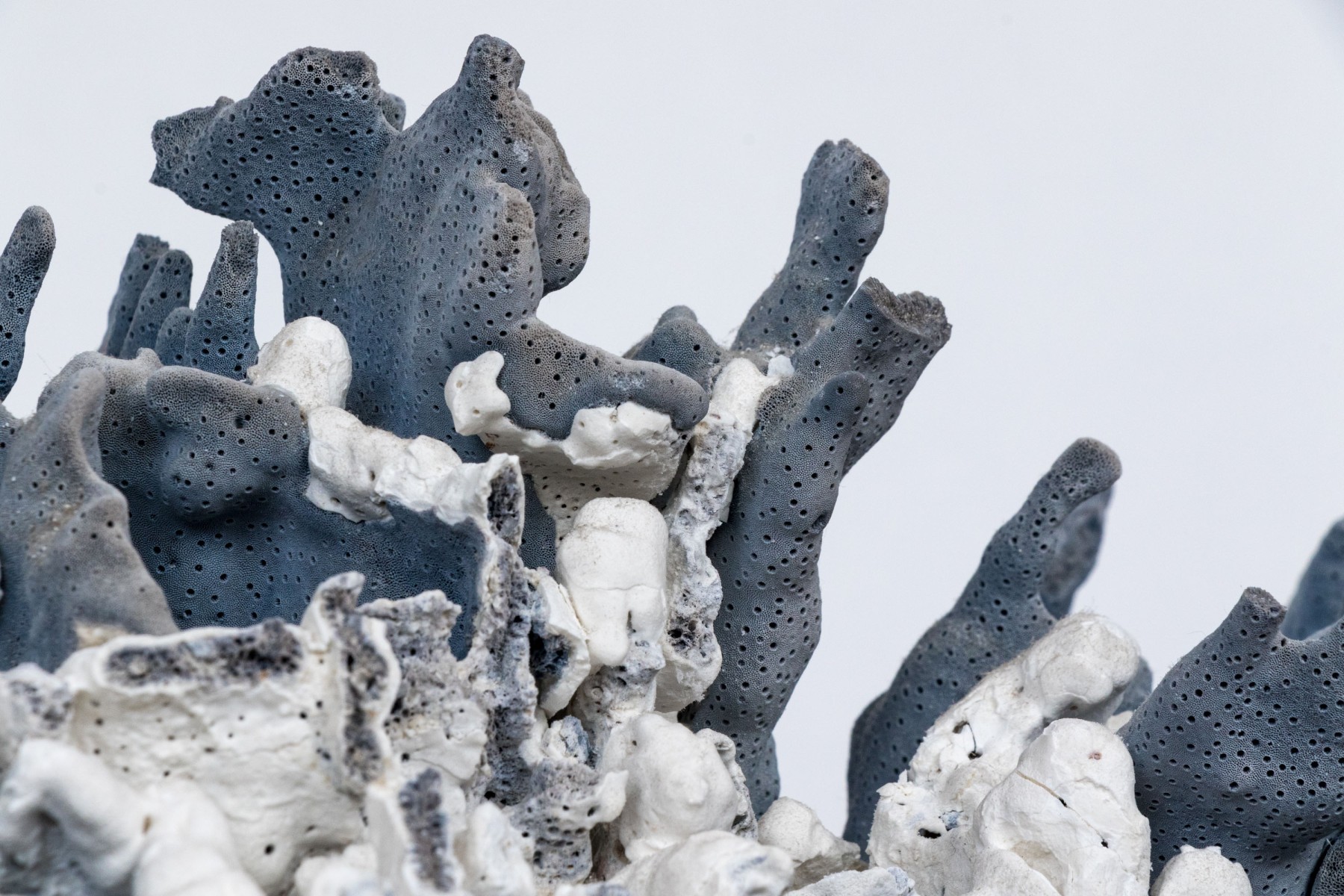 A stunning and large coral specimen with a slate grey hued body detailed by white and green sections sporadically growing through the coral.
