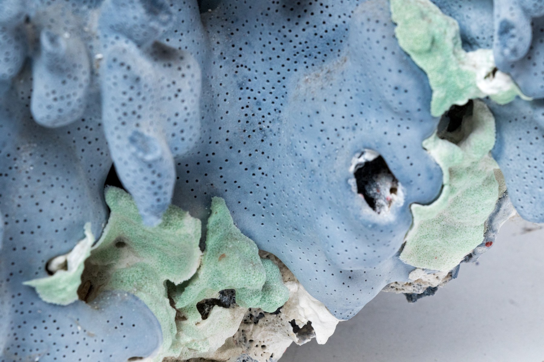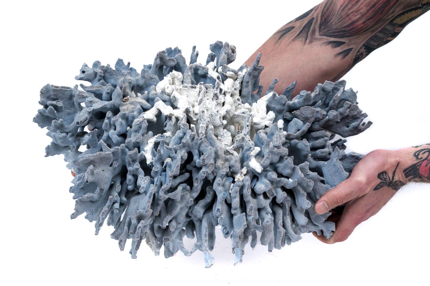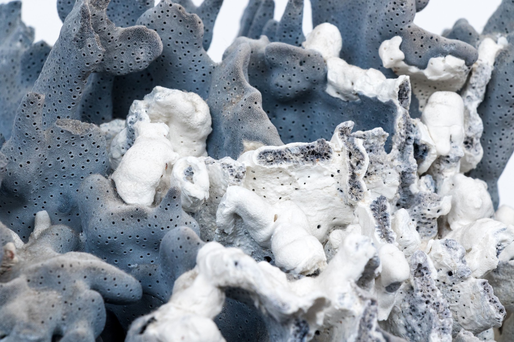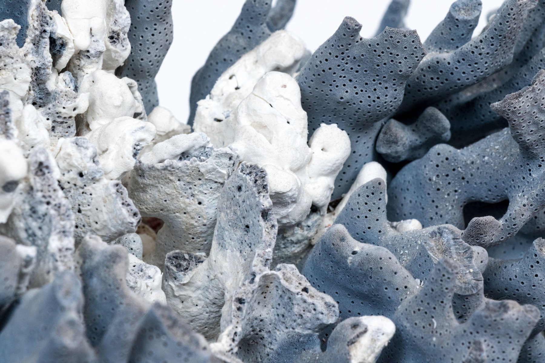 A stunning and large coral specimen with a slate grey hued body detailed by white and green sections sporadically growing through the coral.