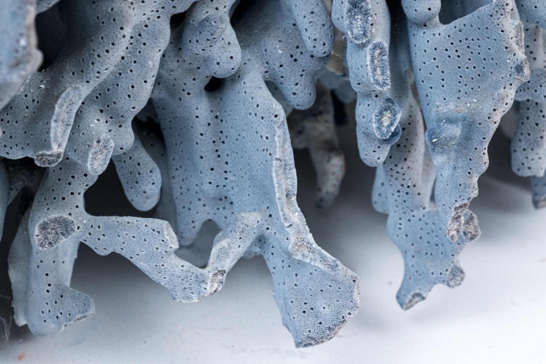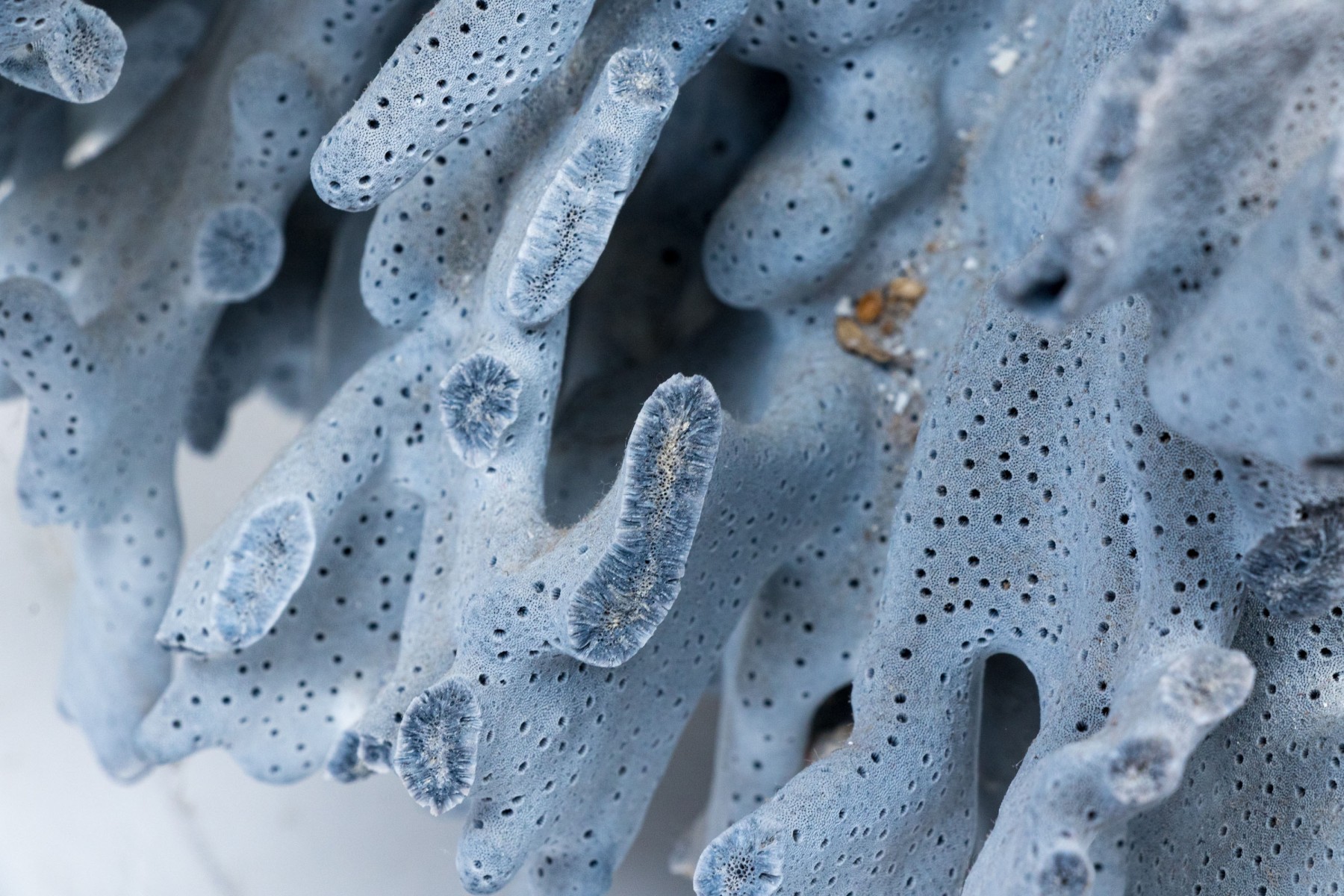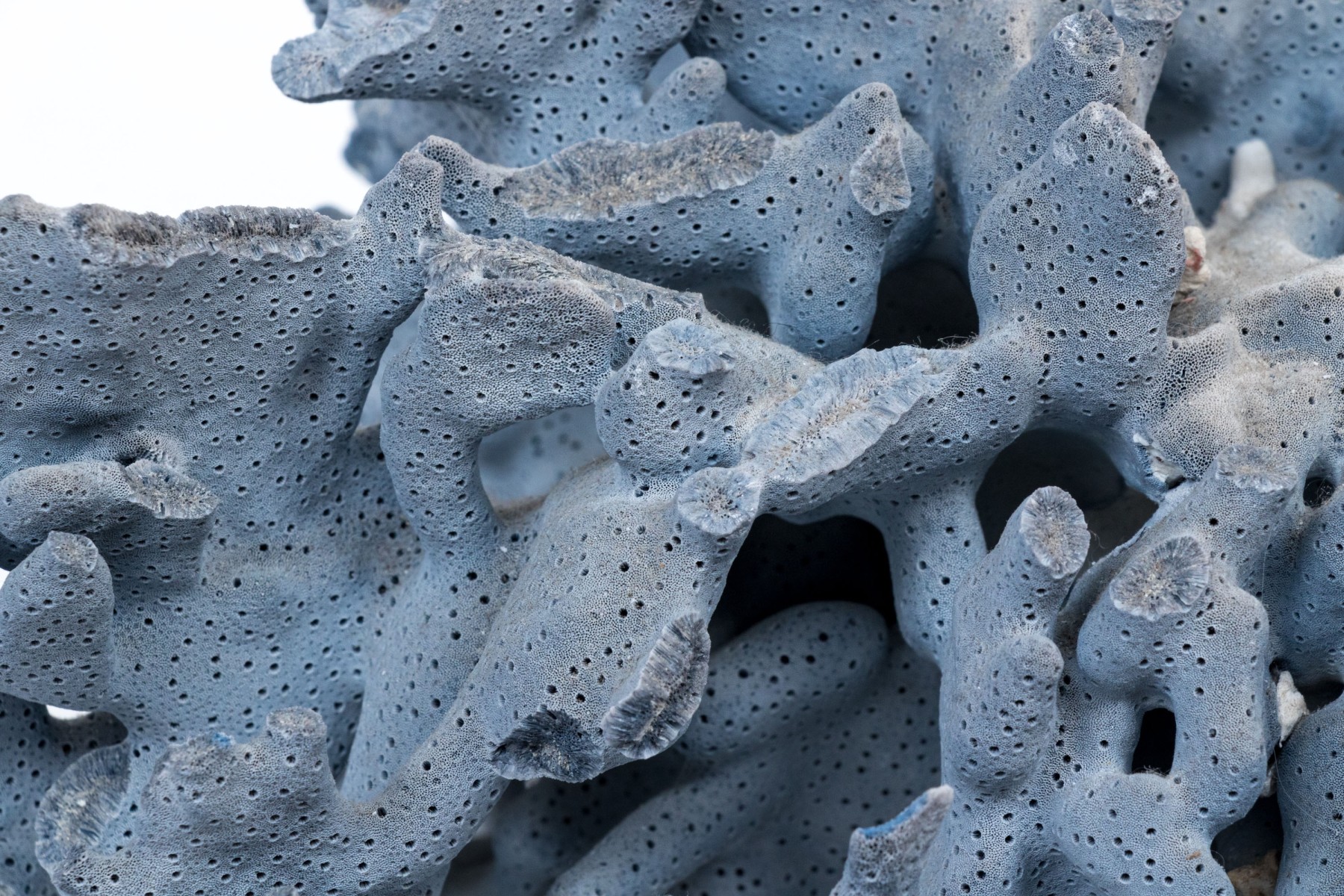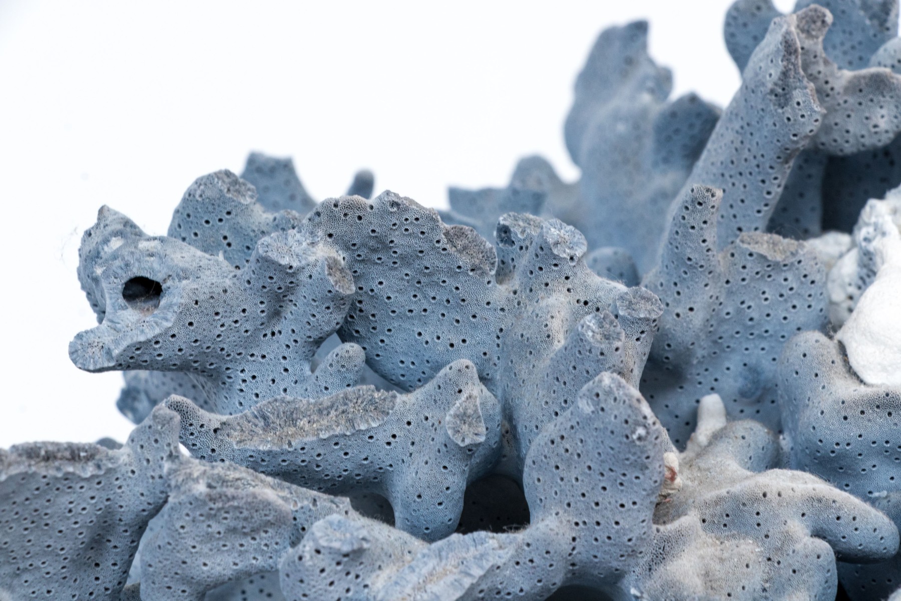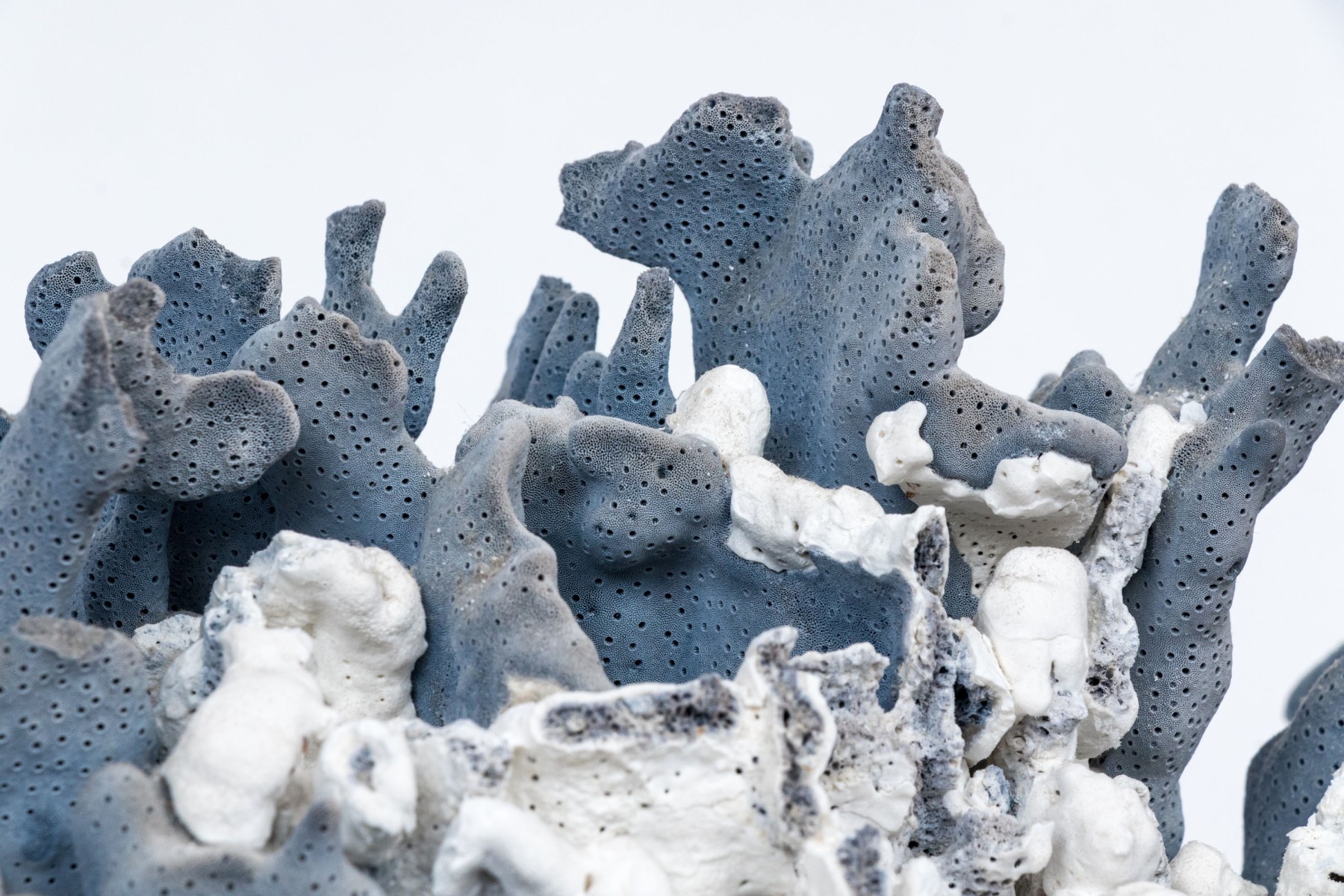 A stunning and large coral specimen with a slate grey hued body detailed by white and green sections sporadically growing through the coral.