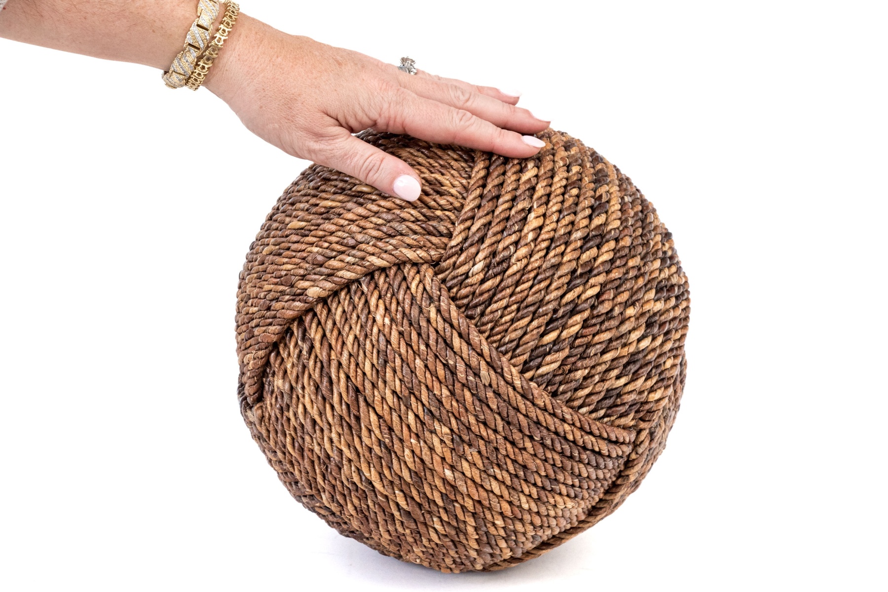 A fantastic large decorative nautical 10 1/2" rope bound "monkey fist". The "monkey fist" is a knot that was primarily used by sailors as a weight which would have had a lead rope, with the added weight the rope would be easier to throw.