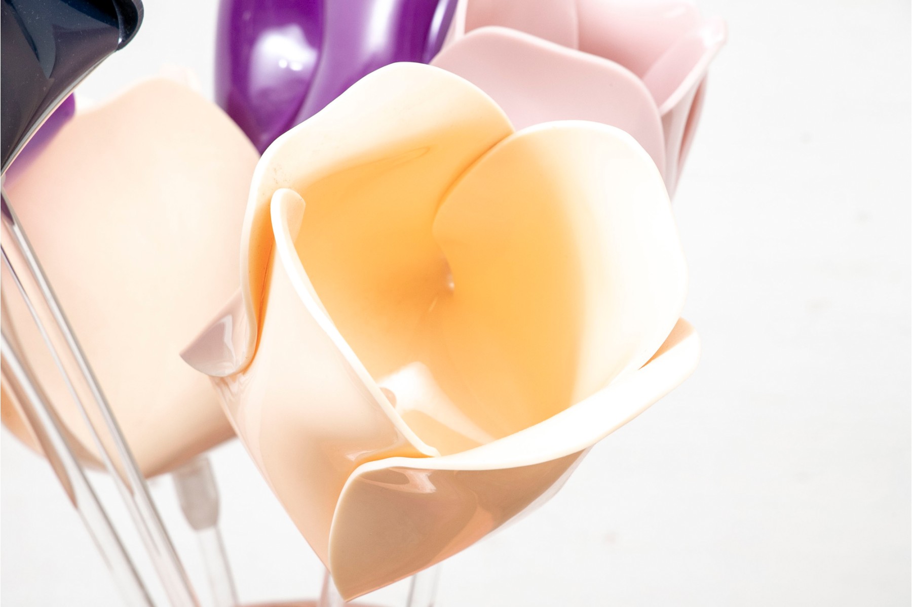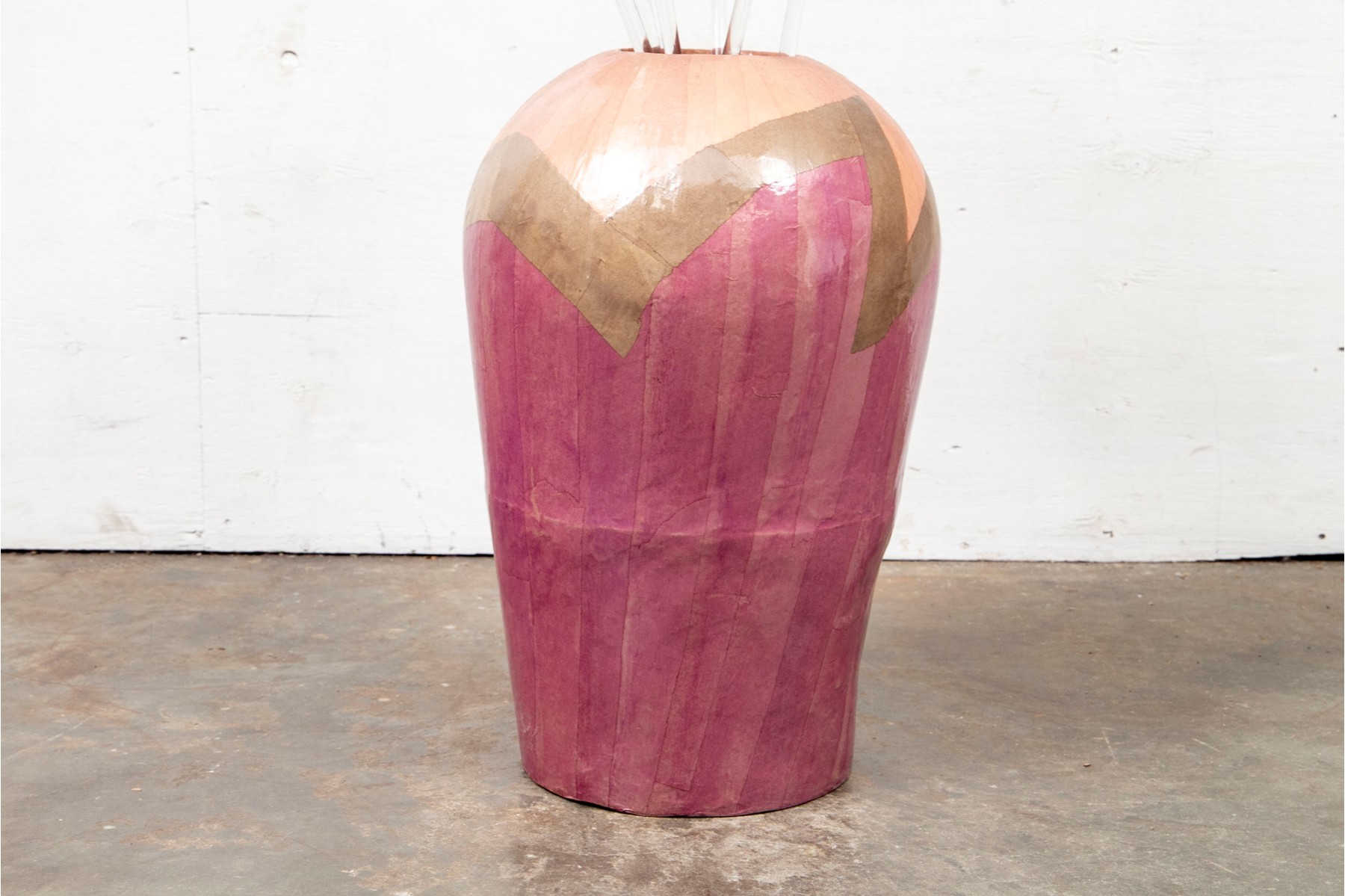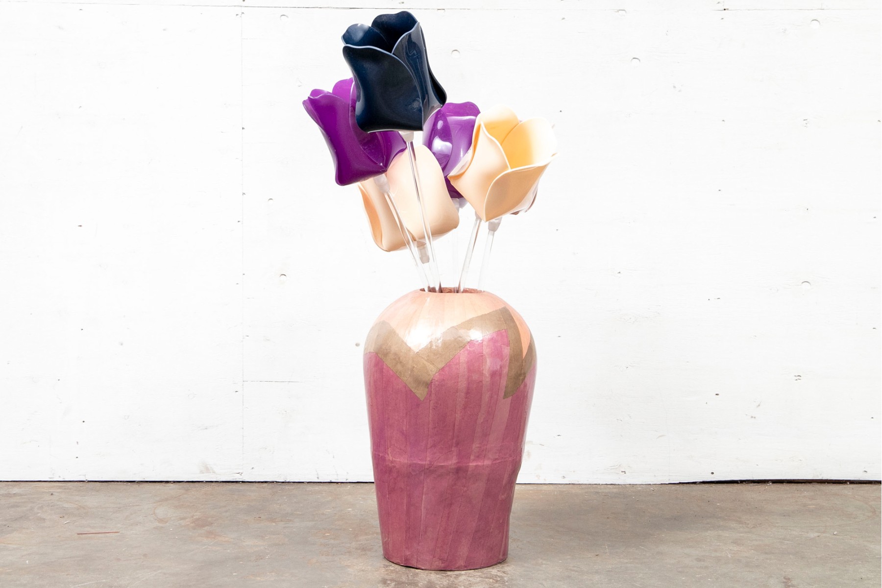 A tall wooden vase covered with shiny strips of paper in pink, peach and olive green tones. Six tall plastic tulips in peach, pink, purple and black fill the vase. Along with two plain plastic rods.