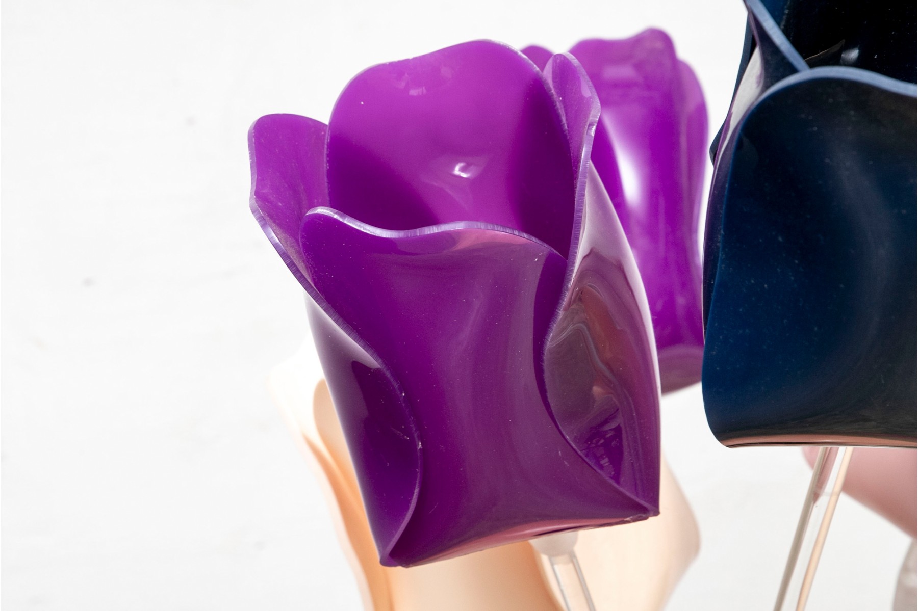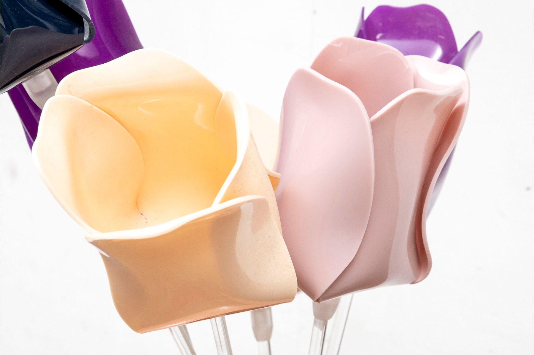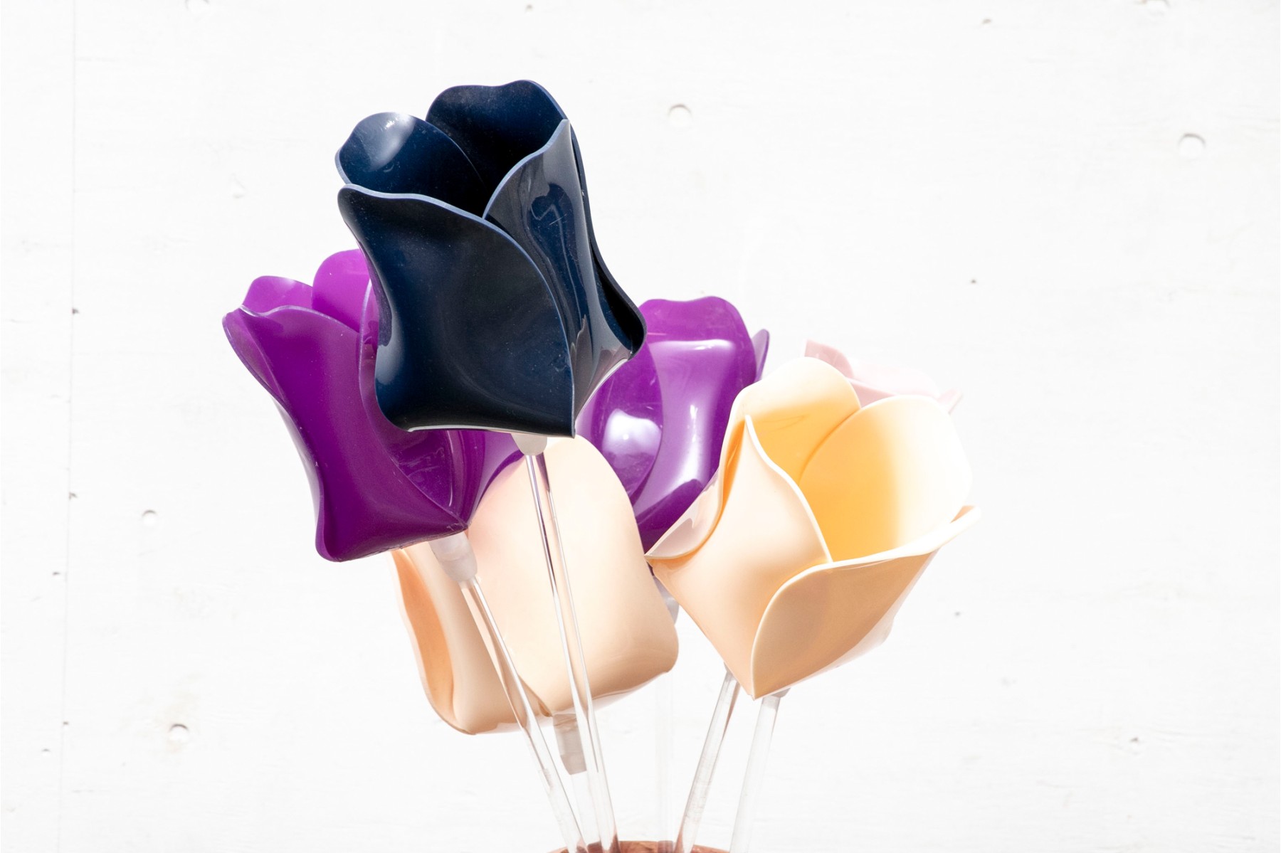 A tall wooden vase covered with shiny strips of paper in pink, peach and olive green tones. Six tall plastic tulips in peach, pink, purple and black fill the vase. Along with two plain plastic rods.