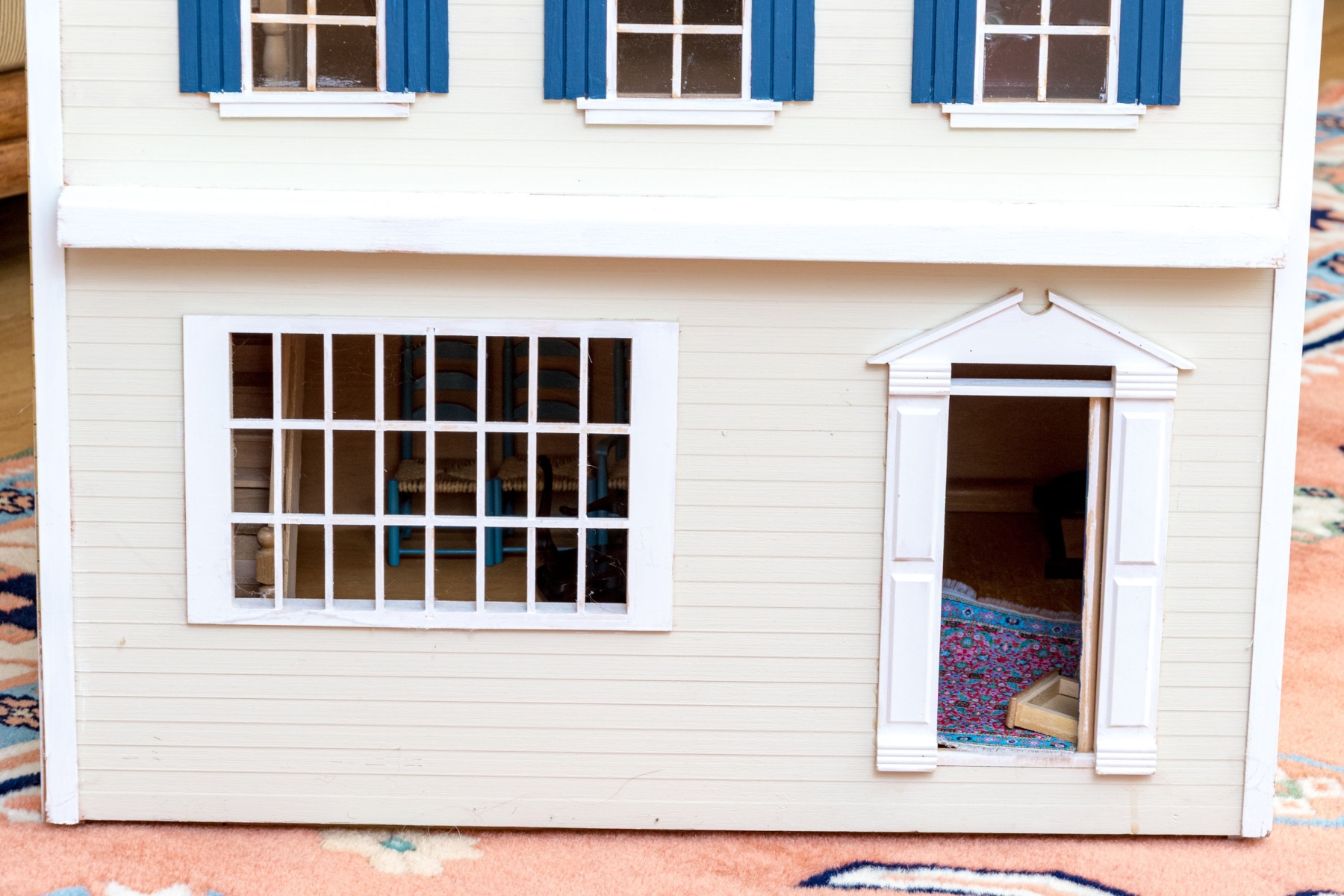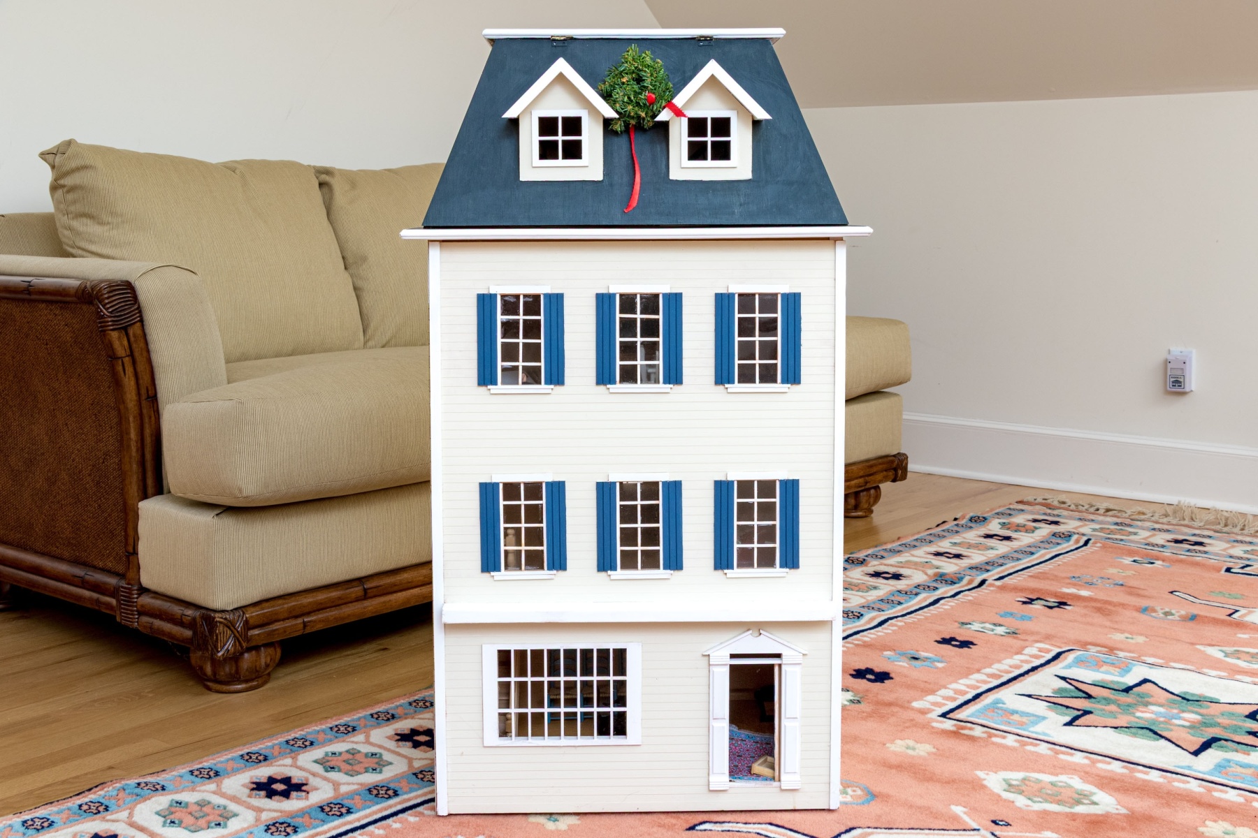 A fabulous and large four storey wood dollhouse with a hinged roof opening to the attic and the front facade of the house opening to three floors below. The house features a Georgian design with a blue mansard roof with two dormers and a cream white facade of six upper windows with blue shutters, finishing with a large single window and an offset doorway on the ground floor. Includes a fabulous collection of dollhouse furniture with French country, Georgian, and Queen Anne aesthetics.
